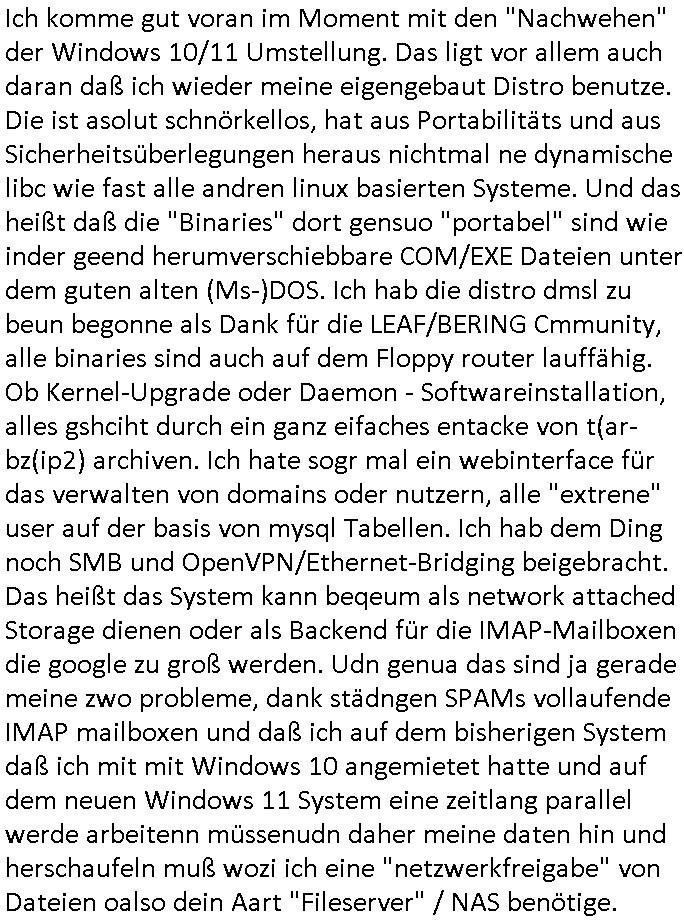 Ich komme gut voran im Moment mit den "Nachwehen" der Windows 10/11 Umstellung. Das ligt vor allem auch daran daß ich wieder meine eigengebaut Distro benutze. Die ist asolut schnörkellos, hat aus Portabilitäts und aus Sicherheitsüberlegungen heraus nichtmal ne dynamische libc wie fast alle andren linux basierten Systeme. Und das heißt daß die "Binaries" dort gensuo "portabel" sind wie inder geend herumverschiebbare COM/EXE Dateien unter dem guten alten (Ms-)DOS. Ich hab die distro dmsl zu beun begonne als Dank für die LEAF/BERING Cmmunity, alle binaries sind auch auf dem Floppy router lauffähig. Ob Kernel-Upgrade oder Daemon - Softwareinstallation, alles gshciht durch ein ganz eifaches entacke von t(ar-bz(ip2) archiven. Ich hate sogr mal ein webinterface für das verwalten von domains oder nutzern, alle "extrene" user auf der basis von mysql Tabellen. Ich hab dem Ding noch SMB und OpenVPN/Ethernet-Bridging beigebracht. Das heißt das System kann beqeum als network attached Storage dienen oder als Backend für die IMAP-Mailboxen die google zu groß werden. Udn genua das sind ja gerade meine zwo probleme, dank städngen SPAMs vollaufende IMAP mailboxen und daß ich auf dem bisherigen System daß ich mit mit Windows 10 angemietet hatte und auf dem neuen Windows 11 System eine zeitlang parallel werde arbeitenn müssenudn daher meine daten hin und herschaufeln muß wozi ich eine "netzwerkfreigabe" von Dateien oalso dein Aart "Fileserver" / NAS benötige.