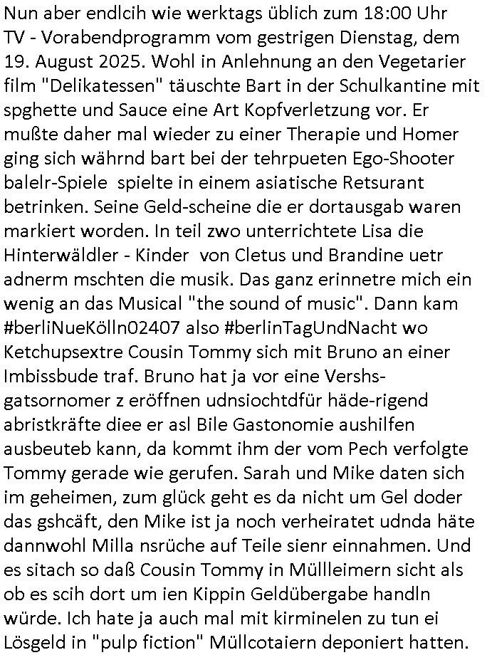 Nun aber endlcih wie werktags üblich zum 18:00 Uhr TV - Vorabendprogramm vom gestrigen Dienstag, dem 19. August 2025. Wohl in Anlehnung an den Vegetarier film "Delikatessen" täuschte Bart in der Schulkantine mit spghette und Sauce eine Art Kopfverletzung vor. Er mußte daher mal wieder zu einer Therapie und Homer ging sich währnd bart bei der tehrpueten Ego-Shooter balelr-Spiele spielte in einem asiatische Retsurant betrinken. Seine Geld-scheine die er dortausgab waren markiert worden. In teil zwo unterrichtete Lisa die Hinterwäldler - Kinder von Cletus und Brandine uetr adnerm mschten die musik. Das ganz erinnetre mich ein wenig an das Musical "the sound of music". Dann kam #berliNueKölln02407 also #berlinTagUndNacht wo Ketchupsextre Cousin Tommy sich mit Bruno an einer Imbissbude traf. Bruno hat ja vor eine Vershs-gatsornomer z eröffnen udnsiochtdfür häde-rigend abristkräfte diee er asl Bile Gastonomie aushilfen ausbeuteb kann, da kommt ihm der vom Pech verfolgte Tommy gerade wie gerufen. Sarah und Mike daten sich im geheimen, zum glück geht es da nicht um Gel doder das gshcäft, den Mike ist ja noch verheiratet udnda häte dannwohl Milla nsrüche auf Teile sienr einnahmen. Und es sitach so daß Cousin Tommy in Müllleimern sicht als ob es scih dort um ien Kippin Geldübergabe handln würde. Ich hate ja auch mal mit kirminelen zu tun ei Lösgeld in "pulp fiction" Müllcotaiern deponiert hatten.