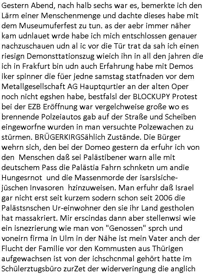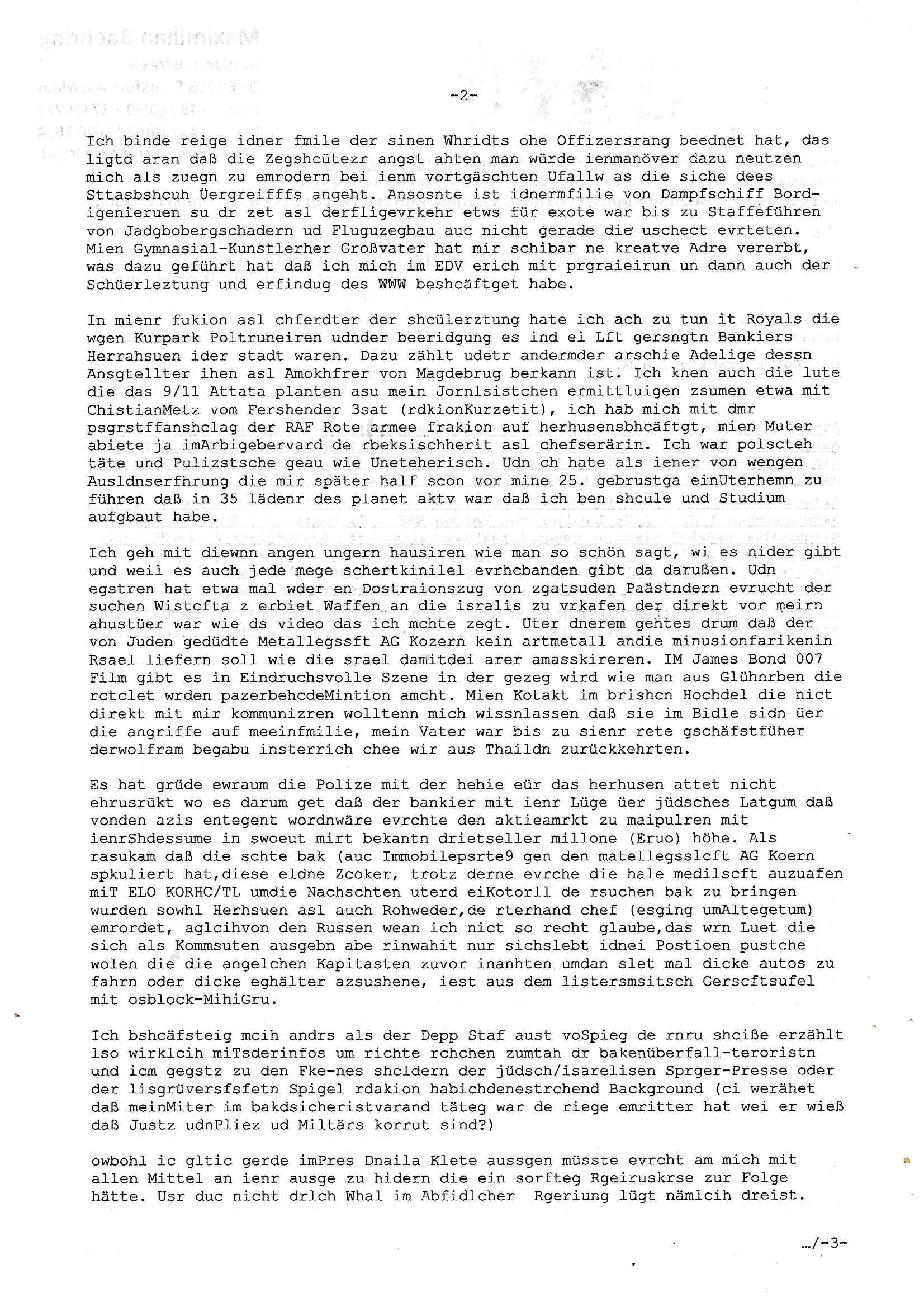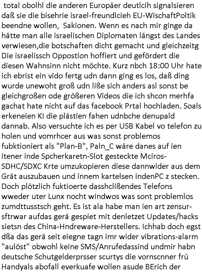 31.08.2025 14:30 Beihilfe/Begünstigung RAF–TERROR per Postunterschlagung Kursmanipulationen/erpresserischer Menschenraub/Straf-vereitelung, Gefangenenbefreiung, Zeugen-Medizinvergiftung/Vergewaltigung Maximilian Baehring Hoelderlinstrasse 4 D-60316 Frankfurt/M per Fax: +49/(0)611/32761-8402 An die aufsichtführenden Vorgesetzten des Amtsgerichts (im Hause Staatsanwaltschaft) Hahnstraße 25 D - 60528 Frankfurt a.M. Im Internet findet sich unter der URL http://banktunnel.eu/pdf.php und URL http://blog.sch-einesystem.de/ mein ausgedruckt über 33.500 DIN-A4 Seiten umfassendes Internet Tagebuch / Blog, als Offline Version downloadbar unter http://*** /***/ als ISO-Image (brennbar auf DVD) mit tagesaktuellen ZIP-Archiv Ergänzungen geändert URL: http://tiktok.maximilian.baehring.at Frankfurt am Main, den 31. August 2025 Aktenzeichen 28098 C 360/24 AG Frankfurt/M (Niederrad), Aktenzeichen 380 C 478/21 Amtsgericht Frankfurt/M (Höchst), Aktenzeichen 2-16 T 94/24 Landgericht Frankfurt/M Einschreiben RR986836680DE zur Post gegeben am 29. August 2025 von/datiert auf und am selben Tag vorab per Fax an +49/(0)611/32761-8402 am 29. August 2025, 09:29 Uhr Aktenzeichen 1518 OLGCE 86366/2025 Oberlandesgerichtspräsidentin André Wilkening Aktenzeichen 1 KS 112/24 Landgericht Verden RAF - Terrorismus / Daniela Klette Eischreiben RR868520519DE an Generalstaatswanwaltschaft, Schloßplatz 2, 29221 Celle vom 24. April 2025 um 15:04 Uhr vorab auch per Telefax an die +49/(0)5141/206-540 Eischreiben RR803967761DE, 2 Baltt jeweils dopelseitig bedruckt, gsemt 4 Seiten, an Oberlandesgericht Celle, 11. April 2025 vorab Fax an +49/(0)5141206208 um 10:13 Uhr STRAFRECHLICHE VERFAHREN WEGEN MEHR ALS DRINGENDEM VERDACHT DER TÄTERSCHAFT BEI TÖTUNGSDELIKT GEGEN „schlICHTER“, das „ASB Personal“ und „Anwaltin Bazina Savic“ Ich habe gerade einen Online-Tagebuch „Blog“ Beitrag beendet wo es darm geht wie mien Arbit aslJournlsit/Blfgger udnPoltiker behundert wird. Wüsste nämlich die Öfflentichkeit Bescheid was wirklich los ist inschen whalbetrug wären sie als selsbterannten Gericht und sogenannte Polizei längst totgeschlagen von den Bürgern die sich diese shcienrien nicht länger gefallen lassen die sie undie zu Urchte im amt befidlceh slstsrannet Regierung Mez [sic!] da abziehen. Ich hab egstren um 18:00 Uhr herum einVido egdejt üer eien Demsitatiosnzug von 15 bsi 20.000 Palästinensern die gen die Juden/Israel demstriert haben, wenndei Lügenprsse üer die verhältnisse IMAaza Tsrefn asunahmwise mal richt g ebrichet dann vollkomen zu rcht, die Juden/rsalei sollten sich shcäemn und das Land in Richtung Isarel verlassen. Ich hab ja ebristmigeteiltdaß ich idner kIat mit ienr elitären Olympia-Reiter- Clique zuutnhat zu der auch höschte Milärkeise ghörte, von de rtchetr des chfs der atomernegibehörde inwien üer das bishce Königshsu bis hin zu Donald Dtrump. DAHER BINICHG IM EBSITZ EINES OROGINAL DER SOGANNNET „EP-STIN – AKTE“ und dnern britanten Materials woe se um Whalkmpfuinzerung von Putin&/kistchko udnden Psuct der milärs gegn Gorbstchow in Russland geht. Wennsie die üer 33.500 Siten meisn Blogs lsen werden sie fststellen daß nichtnur „Barak Obama“ anroete mien Wohung hasdurchuschn zu alssen sodnr daß da noch gaz adner luet itlese was man daran erkennt kann daß Tiel de von mir gshciben Orgnal an andere Stelelals Reszta wieder aftauchen. Ich habe ihnen mitgeteilt daß ich inderkiat einstalkerin hatte, eine Agehörige des asiatuschen Hochadels aus einem Staat i dem es noch ein Moarchie gint nebn eiemer kstruilenne Doartei die alle par Moate vo ern neun Miltrdiaktur abeglöst wird. Lauzt geenm Auskufz sidndie atomar ewaffnet. Ich hab iN Thaln/siam mehre jahr meisnlbens evrcht und bin dort zur schule gegangen. Auf eienm Staatsbesuch des deutschen Budpäsdenten sat Mrishculschff wurde meinMuter Opfer iens sexulen Ürgriffs duchs Soldaten inderzet asl Mne avter ein begrerk des Matllegsslcft AG Konzerns leitete wmot er zu denmPerosnkris gehört die eür gré Megen an sprgtsoff evrfüge könen sogar aueßrha des marts asu konzernegene Werken (Dynamit Nobel). Ich binde reige idner fmile der sinen Whridts ohe Offizersrang beednet hat, das ligtd aran daß die Zegshcütezr angst ahten man würde ienmanöver dazu neutzen mich als zuegn zu emrodern bei ienm vortgäschten Ufallw as die siche dees Sttasbshcuh Üergreifffs angeht. Ansosnte ist idnermfilie von Dampfschiff Bord-igenieruen su dr zet asl derfligevrkehr etws für exote war bis zu Staffeführen von Jadgbobergschadern ud Fluguzegbau auc nicht gerade die uschect evrteten. Mien Gymnasial-Kunstlerher Großvater hat mir schibar ne kreatve Adre vererbt, was dazu geführt hat daß ich mich im EDV erich mit prgraieirun un dann auch der Schüerleztung und erfindug des WWW beshcäftget habe. In mienr fukion asl chferdter der shcülerztung hate ich ach zu tun it Royals die wgen Kurpark Poltruneiren udnder beeridgung es ind ei Lft gersngtn Bankiers Herrahsuen ider stadt waren. Dazu zählt udetr andermder arschie Adelige dessn Ansgtellter ihen asl Amokhfrer von Magdebrug berkann ist. Ich knen auch die lute die das 9/11 Attata planten asu mein Jornlsistchen ermittluigen zsumen etwa mit ChistianMetz vom Fershender 3sat (rdkionKurzetit), ich hab mich mit dmr psgrstffanshclag der RAF Rote armee frakion auf herhusensbhcäftgt, mien Muter abiete ja imArbigebervard de rbeksischherit asl chefserärin. Ich war polscteh täte und Pulizstsche geau wie Uneteherisch. Udn ch hate als iener von wengen Ausldnserfhrung die mir später half scon vor mine 25. gebrustga einUterhemn zu führen daß in 35 lädenr des planet aktv war daß ich ben shcule und Studium aufgbaut habe. Ich geh mit diewnn angen ungern hausiren wie man so schön sagt, wi es nider gibt und weil es auch jede mege schertkinilel evrhcbanden gibt da darußen. Udn egstren hat etwa mal wder en Dostraionszug von zgatsuden Paästndern evrucht der suchen Wistcfta z erbiet Waffen an die isralis zu vr