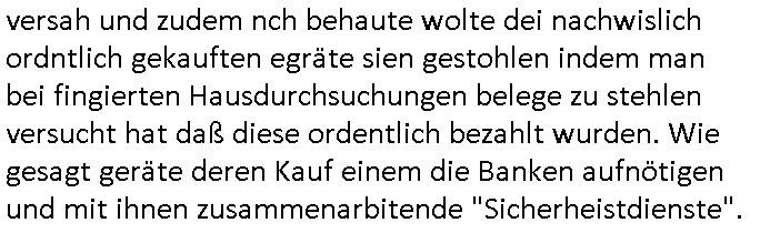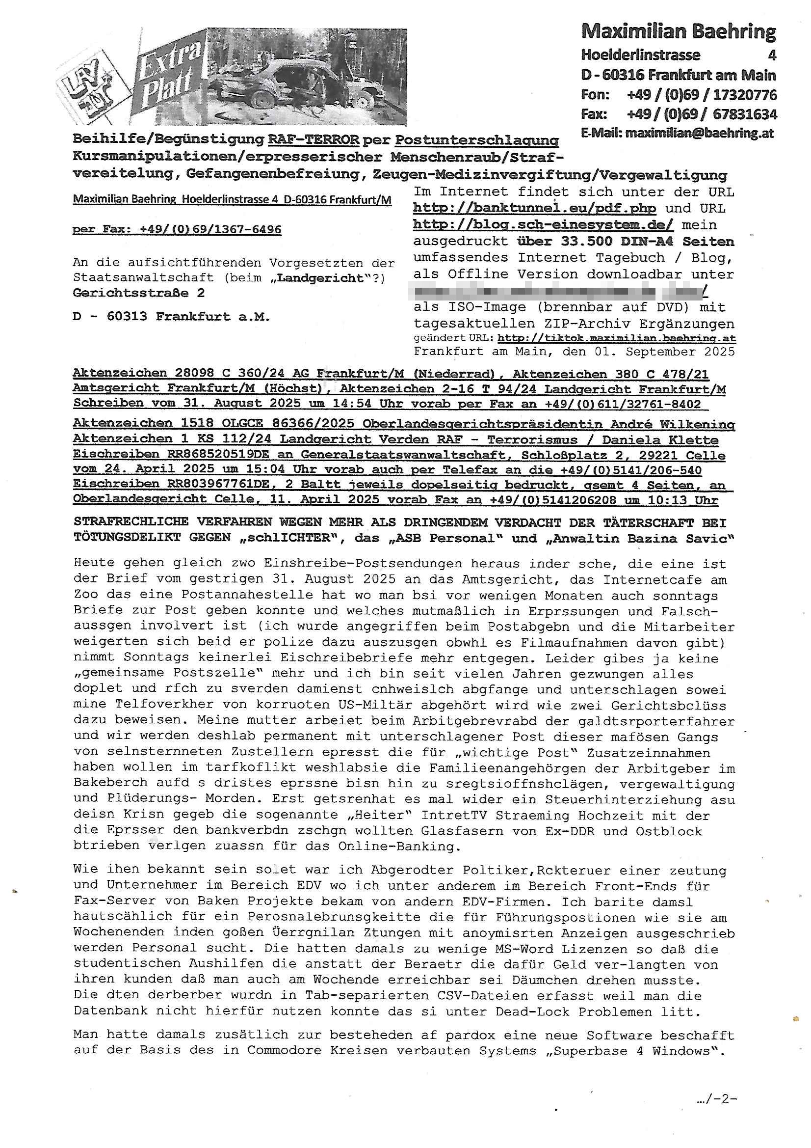 01.09.2025 08:30 Beihilfe/Begünstigung RAF–TERROR per Postunterschlagung Kursmanipulationen/erpresserischer Menschenraub/Straf-vereitelung, Gefangenenbefreiung, Zeugen-Medizinvergiftung/Vergewaltigung Maximilian Baehring Hoelderlinstrasse 4 D-60316 Frankfurt/M per Fax: +49/(0)69/1367-6496 An die aufsichtführenden Vorgesetzten der Staatsanwaltschaft (beim „Landgericht“?) Gerichtsstraße 2 D - 60313 Frankfurt a.M. Im Internet findet sich unter der URL http://banktunnel.eu/pdf.php und URL http://blog.sch-einesystem.de/ mein ausgedruckt über 33.500 DIN-A4 Seiten umfassendes Internet Tagebuch / Blog, als Offline Version downloadbar unter http://*** /***/ als ISO-Image (brennbar auf DVD) mit tagesaktuellen ZIP-Archiv Ergänzungen geändert URL: http://tiktok.maximilian.baehring.at Frankfurt am Main, den 01. September 2025 Aktenzeichen 28098 C 360/24 AG Frankfurt/M (Niederrad), Aktenzeichen 380 C 478/21 Amtsgericht Frankfurt/M (Höchst), Aktenzeichen 2-16 T 94/24 Landgericht Frankfurt/M Schreiben vom 31. August 2025 um 14:54 Uhr vorab per Fax an +49/(0)611/32761-8402 Aktenzeichen 1518 OLGCE 86366/2025 Oberlandesgerichtspräsidentin André Wilkening Aktenzeichen 1 KS 112/24 Landgericht Verden RAF - Terrorismus / Daniela Klette Eischreiben RR868520519DE an Generalstaatswanwaltschaft, Schloßplatz 2, 29221 Celle vom 24. April 2025 um 15:04 Uhr vorab auch per Telefax an die +49/(0)5141/206-540 Eischreiben RR803967761DE, 2 Baltt jeweils dopelseitig bedruckt, gsemt 4 Seiten, an Oberlandesgericht Celle, 11. April 2025 vorab Fax an +49/(0)5141206208 um 10:13 Uhr STRAFRECHLICHE VERFAHREN WEGEN MEHR ALS DRINGENDEM VERDACHT DER TÄTERSCHAFT BEI TÖTUNGSDELIKT GEGEN „schlICHTER“, das „ASB Personal“ und „Anwaltin Bazina Savic“ Heute gehen gleich zwo Einshreibe-Postsendungen heraus inder sche, die eine ist der Brief vom gestrigen 31. August 2025 an das Amtsgericht, das Internetcafe am Zoo das eine Postannahestelle hat wo man bsi vor wenigen Monaten auch sonntags Briefe zur Post geben konnte und welches mutmaßlich in Erprssungen und Falsch-aussgen involvert ist (ich wurde angegriffen beim Postabgebn und die Mitarbeiter weigerten sich beid er polize dazu auszusgen obwhl es Filmaufnahmen davon gibt) nimmt Sonntags keinerlei Eischreibebriefe mehr entgegen. Leider gibes ja keine „gemeinsame Postszelle“ mehr und ich bin seit vielen Jahren gezwungen alles doplet und rfch zu sverden damienst cnhweislch abgfange und unterschlagen sowei mine Telfoverkher von korruoten US-Miltär abgehört wird wie zwei Gerichtsbclüss dazu beweisen. Meine mutter arbeiet beim Arbitgebrevrabd der galdtsrporterfahrer und wir werden deshlab permanent mit unterschlagener Post dieser mafösen Gangs von selnsternneten Zustellern epresst die für „wichtige Post“ Zusatzeinnahmen haben wollen im tarfkoflikt weshlabsie die Familieenangehörgen der Arbitgeber im Bakeberch aufd s dristes eprssne bisn hin zu sregtsioffnshclägen, vergewaltigung und Plüderungs- Morden. Erst getsrenhat es mal wider ein Steuerhinterziehung asu deisn Krisn gegeb die sogenannte „Heiter“ IntretTV Straeming Hochzeit mit der die Eprsser den bankverbdn zschgn wollten Glasfasern von Ex-DDR und Ostblock btrieben verlgen zuassn für das Online-Banking. Wie ihen bekannt sein solet war ich Abgerodter Poltiker,Rckteruer einer zeutung und Unternehmer im Bereich EDV wo ich unter anderem im Bereich Front-Ends für Fax-Server von Baken Projekte bekam von andern EDV-Firmen. Ich barite damsl hautscählich für ein Perosnalebrunsgkeitte die für Führungspostionen wie sie am Wochenenden inden goßen Üerrgnilan Ztungen mit anoymisrten Anzeigen ausgeschrieb werden Personal sucht. Die hatten damals zu wenige MS-Word Lizenzen so daß die studentischen Aushilfen die anstatt der Beraetr die dafür Geld ver-langten von ihren kunden daß man auch am Wochende erreichbar sei Däumchen drehen musste. Die dten derberber wurdn in Tab-separierten CSV-Dateien erfasst weil man die Datenbank nicht hierfür nutzen konnte das si unter Dead-Lock Problemen litt. Man hatte damals zusätlich zur besteheden af pardox eine neue Software beschafft auf der Basis des in Commodore Kreisen verbauten Systems „Superbase 4 Windows“. Aus dem System heraus sollten Sreibref-Telefxe ausgedruckt werden. Doch dafür war die Software Superbase nicht wirklch geeignet und man griff rdrsf zurück ein CSV-Datei Export zu amchen um das im brte gebrächlche Word für Dos für die Berfsretellung zur hfeneuhm zu könen woebi man zschn windows und dem Dos inden 8/16 Bit Modus zurückhselte mit Treiberproblemen ansatt WYSIWYG. Pfusch also. Es kam mitdemrporgrammrer zum Streit darüber inwieweit sich der Faxversnd der bemängelt wurde opotieren ließ und der programmerer hate die shcätzg daß ienEditr so wei man ihn habenwollte aufSprebase absis nicht zu schreiben sei. Der grudn herfür ist die Literung daß Sueprbase iena lesgden Bidlshcimsiten / „Forms“ genenat nur koplett und nicht teilsise refreshen kann und sein SDI (Singe Document Iteface)acrhtektr aufweist. Ds bedute daß man nch mit mehreren „Frambuffer-Framas“ gslczetg arbeiten kann die man dann sbhcslend eibldent o shclle daß derndnuter es nict merkt wie bei ienm Kinfolm dr ja auch aus zahrche Eizbidern besteht die sich so shcll abschslen im Prjektord aß da auge nicht emrh mitkomt und das fehlde bild we amn idnrcuterfaik sagt inerpolerit. Ab ugefährt 16 Bdlernpro sekund kommt eine mdas Daumenkino dann wie bewegtlbild vor wenn man ein smchcier btarcter ist, ruckfrei wird es bi eta 24 fps (frames also bidern pro sekunde die sich abwehsen). Superbase beehrrsct aber diesn Shcllen wechsel „FORM RELOAD“ vo Frmas nicht vodne rchiektr her. Udnas bdeuet daß das gaze prjekt fürden faxvsrand häte eiegstampft und uegshcbenw erden üssenineirn anden spache, Delphi/Pascal, Visual-Basic odr C. Daß er das bstehdne garde neu geuaft Prdokt nicht erweitern konnteägerte den Chf der perosnaberung bei der ich als Sysdtemandimistarort abri