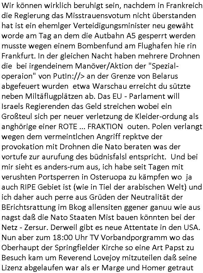 Wir können wirklich beruhigt sein, nachdem in Frankreich die Regierung das Misstrauensvotum nicht überstanden hat ist ein ehemlger Verteidigungsminister neu gewäht worde am Tag an dem die Autbahn A5 gesperrt werden musste wegen einem Bombenfund am Flughafen hie rin Frankfurt. In der gleichen Nacht haben mehrere Drohnen die bei irgendeinem Manöver/Aktion der "Spezial-operaion" von PutIn://> an der Grenze von Belarus abgefeuert wurden etwa Warschau erreicht du sützte neben Miltäflugplätzen ab. Das EU - Parlament will Israels Regierenden das Geld streichen wobei ein Großteul sich per neuer verletzung de Kleider-ordung als anghörige einer ROTE ... FRAKTION outen. Polen verlangt wegen dem vermeintlchen Angriff repktve der provokation mit Drohnen die Nato beraten was der vortufe zur aurufung des büdnisfalsl entspricht. Und bei mir sieht es anders-rum aus, ich habe seit Tagen mit verushten Portsperren in Osteruopa zu kämpfen wo ja auch RIPE Gebiet ist (wie in Tiel der arabischen Welt) und ich daher auch perre aus Grüden der Neutralität der BErichtsrattung im Bkog allensiten ggener ganuu wie aus nagst daß die Nato Staaten Mist bauen könnten bei der Netz - Zersur. Derweil gibt es neue Attentate in den USA. Nun aber zum 18:00 Uhr TV Vorbandporgramm wo das Oberhaupt der Springfielder Kirche so eine Art Papst zu Besuch kam um Reverend Lovejoy mitzuteilen daß seine Lizenz abgelaufen war als er Marge und Homer getraut