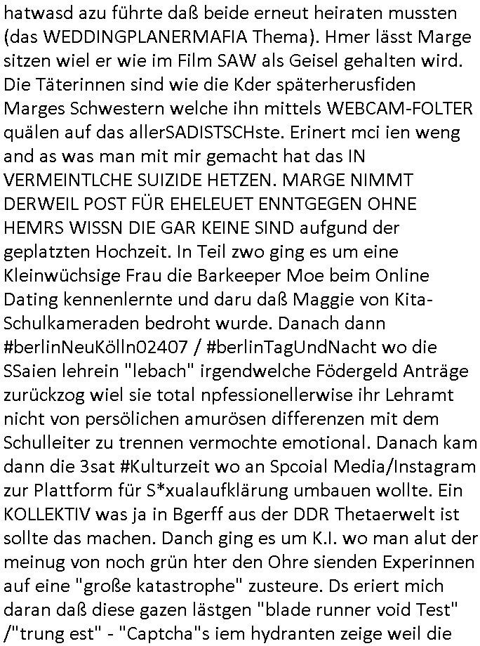 hatwasd azu führte daß beide erneut heiraten mussten (das WEDDINGPLANERMAFIA Thema). Hmer lässt Marge sitzen wiel er wie im Film SAW als Geisel gehalten wird. Die Täterinnen sind wie die Kder späterherusfiden Marges Schwestern welche ihn mittels WEBCAM-FOLTER quälen auf das allerSADISTSCHste. Erinert mci ien weng and as was man mit mir gemacht hat das IN VERMEINTLCHE SUIZIDE HETZEN. MARGE NIMMT DERWEIL POST FÜR EHELEUET ENNTGEGEN OHNE HEMRS WISSN DIE GAR KEINE SIND aufgund der geplatzten Hochzeit. In Teil zwo ging es um eine Kleinwüchsige Frau die Barkeeper Moe beim Online Dating kennenlernte und daru daß Maggie von Kita-Schulkameraden bedroht wurde. Danach dann #berlinNeuKölln02407 / #berlinTagUndNacht wo die SSaien lehrein "lebach" irgendwelche Födergeld Anträge zurückzog wiel sie total npfessionellerwise ihr Lehramt nicht von persölichen amurösen differenzen mit dem Schulleiter zu trennen vermochte emotional. Danach kam dann die 3sat #Kulturzeit wo an Spcoial Media/Instagram zur Plattform für S*xualaufklärung umbauen wollte. Ein KOLLEKTIV was ja in Bgerff aus der DDR Thetaerwelt ist sollte das machen. Danch ging es um K.I. wo man alut der meinug von noch grün hter den Ohre sienden Experinnen auf eine "große katastrophe" zusteure. Ds eriert mich daran daß diese gazen lästgen "blade runner void Test" /"trung est" - "Captcha"s iem hydranten zeige weil die