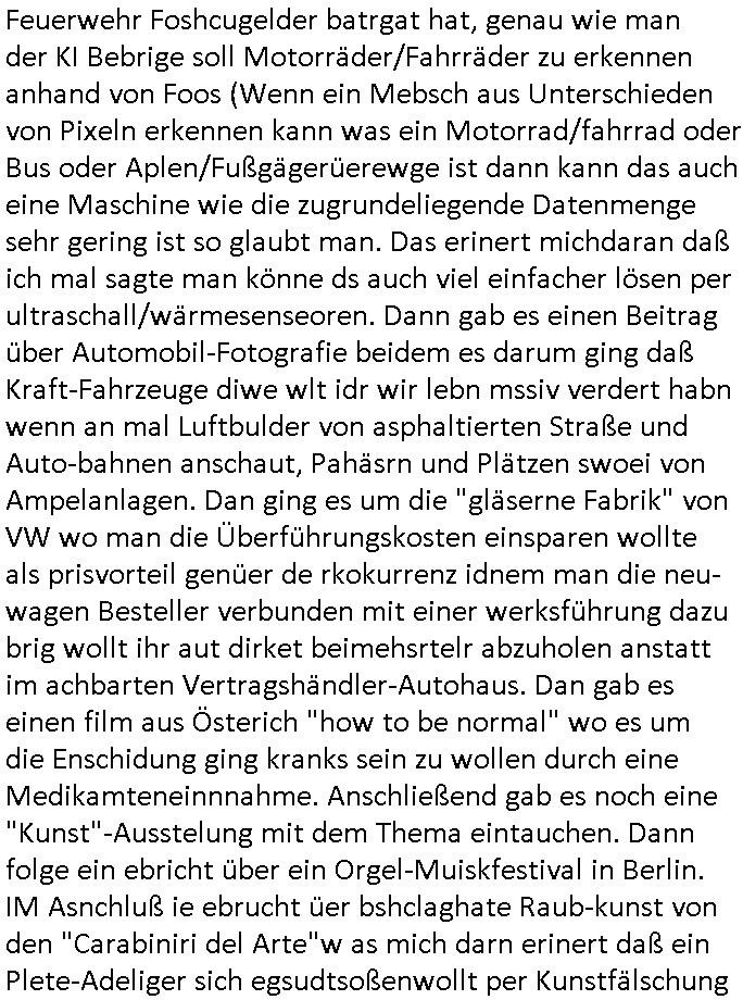 Feuerwehr Foshcugelder batrgat hat, genau wie man der KI Bebrige soll Motorräder/Fahrräder zu erkennen anhand von Foos (Wenn ein Mebsch aus Unterschieden von Pixeln erkennen kann was ein Motorrad/fahrrad oder Bus oder Aplen/Fußgägerüerewge ist dann kann das auch eine Maschine wie die zugrundeliegende Datenmenge sehr gering ist so glaubt man. Das erinert michdaran daß ich mal sagte man könne ds auch viel einfacher lösen per ultraschall/wärmesenseoren. Dann gab es einen Beitrag über Automobil-Fotografie beidem es darum ging daß Kraft-Fahrzeuge diwe wlt idr wir lebn mssiv verdert habn wenn an mal Luftbulder von asphaltierten Straße und Auto-bahnen anschaut, Pahäsrn und Plätzen swoei von Ampelanlagen. Dan ging es um die "gläserne Fabrik" von VW wo man die Überführungskosten einsparen wollte als prisvorteil genüer de rkokurrenz idnem man die neu-wagen Besteller verbunden mit einer werksführung dazu brig wollt ihr aut dirket beimehsrtelr abzuholen anstatt im achbarten Vertragshändler-Autohaus. Dan gab es einen film aus Österich "how to be normal" wo es um die Enschidung ging kranks sein zu wollen durch eine Medikamteneinnnahme. Anschließend gab es noch eine "Kunst"-Ausstelung mit dem Thema eintauchen. Dann folge ein ebricht über ein Orgel-Muiskfestival in Berlin. IM Asnchluß ie ebrucht üer bshclaghate Raub-kunst von den "Carabiniri del Arte"w as mich darn erinert daß ein Plete-Adeliger sich egsudtsoßenwollt per Kunstfälschung