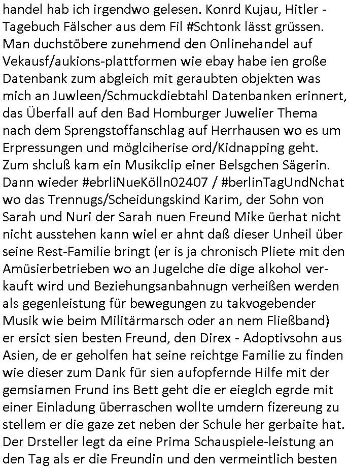 handel hab ich irgendwo gelesen. Konrd Kujau, Hitler -Tagebuch Fälscher aus dem Fil #Schtonk lässt grüssen. Man duchstöbere zunehmend den Onlinehandel auf Vekausf/aukions-plattformen wie ebay habe ien große Datenbank zum abgleich mit geraubten objekten was mich an Juwleen/Schmuckdiebtahl Datenbanken erinnert, das Überfall auf den Bad Homburger Juwelier Thema nach dem Sprengstoffanschlag auf Herrhausen wo es um Erpressungen und möglciherise ord/Kidnapping geht. Zum shcluß kam ein Musikclip einer Belsgchen Sägerin. Dann wieder #ebrliNueKölln02407 / #berlinTagUndNchat wo das Trennugs/Scheidungskind Karim, der Sohn von Sarah und Nuri der Sarah nuen Freund Mike üerhat nicht nicht ausstehen kann wiel er ahnt daß dieser Unheil über seine Rest-Familie bringt (er is ja chronisch Pliete mit den Amüsierbetrieben wo an Jugelche die dige alkohol ver-kauft wird und Beziehungsanbahnugn verheißen werden als gegenleistung für bewegungen zu takvogebender Musik wie beim Militärmarsch oder an nem Fließband) er ersict sien besten Freund, den Direx - Adoptivsohn aus Asien, de er geholfen hat seine reichtge Familie zu finden wie dieser zum Dank für sien aufopfernde Hilfe mit der gemsiamen Frund ins Bett geht die er eieglch egrde mit einer Einladung überraschen wollte umdern fizereung zu stellem er die gaze zet neben der Schule her gerbaite hat. Der Drsteller legt da eine Prima Schauspiele-leistung an den Tag als er die Freundin und den vermeintlich besten