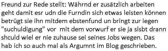 Freund zur Rede stellt: Währnd er zusätzlich arbeiten geht damit esr udn die Furndin sich etwas leisten können betrügt sie ihn mitdem ebstenfund un bringt zur iegen "suchuldigung" vor mit dem vorwurf er sie ja slsbt drann shculd wiel er nie zuhause sei seines Jobs wegen. Das hab ich so auch mal als Argumnt im Blog geschrieben.