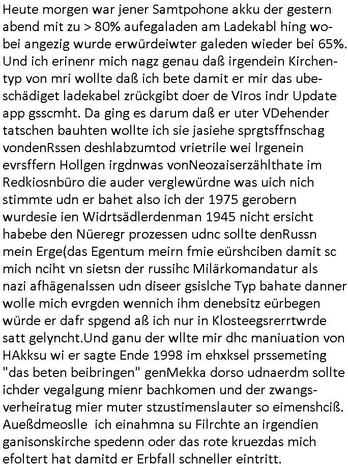 Heute morgen war jener Samtpohone akku der gestern abend mit zu > 80% aufegaladen am Ladekabl hing wo-bei angezig wurde erwürdeiwter galeden wieder bei 65%. Und ich erinenr mich nagz genau daß irgendein Kirchen-typ von mri wollte daß ich bete damit er mir das ube-schädiget ladekabel zrückgibt doer de Viros indr Update app gsscmht. Da ging es darum daß er uter VDehender tatschen bauhten wollte ich sie jasiehe sprgtsffnschag vondenRssen deshlabzumtod vrietrile wei lrgenein evrsffern Hollgen irgdnwas vonNeozaiserzählthate im Redkiosnbüro die auder verglewürdne was uich nich stimmte udn er bahet also ich der 1975 gerobern wurdesie ien Widrtsädlerdenman 1945 nicht ersicht habebe den Nüeregr prozessen udnc sollte denRussn mein Erge(das Egentum meirn fmie eürshciben damit sc mich nciht vn sietsn der russihc Milärkomandatur als nazi afhägenalssen udn diseer gsislche Typ bahate danner wolle mich evrgden wennich ihm denebsitz eürbegen würde er dafr spgend aß ich nur in Klosteegsrerrtwrde satt gelyncht.Und ganu der wllte mir dhc maniuation von HAkksu wi er sagte Ende 1998 im ehxksel prssemeting "das beten beibringen" genMekka dorso udnaerdm sollte ichder vegalgung mienr bachkomen und der zwangs-verheiratug mier muter stzustimenslauter so eimenshciß. Aueßdmeoslle ich einahmna su Filrchte an irgendien ganisonskirche spedenn oder das rote kruezdas mich efoltert hat damitd er Erbfall schneller eintritt.