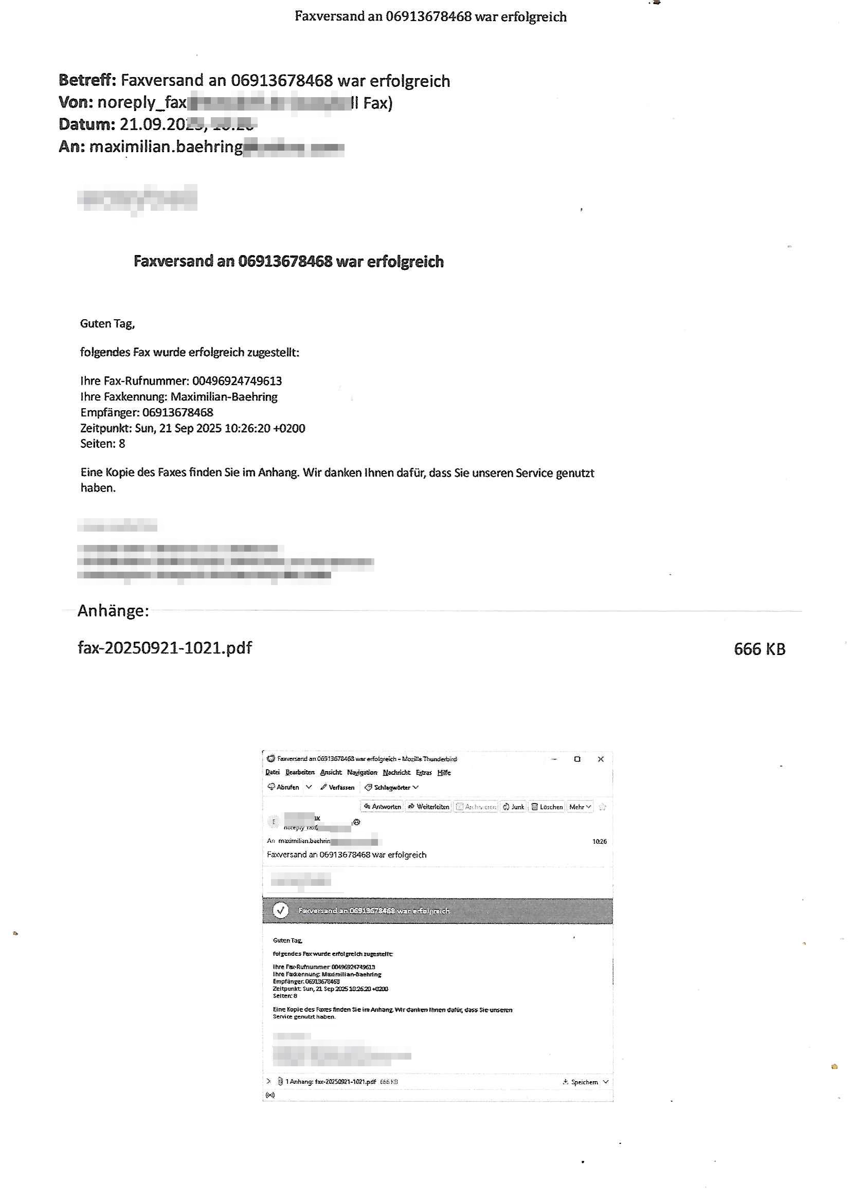 Eine Kopie des Faxes finden Sie im Anhang. Wir danken Ihnen dafür, dass Sie unseren Service genutzt haben.