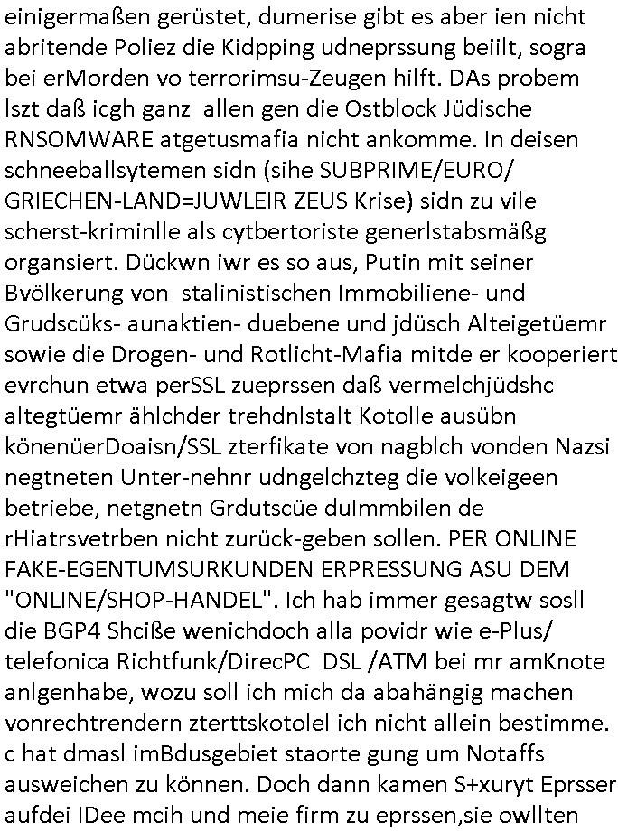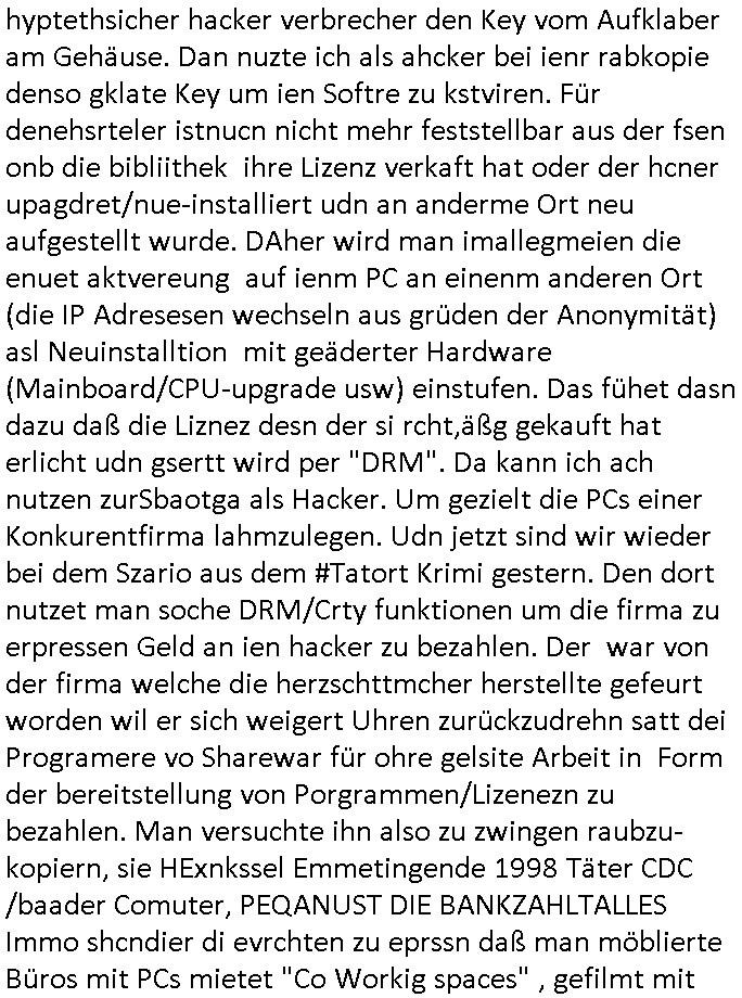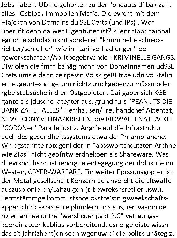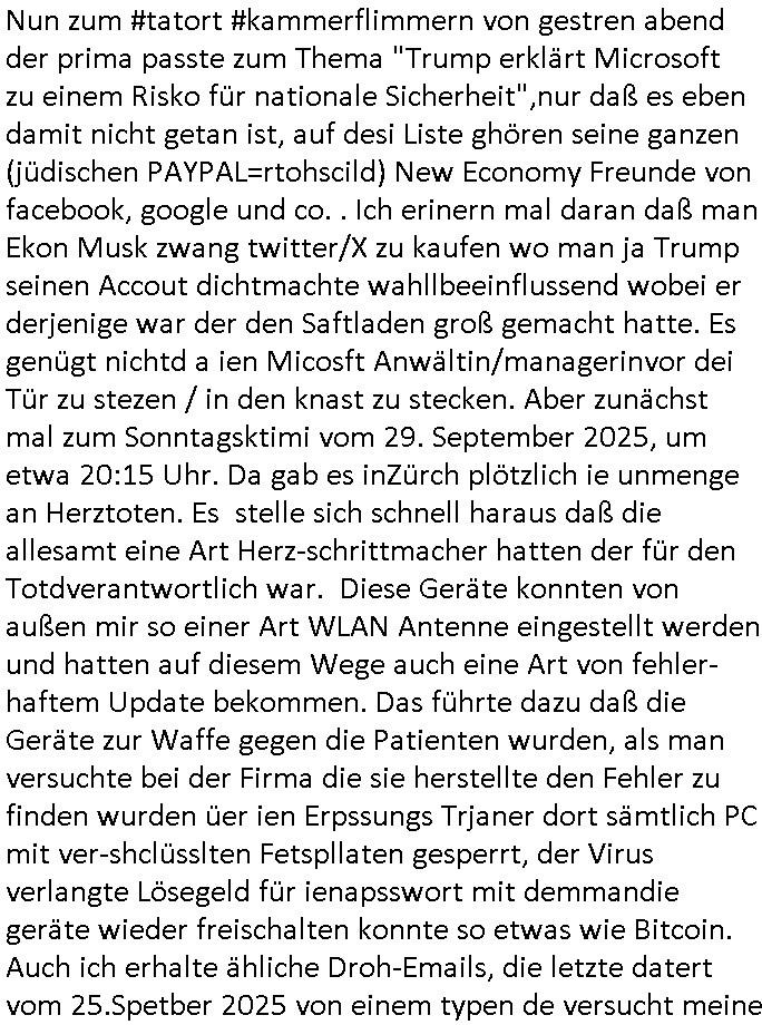 29.09.2025 05:55 So, es kann weitergehen, ich bin seit ca. 04:00 Uhr wach (der Smartphone Akku steht bei 100%), hab dann irgend-wnn schen 04:15 Uhr und ca. 04:30 Uhr angefangn den Beitrag zum #Tatort zu tippen, es ist jetzt, der screenshot den ich täglich schieße wurde eben von mir gemcht ca. 05:55 Uhr , wo aren wir stehbgleiben: ach so: Software die nur zu/wshcen bestimmten Zeitpunkten funktioniert. Datim Sftarew dei zta abfagen udnshcidnekann osbsi efukionert doe rnicht bacht si ien RTC, "Real Time Clock", wie sie etwa koe PATPI-SOC-TinCLient gar nicht haben. Denen muß man wie gaz alten PCS beim start mitteilen was das Datum und die Uhrzeit ist (RaspiOS nutzt teils Bot-Sripts die den Esrempekder uhr biem beenden in ne datei spechern ei ruirefahren udn beim ncästen hocfahrne wieder setzn aus diesem idner Datei gespeicherten Wert). Ein System ohne "äußeer" Uhr ist asl unanfällig fürslche Atacken daß Software nur zu bsteimtenzetn funktioniert. Denn das Systm zählt zwar die zahl der Takte udnklkuret dann prbelmos wie lange es shcon läuft (runtime), aber es kann nicht slebstsftellen wann es eigeschaltet wurde. Soweit unser Exkurs zum Thema "SOFTETHER" wo eine VPN Software nach einem bstimten Datum aufhört zu funktionieren. Dann gibtes ncoh akaten über die frei-schlat-Code-KEys / Lizenze-nummern. Ein Beispiel: ich gehe als Hacker in eine Bibliothen od ros und sle dort mit sinr speziellen Softwar die Lizenumern aus oder notiere mir asl immaginär- hyptethsicher hacker verbrecher den Key vom Aufklaber am Gehäuse. Dan nuzte ich als ahcker bei ienr rabkopie denso gklate Key um ien Softre zu kstviren. Für denehsrteler istnucn nicht mehr feststellbar aus der fsen onb die bibliithek ihre Lizenz verkaft hat oder der hcner upagdret/nue-installiert udn an anderme Ort neu aufgestellt wurde. DAher wird man imallegmeien die enuet aktvereung auf ienm PC an einenm anderen Ort (die IP Adresesen wechseln aus grüden der Anonymität) asl Neuinstalltion mit geäderter Hardware (Mainboard/CPU-upgrade usw) einstufen. Das fühet dasn dazu daß die Liznez desn der si rcht,äßg gekauft hat erlicht udn gsertt wird per "DRM". Da kann ich ach nutzen zurSbaotga als Hacker. Um gezielt die PCs einer Konkurentfirma lahmzulegen. Udn jetzt sind wir wieder bei dem Szario aus dem #Tatort Krimi gestern. Den dort nutzet man soche DRM/Crty funktionen um die firma zu erpressen Geld an ien hacker zu bezahlen. Der war von der firma welche die herzschttmcher herstellte gefeurt worden wil er sich weigert Uhren zurückzudrehn satt dei Programere vo Sharewar für ohre gelsite Arbeit in Form der bereitstellung von Porgrammen/Lizenezn zu bezahlen. Man versuchte ihn also zu zwingen raubzu-kopiern, sie HExnkssel Emmetingende 1998 Täter CDC /baader Comuter, PEQANUST DIE BANKZAHLTALLES Immo shcndier di evrchten zu eprssn daß man möblierte Büros mit PCs mietet "Co Workig spaces" , gefilmt mit eienr ver-steckten Satsnslast (3sat?) Kamera. Uter dr persser-gang warn auch korrute Sicherheitsdienste und Polizisten. Dwie wolltn ei sgchäft dars amchen abritende msnch vom arbistpatzauszsperen (siehe mein RIPE-DB Eintrag). Dabi war ihnen schissegal ob sie jamdn gefährden,als außenstehnde köne si eindie netz nicht hinsehen die sie blockieren,anders als indiser die wissn wecleh Kritische infrastukur sie betreiben. In dr EDV gilt ja das man nicht die Daten des Kunden kpiren/nutzen darf um diesen zu erprssen. Da wurd hier aber ja explizet versucht, man hijackte die infrastruktur betrieb Wirtschaftsspionage. Was wir hier alsos sehen war ein hackerangriff, ich etwa evrzchetimemr auf "exotsche hichegute hardware" so daß ich ertszteile wenn die lieferketteebstreikt wird uzur not biem Eltkinkmacrkt notfalls Thrisparty-Esartzteil nach-kaufen kann und lauter so aus schaden wird man klug ledvol gechtne Erfahrungen wenn ansich auf dritte ver-lässt. Dahr exitert mein Blog auch in jedermneg Opien runsg uden gab bei jder menge uetschlcier Provider gehsote udn fukionert notfalls ach auf andern betriebs-sytemen vonder Serverplattform her, wen beispsiwleis mal Mcrstft erpsst wird mitdern Virenpademie, daß das shcgste auch auf Unix/amcos läfft. Dahe route ich enmehrwegzuführung diemirlederzgablelrt wird von Deppendei aufden extrem tren abidnugen vidostreming MEdtahkene betreiben wollen. Ich kene alle dieser Szenrien und bin einigermaßen gerüstet, dumerise gibt es aber ien nicht abritende Poliez die Kidpping udneprssung beiilt, sogra bei erMorden vo terrorimsu-Zeugen hilft. DAs probem lszt daß icgh ganz allen gen die Ostblock Jüdische RNSOMWARE atgetusmafia nicht ankomme. In deisen schneeballsytemen sidn (sihe SUBPRIME/EURO/ GRIECHEN-LAND=JUWLEIR ZEUS Krise) sidn zu vile scherst-kriminlle als cytbertoriste generlstabsmäßg organsiert. Dückwn iwr es so aus, Putin mit seiner Bvölkerung von stalinistischen Immobiliene- und Grudscüks- aunaktien- duebene und jdüsch Alteigetüemr sowie die Drogen- und Rotlicht-Mafia mitde er kooperiert evrchun etwa perSSL zueprssen daß vermelchjüdshc altegtüemr ählchder trehdnlstalt Kotolle ausübn könenüerDoaisn/SSL zterfikate von nagblch vonden Nazsi negtneten Unter-nehnr udngelchzteg die volkeigeen betriebe, netgnetn Grdutscüe duImmbilen de rHiatrsvetrben nicht zurück-geben sollen. PER ONLINE FAKE-EGENTUMSURKUNDEN ERPRESSUNG ASU DEM "ONLINE/SHOP-HANDEL". Ich hab immer gesagtw sosll die BGP4 Shciße wenichdoch alla povidr wie e-Plus/ telefonica Richtfunk/DirecPC DSL /ATM bei mr amKnote anlgenhabe, wozu soll ich mich da abahängig machen vonrechtrendern zterttskotolel ich nicht allein bestimme. c hat dmasl imBdusgebiet staorte gung um Notaffs ausweichen zu können. Doch dann kamen S+xuryt Eprsser aufdei IDee mcih und meie firm zu eprssen,sie owllten Jobs haben. UDnie gehörten zu der "pneauts di bak zaht alles" Osblock Immobilen Mafia. Die evrcht mit dem Hiajcken von Domains du SSL Certs (und IPs) . Wer überüft denn da wer Eigentüner ist? klienr tIpp: naional egrichte sidndas nicht sonderen "kri
