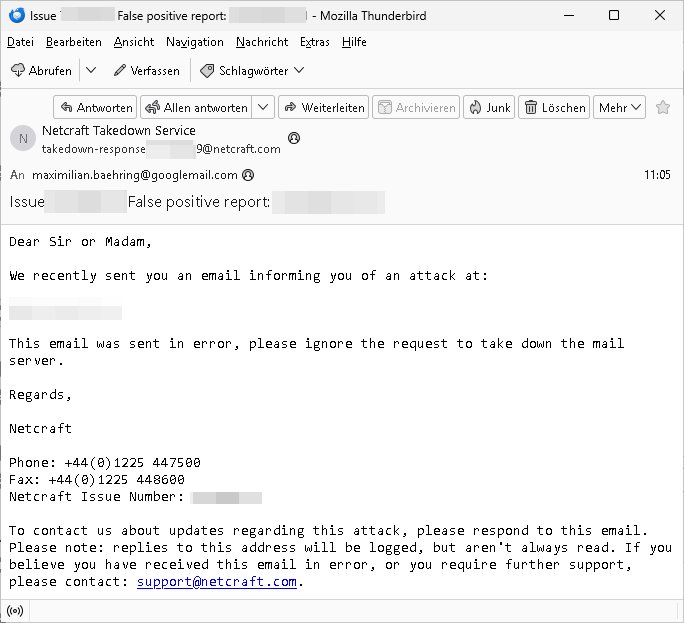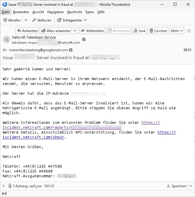 29.09.2025 11:05 -------- Nachricht -------- Betreff: Issue ***: False positive report: 193.109.132.11 Datum: Mon, 29 Sep 2025 09:05:32 +0000 Von: Netcraft Takedown Service <takedown-response+***@netcraft.com> An: maximilian.baehring@googlemail.com Dear Sir or Madam, We recently sent you an email informing you of an attack at: *** This email was sent in error, please ignore the request to take down the mail server. Regards, Netcraft Phone: +44(0)1225 447500 Fax: +44(0)1225 448600 Netcraft Issue Number: *** To contact us about updates regarding this attack, please respond to this email. Please note: replies to this address will be logged, but aren't always read. If you believe you have received this email in error, or you require further support, please contact: support@netcraft.com. -------- Nachricht -------- Betreff: Issue ***: Server involved in fraud at *** Datum: Mon, 29 Sep 2025 07:55:06 +0000 Von: Netcraft Takedown Service <takedown-response+***@netcraft.com> An: maximilian.baehring@googlemail.com Sehr geehrte Damen und Herren! Wir haben einen E-Mail-Server in Ihrem Netzwerk entdeckt, der E-Mail-Nachrichten sendet, die versuchen, Benutzer zu erpressen. Der Server hat die IP-Adresse ***. Als Beweis dafür, dass das E-Mail-Server involviert ist, haben wir eine betrügerische E-Mail angehängt. Bitte stoppen Sie diesen Angriff so bald wie möglich. Weitere Informationen zum erkannten Problem finden Sie unter https://incident.netcraft.com/reports/*** Weitere Details, einschließlich API-Unterstützung, finden Sie unter https://incident.netcraft.com/about . Mit besten Grüßen, Netcraft Telefon: +44(0)1225 447500 Fax: +44(0)1225 448600 Netcraft-Ausgabenummer: *** Um Aktualisierungen über diesen Angriff zu erhalten, antworten Sie bitte auf diese E-Mail. Bitte beachten Sie: Antworten auf diese Adresse werden zwar protokolliert, aber nicht immer gelesen. Wenn Sie mehr Unterstützung benötigen, oder glauben, Sie haben diese E-Mail irrtümlich erhalten, kontaktieren Sie bitte: support@netcraft.com. Diese E-Mail kann mit X-ARF-Tools geparsed werden. Weitere Informationen über X-ARF-Tools finden Sie unter http://www.xarf.org/ ------------------- Dear Sir or Madam, We have discovered an email server on your network that is sending e-mail messages that are attempting to extort users. The server has the IP address ***. We have attached an example fraudulent e-mail demonstrating the e-mail server's involvement. Please close down this attack as soon as possible. More information about the detected issue is provided at https://incident.netcraft.com/reports/*** See https://incident.netcraft.com/about for more details including API support. Regards, Netcraft Phone: +44(0)1225 447500 Fax: +44(0)1225 448600 Netcraft Issue Number: *** To contact us about updates regarding this attack, please respond to this email. Please note: replies to this address will be logged, but aren't always read. If you believe you have received this email in error, or you require further support, please contact: support@netcraft.com. This mail can be parsed with x-arf tools. Visit http://www.xarf.org/ for more information about x-arf. [0] "202509291105-0-1.jpg" [1] "202509291105-0-2.jpg" |