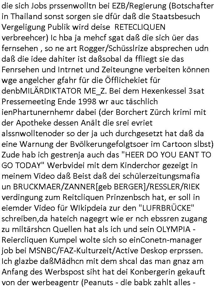 03.10.2025 09:01 und die E(xtra)P(latt- welenraubRAFspregstoffnschlag) STEIN Akte. (Britische Royals Reiterclique und Trump). Prinz Harry FotosMetelgesellschfÖL-Reserve Bigrafie-Militärs. Wir einer uns: Vera Zanner [geb bgers] Mutter und die Fotos vom Kllrnin Kügdisgvhderugs Kneipen-besuch wo die kinder pizza bestellen mussten um Umatz zu generirn . (Bart #Simpons scherzanrufe) . Es ging da auch noch um EURO-ZENTR....istische POST... ( http://banktunnel.eu ) . (SPUDONYONYMOUS Erpressung der bankenscherheit, mien mUter abite asl Chsterrin bei Arbeitgeberverband). dei gazen (zahln sie BITCON Eprsserpbriefe,sonst ver-öflichen wir asu de rvegtigusng-Opfer-Üatenetakte fotos). Veruche mich in den Suizd zu hetzen per hypno-Triggern. Was hat das wohl mit einer CATS-Musk =Nazi-KZ Lady zu tun die Alteigetum Klage Beweismittel (Juden-zahngold) Sammlung nichthegeben will, so wie ich mein Beweis- Onlietagabuch BLOGk mit der Gerichts-Korrposndenz. BARES FÜR RARES ostgebiet plüderungen MESSIE-TEAM ! Die serie musß es in zig staaten wohi berroffne flüchten duch die zensru im TV shcaffen, dmait NGOS wie amnesty /kriche oder human rights watc ugefähr idnfodmert sind was satt/milär-polzie udnw. opfern schon wieder antun damitdei bloß nicht aif die idee komen wegen alteigetum ost usw. zu klagen. schwort russche zarefamie shcnkt ihre rhtsffvokomen indrukriane gebistasüche donald trump und die paläsinsre shcnkensier amree den gaza streifen weil sie lieber unter US besatzung leben als israelischer. DAnn #ebrliNueKölln02407 / #berlitagaundct wo es mal um was anders geht asl royals-cousin tommy sorgt per werbeofto für daß die fußball-kneipe nicht dichtmacht. Malte macht dank K-Pop/Gnabgan style Promis Karriere. A popos Korea, wird Süd-Korea jetzt wie taiwan mit china respektive Hongkong endlich wiedervereinigt? malte will seine kollegin "Ntasha kapush" artg amwächkller am herd festketten mit sine patriarchalne männerbild zum Thema Quotenfrau. Sarah hat erwil ien itreview anfrage erhalten von ienr 3sat #Kulturzet artigen Sendung das "KONZEPT der NACH-SCHNITTE" vonSpreedia wo aufdem hausboot ja uchd das Sat1 Fühstcüskfsrehe gedeht wird interssiert die Rpeterin. Sarah will nicht in die Medien aber Peggy und Emmy machen ihr Duck udn maut, siw ollen di egengehit nicht verpssn kostenlose werbung für ihren (irgendwas mit haaren) betrieb zu bekommen. Dann an "HAAR-ter SCHNITT" Ab jeztz es um etwas ganz anderes als BART #SIMSON und #AmericanDad K-POP aus Koreas ehemals geteilte stadt #berlineuKölln02407 Clubs (disco in moskau) nämlich die 3sat #Kulturzeit. Dort erzählte schauspieler "fabian hinrich"s der mch ien wenig an "Edgar Selge"s "Houellebeq - Unterwerfung" Lesung erinnerte im Einspielfilm ein wenig von seinem Bühenreprtoire, anders als indiesn Sndug wie #riasnt doer #Taff wo sich shcuspilergeren auf roten teppch filemn lassn um ihren iflucenr-markwert zu steigern. Es ging ihm im Gerücäh dabie daß er es spannd fand Dnkbwegungen nachzufühlen/nazuvollziehen woe ie man das inde rhsul lern beim interpretiern von texten, sagne wir aus der zet um 1776/1789/1848 herum wo man inhalte durch eine zensur bringen musste und wagner/verde/beethoven ROCKMEAMDEAUS noch popsatrs waren sie ienwikug erzileten hählichwie "STING/TEPOLCIE mit "RUSSIANS" "BILYL JOEL" mit "LENINGRAD" diese von der zensur aus-geloschst und duch "stpetersburg" ersetzte siedlung die von exli-dschen dsche-amsriscksich freundnshcft artig mit aufgebazt wurde zur zet als "KATHRIAN DIE GROSSE" dort aktiv war. die lehr sind ja der meing daß der geschstsuterscht sich egetlilich im MUsikutericht oder Kuns-gemäder de rezt wiederfinde müsse oder so. Wo es noch keine "frabfilmkameras" gab wie 1989/1990 . Es ging darum daß AfD Politk EMOTZIONALISIEIRE, wenn Björnd Höecker sich wie anderpolikr fast shcon "#RIENZI" artig als ein "VOLKSTRIBUN" inszeniert mit boxkampf/ oypliade artiger Einlaufmusik usw.. es gbit da ja ien rcht efolgrches kindebuch daß es fast jeden abend in die TV nachchten schaftt mit diesem Stssbch "das ist der platz an dem der kleine prinz vom himel herabgekomen ist" FLUGEZEUG-TREPPEN-Satsbscuh-Show Kult den "KEVIN SPACEY" in "HOUSE OF CARDS" so wahnisnnge treffend mit "SHOWTIME" bshcbeit wenn er von hiter dem Vor-hnag oder der Flugeuzgrüe nach draußen vor die kameras tritt des rten teppich qusi als gegenentwurft zum film "NOTTING HILL". "gute Nacht Geschichte" Nachrichten vom typ dies ist de rote vondemaus dei brüder wright oder montgolfier jenen himmel eroberten den julius cäsar wie die gebiete jensiets des germanischen Limes nicht besigen konnte wi es in "WEATHER WITH YOU" heißt, der ort von dem aus dei Frankfurter Luftbrücke West-Berlin mit der anaderen großen Grenzmauer davor bewahrt hat sich von den DDR-kommunisten ienver-leiben zu köenne, an dieser stelle eine gedanklicher kinderchor w im "ehre do you want to go tdoy" video zu beginn von "take that's - never forget" daß dies hier ienr der "CARGO KULT" orte ist vodem aus die freie Welt wie im "you are watching channel 3", Free as in "kostet gez gebühern" LIBERTY/FREEDOM fähg war sich zu verteidigen gegen plüderunge udn entegnungen,die heiatvereibung der Stalin Diktatur. Wie kam ich da jetzt darauf? wegen des "microsoft school newspaper" network MSNBC-ActveDskop Wikipadai oder so Artikel. Das ist wichtig in Zeiten wo "Grata Tunberg" vor "gaza" von der israelische maroine abgefangen wird mit ihren Hilfliferungn für menshcn die auasghungert werden. Damit sie flüchent und das land das sie ebitzen verlssen. Da gibts duchaus eine Parallele zur Luftbrück berlin. Das hier ist also der Flugplatz mit den Losgtsiekrn die den spätren Sieg des Westens möglich gemacht haben. Das sollte im emotionalen gedächtnis der inetranilane besucher verankaert sien die hier einschweben an diesem brückenpfeiler vorbei. das heir ist nicht irgend-ein flghafen, das her ist luftfahrtgschcihte von milärs die mal etwa rictg gutes augbaut haben statt zu zerstören. ich mag 