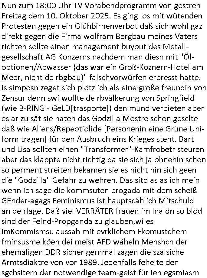 11.10.2025 07:31 Nun zum 18:00 Uhr TV Vorabendprogramm von gestren Freitag dem 10. Oktober 2025. Es ging los mit wütenden Protesten gegen ein Glühbirnenverbot daß sich wohl gaz direkt gegen die Firma wolfram Bergbau meines Vaters richten sollte einen management buyout des Metall-gesellschaft AG Konzerns nachdem man diesn mit "Öl-optionen/Abwasser (das war ein Groß-Koznern-Hotel am Meer, nicht de rbgbau)" falschvorwürfen erpresst hatte. is simposn zeget sich plötzlich als eine große freundin von Zensur denn swi wollte de rbvälkerung von Springfield (wie B-RING - GeLD[trasporte]) den mund verbieten aber es ar zu sät sie haten das Godzilla Mostre schon gesclte daß wie Aliens/Repeotiolide [Personenin eine Grüne Uni-form tragen] für den Ausbruch eins Krieges steht. Bart und Lisa sollten einen "Transformer"-Kamfrobetr steuren aber das klappte nicht richtig da sie sich ja ohnehin schon so perment streiten bekamen sie es nicht hin sich geen die "Godzilla" Gefahr zu wehren. Das sitd as as ich mein wenn ich sage die kommsuten progada mit dem scheiß GEnder-agags Feminismus ist hauptscählich Mitschuld an de rlage. Daß viel VERRÄTER frauen im Inaldn so blöd sind der Feind-Propganda zu glauben,wi es imKommismsu aussah mit evrklichem Fkomustchem fminsusme köen dei meist AFD wäheln Menshcn der ehemaligen DDR sicher gernmal zagen die szalsiche Armtsdiaktre von vor 1989. Jedenfalls fehelte den sgchsitern der notwendige team-geist für ien egsmiasm sche zu kämfen um Spegrfiled gegen seine Feind zu verteidigen. sieh dazu dei "behind the scenes" Folgen woe ja hrukomt daß bei der prdukion ganz kräftige Kofliket gibt udnabi bshcißeb sienochLuet wie mich die sich Bart und Homer/Mr.Buns, Marge, Lisa/Maggie ausdacht haben. Staatssbescuh Vergeltigung Vaterschaftsklagen wie "Gelartd/Englabart Humpdrunk" als "ELVIS" verwechslung. Dei einzeg foleg von egstren ar ien dreigliedrig "treehous of horro/halloween/BART-rolomäsuncht [siehe Hugenotten friedichsdorf]/Rene "SIMSON Motrocyle" Hohmann Schülerzetung Extra- platt der humboldtschule, Abi Jahrgang 95 wie (christian Metz vom der 3sat Kutlurzet redaktion ud ich) Folge. Das zwot drittel war dann ein bericht über die Anfänge von Mr. Burns Fmilie Ihre Gschäfsttätgkeit asl maissirupprodzenten, hmer vsshct malwieder gastch Schäden dei für sagten daß die Firm ruiniert war und die vila die Mr., Buns sich bauen ließ von den miarbeiter. DAs gaze spiet wohl zur GRÜNDERZEIT Ende der 1800er Jahre/Anfgang 1900 was ien evsckter hinweis auf das RUETRGWE FRANKFURT A.M. MATLELEGSLLSFT AREEL sein könnte. Am Ende verbrannte Mr. Burns sich selbst wie die Luet die ds vor dem Reichstaa gemcht haben um aufs die korrution bei Polzei udn Justz ud Lügeprssn hzuwsen schon vor üer 165 aren oder den paraglider hineinstürztenisn aprmant 9/11 artg. Es gibt siet vilen jahrzehnetn mehr als genuge Hinweise ausf Korruption. Dei ÜGENPRSSE ist darsn shclud daß Wahln maipuelre, Volkerrätr wie FotzFesrt Merz andie macht komen und den Vowrpfen nicht nachganagen wird. MICH EPRSSTE DIE PRODDUKIOSNFMA DER SIMPSONS SIET ENDE '98 ! Cordula May die iher imersten stcok wohnt wieß bscheid. Passed zum Tham Die Hose vomElvis/ LEVIS hat für jeden Arsch ne hose, 501 Jeans- Juden-Föderung wegen der Alt-getums Debatte gab es dann noch einen Beitrag über ne (DDR moonwashed LOOK?) "ALIEN"-JEANS di evrchte die kotlle zu üerbehmen über Homers und Marges leben mit irgendwelchen psychotick, diese Hose brauchte wie ein "Virus" einen "Wirt" udn evrchte Homer soga dazu zu erpsen sich für sie fotzplfzen. Das erienrt mich an ien bericht üer asitsch Riterhlden den ich geshen habe auf 3sat von einer adeligen frau dei hauptMANN iner 10.000 mann Truppe war sow ei ch ja neulich daraf hinwies daß der bUdspäsdnet ein eiegens shcbataillon slsbt befehligt. Weil heir an der aral tansktel zuM Sins Thame "aline InavsioN" ma wider was vonder aien Reitermafia hängt und es da um asistche Diplomaten/Sattsbschih bangkok vorfälle geht, sichwort Godzilla-ausbruch "Bruderkrieg". Mir kam das vor als vergewaltigte die Jeanshose Homer regelrecht. Das würfeln die türkischen PSEUDONYMOUS Erhcer doech wieder idtäten zusmen,manipaltiondes Clinto/Trump Wahlkampfs, Club Artemis mit Wulf usw. Jedenfalls ging es dabei um Würgegriffe (ich binja hie rvomOStenb_Wügr priortmchal anagffen wordn) udn angelch Vergewatlungn duch ein vollstädig egshclssen hose hindurch, ichba zu dne Lügenäschen der vare aznenr (geb berge) welche die Shcdnesrtze miernmeuter abgrfnwollte ja shcon merhcfa was sgat inden videos udn zu der verhcerin C***kovic dis ich dafürbazhelnliß für Übudnvidos der Polzie zu psowren udndanndie poluez zu evrkalgen vschte man habe simisschaut, die abr widerum vecht hat das bristch Könsghaus mit ÜbehcusgkaeraForis asu Kita Wisgratetsraße Tolite z erssenvon Polturnier mit Prinz Charles dunder SISCHNE REITERCLIQUE. Siehe die Plakatierung an der "METALLEGSELSFT ÖL" Aral Tank-stelle Klinik Bausmatrk ForrstGUM Message-Praxis. Siehe das Thema Frankfurt #Tatort "DUNKELHEIT" wo man zu rchte bahate die leute imKler würdnwas aufklären, Bullshit, dis ichebn von mienm Blog abn udnrichtenduch irhe "psconoymsiserung/anoymsierung gisgstchen glabal schaden an idnesie den Kdparen udn RAF terroist helfen. Danach #berlinNueKölln02407 / #berlintagUndNahct : Drogen-Küchen-Kanst/Kichen inhaber "Bruno" und seine neue alte Flamme "Nora" vshcen sich ja nue neue Geld-waschanlage aufzubuaen namens (fußball)"Verein ABC". So ähnlich wie "GOOGLE HEISST JEZT ALPHABET" wie der US-Fernshesnder (sihe MSNBC). Osb das da um irgndlche Rchtegaht an Exklsuistry-Fimlrpduktionen siehe eta tham HERSHSUE /STATSBSCH VEGELUING MATELESSSCFT ÖL? Angeblcih wurde mIlla befödert. ICh gbaub erhe dsie angslceh Baföderung anLuet wie Malte und Raffi vorbei st mal wieder von irhe erpresst, ahte Pite Bereg nicht den gazen LAan bei eirn ILLAGALEN sportwette verzockt? Die #Shopping-Quuen royal #TURNSCUH-MAFIA vomStats-bscuh Bagko aus der R