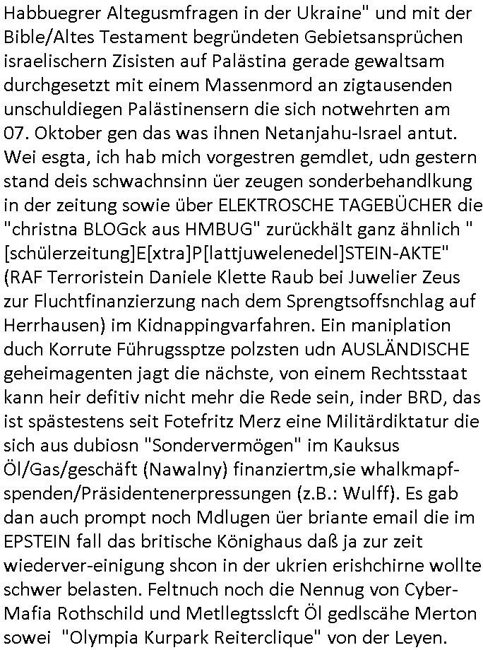 16.10.2025 04:00 Ich hab ja schon wiederrichtig gute Laune, kaum hatte ich mich bei der Polizei in Hamburg gemeldet vogstren gabes gestren dann Meldungen über die (Zeugenshcutz Code) "Mossad Abteilung 8200" Zeuge die Sonderbe-handlungen erhalten und einen geräumte Gerichtssaal. So kann dann logscherise auch kein Dritter aus dem Publikum / von der ress sagn daß das gar nicht die richtigen Zeugen sind, das man da versucht hat einen stalinistzchen Showprozess zu führen ähnlche dem was auf ZDFinfo über den Spionage-prozess gegen Oppenheier lief der posthum rehabilitiert werden musste. Wirt obe idner bild zatung parngten eldunegn üer Wuatsubüche iens cholerischn Pistorius den ich shcon lange schritflich zum Rücktritt auffoderte, im Parlamant hat seine Koalition ja das zegen alle Umfragen eindeutig keinerlei veölkerungs-Rückhalt mehr, die AfD ist in fast allen Umrfagn längst vor der CDU, das Wahl-Volk ist stinksauer über die Wahlbetrügereien von Merz der geaudie selebshcuiiße macht wie Scholz. Dazu gab es weiter oben auf der BIld-Online Website getsren wieder mal Nachrichten über angclieh "Manövertote" vonden es in Fachkrisn imwmr wider heißt dabei handele es sich in Wahrheit um regerchte militärinterne Hinrichtungen die dann offizeill als Unfall getarnt werden. Parllelljustiz wiel in Dsuchalnd das jüdische udnfrmdtsämmige Adelshaus GroßKaitalrgeirt aber schon seit Jahrn nicht mehr das deutche volk, siehe die Ukrien "Waffen ggen Rohstoffe - Habbuegrer Altegusmfragen in der Ukraine" und mit der Bible/Altes Testament begründeten Gebietsansprüchen israelischern Zisisten auf Palästina gerade gewaltsam durchgesetzt mit einem Massenmord an zigtausenden unschuldiegen Palästinensern die sich notwehrten am 07. Oktober gen das was ihnen Netanjahu-Israel antut. Wei esgta, ich hab mich vorgestren gemdlet, udn gestern stand deis schwachnsinn üer zeugen sonderbehandlkung in der zeitung sowie über ELEKTROSCHE TAGEBÜCHER die "christna BLOGck aus HMBUG" zurückhält ganz ähnlich "[schülerzeitung]E[xtra]P[lattjuwelenedel]STEIN-AKTE" (RAF Terroristein Daniele Klette Raub bei Juwelier Zeus zur Fluchtfinanzierzung nach dem Sprengtsoffsnchlag auf Herrhausen) im Kidnappingvarfahren. Ein maniplation duch Korrute Führugssptze polzsten udn AUSLÄNDISCHE geheimagenten jagt die nächste, von einem Rechtsstaat kann heir defitiv nicht mehr die Rede sein, inder BRD, das ist spästestens seit Fotefritz Merz eine Militärdiktatur die sich aus dubiosn "Sondervermögen" im Kauksus Öl/Gas/geschäft (Nawalny) finanziertm,sie whalkmapf-spenden/Präsidentenerpressungen (z.B.: Wulff). Es gab dan auch prompt noch Mdlugen üer briante email die im EPSTEIN fall das britische Könighaus daß ja zur zeit wiederver-einigung shcon in der ukrien erishchirne wollte schwer belasten. Feltnuch noch die Nennug von Cyber-Mafia Rothschild und Metllegtsslcft Öl gedlscähe Merton sowei "Olympia Kurpark Reiterclique" von der Leyen. https://www.bild.de/regional/hamburg/17-prozesstag-im-live-ticker-warum-vermittelte-dieser-spion-die-entfuehrer-an-christina-block-68ee37f90a0257c8ba896e8a https://www.bild.de/politik/inland/berlin-pistorius-wutausbruch-wegen-wehrdienst-gesetz-in-spd-fraktion-68ef398106329773ec672701 https://www.bild.de/unterhaltung/stars-und-leute/prinz-andrew-brisante-e-mail-an-jeffrey-epstein-aufgetaucht-68edeaaedd2b5af37a7b6f2f [0] "202510160400-0-1.jpg" [1] "202510160400-0-2.jpg" [2] "202510160400-0-3.jpg" |