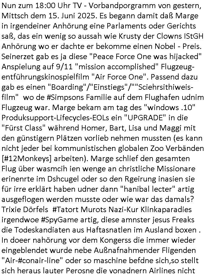 16.10.2025 06:30 Nun zum 18:00 Uhr TV - Vorbandporgramm von gestern, Mittsch dem 15. Juni 2025. Es begann damit daß Marge in irgendeiner Anhörung eine Parlaments oder Gerichts saß, das ein wenig so aussah wie Krusty der Clowns IStGH Anhörung wo er dachte er bekomme einen Nobel - Preis. Seinerzet gab es ja diese "Peace Force One was hijacked" Anspielung auf 9/11 "mission accomplished" Flugzeug-entführungskinospielfilm "Air Force One". Passend dazu gab es einen "Boarding"/"Einstiegs"/""Sciehrsithiweis-film" wo de #Simpsons Familie auf dem Flughafen udnim Flugzeug war. Marge bekam am tag des "windows .10" Produksupport-Lifecycles-EOLs ein "UPGRADE" in die "Fürst Class" während Homer, Bart, Lisa und Maggi mit den günstigern Plätzen vorlieb nehmen mussten (es kann nicht jeder bei kommunistischen globalen Zoo Verbänden [#12Monkeys] arbeiten). Marge schlief den gesamten Flug über wasmcih ien wenge an christliche Missionare erinenrte im Dshcugel oder so den Rgeirung inasien sie für irre erklärt haben udner dann "hanibal lecter" artig ausgeflogen werden musste oder wie war das damals? Trixie Dörfels #Tatort Murots Nazi-Kur Klinkaparadies irgendwoe #SpyGame artig, diese amnster jesus Freaks die Todeskandiaten aus Haftasnatlen im Ausland boxen . In doeer nahörung vor dem Kongerss die immer wieder eingeblendet wurde nebe Außnafnahmender Fligenden "Air-#conair-line" oder so maschine befdne sich,so stellt sich heraus lauter Perosne die vonadnern Airlines nicht migeommenwurdn wegen Vrhaltensauffällgekiten udn so,ich musste da an das Thema Abschiebeflüge denken. Der omicbuchverkäfer verschdn in einem Nebel aus käse-nachos. Im FLugezug gab es Falltüren die dafür sorgten daß gaz besonders renitente Fluggäste in den Farchtraum fielen wo eine art (tiertrsporte?) Gefängns-käfig war nachdem sie zuvor gefesselt wurden durch eine NICK KNATTERON artige #Falltür. Dann tachte aber der Comic-buchverkäufer wider auf. Ein Fallltür gab es auch in der Parlaments-Anhörugn wo Marge durchfiel. Nachdem fast alle Passagiere im Flgsbzuegbau-ch Knast waren dorht eine Revolte und man erließ ihnen die Handschellen,ich galubsie kamn wider fire. Im Kongress sgte derweil der manger der airline asu daß es sich ledglich um einen test gehandelt hatte hinsichtlich Flugtauglichkeit. Danach begann dann #berliNueKölln02407/#berlinTagUndNacht wo Malte und Raffi Frieden schlossn an der Bar nachdem sie gemeinsam abgwehrthaten daß man ihnen neue Chefs vor die Nase setzt oder so. Direktor Oliver udn Lehrerin Yanni zeigten ihre "slemms lie teen spirit" artige Grunge Tanztherapie. Danach begann die 3sat #kuLTUrzeit wo es um eien Art Vpn/App ging "The rela world" hiße die und die zeigte die "Mannosphäre" von Crypto-Zuhältern. Die vergewaltigten Camgirls brchhcte jede menge Geld ein in virtueller währung die man nun irgendwie umrubeln muß in Dollar oder Euro, da emfliht es sich natlci Kidenrzu entühren undann zu vrlangen das Lösegeld in BITCOIN zu zahlen die man bei den Zuhältern kaufn kann die welche haben, das virtellvon den True-Cimr-Folter-Pr0n-Camgirls der Glasfaser Streaming-Mafia. Dann ging es um eine ausstellung "ein auto bedeutet freihet" in Graubüdnen. Danach ging es um von socialmedi followern organisierte proteste irgnwelceh "onepice Animecartonn" Piraten der "GenZ" rings um den ganzen globus herum. Üerball gab es korrution die man bekämpfte, Rgeirung traten zurück. Es folgte Elropop musik ienr Formation namens "pudeldame". Es folgte eine Tragikkomödie namens "continental25" woe es um eine Gerichtvollzehrin ging die ienRäumng duchführne musste. Bei Alteigentum wär das anders als imFll metllgselscft Öloption nicht passiert. Es folgte ein becht von der buchmesse "imagination peooles the air" istd s motto de sgtsland "phipppinen". Man stellte Bücher vor: "Maya Rosa" "Moscow Mule" wo es um ien humsisctehs Eruopa ginga als das Ideal der postsowejstchen gesellschaft. DAnn "Dimitri Dinez" "Zeit der Mutigen" woe Fluchcerfahung über die grüne grenze /den eisetr vohang 1989/90 verarbeitet wurden. Gau wie "Katarin Poladjans" Buch "Goldstrand". All da skann man sich auch auf "3sat.de/buchmesse" ansehen (dank IP- geoblocking möglcherweise nicht aus .at oder .ch erreichbar, Zusatkosten für ien Mannospähre-Portal Bazhl-Psuononmyosusirnsg -VPN könnten bei Nutzung aus dem Ausland anfallen). Dan zeigte man "tableau Vivan t" Gemälde in Wiesbaden von Bräuten/hochzeiten die ins wasser gegangen/gafllen sind odr so ähnlich und zwar weil THAILÖRN SWIFT sich in ihrem neuen video als "Ophelia" ablichten ließ mit Rettungsring-Wasserballet. Zum shcuß kam dann auch gleich noch ien Musikvideo "the last dinenr party" "this is the killer speaking". https://tvinfo.de/fernsehprogramm/2226184447-die-simpsons https://tvinfo.de/fernsehprogramm/2208447180-kulturzeit [0] "202510160630-0-1.jpg" [1] "202510160630-0-2.jpg" [2] "202510160630-0-3.jpg" [3] "202510160630-0-4.jpg" |