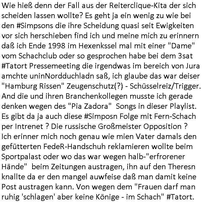 16.10.2025 16:00 Wie hieß denn der Fall aus der Reiterclique-Kita der sich scheiden lassen wollte? Es geht ja ein wenig zu wie bei den #Simpsons die ihre Scheidung quasi seit Ewigkeiten vor sich herschieben find ich und meine mich zu erinnern daß ich Ende 1998 im Hexenkssel mal mit einer "Dame" vom Schachclub oder so gesprochen habe bei dem 3sat #Tatort Pressemeeting die irgendwas im bereich von Jura amchte uninNordduchladn saß, ich glaube das war deiser "Hamburg Rissen" Zeugenschutz(?) - Schüsselreiz/Trigger. And die und ihren Branchenkollegen musste ich gerade denken wegen des "Pia Zadora" Songs in dieser Playlist. Es gibt da ja auch diese #Simposn Folge mit Fern-Schach per Intrenet ? Die russische Großmeister Opposition ? Ich erinner mich noch genau wie mien Vater damals den gefütterten FedeR-Handschuh reklamieren wollte beim Sportpalast oder wo das war wegen halb-"erfrorener Hände" beim Zeitungen austragen, ihn auf den Theresn knallte da er den mangel auwfeise daß man damit keine Post austragen kann. Von wegen dem "Damen darf man ruhig 'schlagen' aber keine Könige - im Schach" #Tatort. https://www.bild.de/unterhaltung/trennung-bei-jack-white-erst-schenkt-er-ihr-die-wohnung-dann-trennt-sie-sich-von-ihm-68e78f0ed3ab2139f9f11549 https://www.bild.de/unterhaltung/stars-und-leute/kripo-ermittelt-schlager-ikone-jack-white-tot-aufgefunden-68f0b76b34e731de12f55672 [schachbild: könig "schlägt" könig] Ehescheidung bis zum Ableben hinausgezögert? https://www.daserste.de/unterhaltung/krimi/tatort/sendung/zugzwang-100.html https://simpsons.fandom.com/wiki/Magnus_Carlsen https://de.wikipedia.org/wiki/Garri_Kimowitsch_Kasparow [0] "202510161600-0-1.jpg" [1] "202510161600-0-2.jpg" |