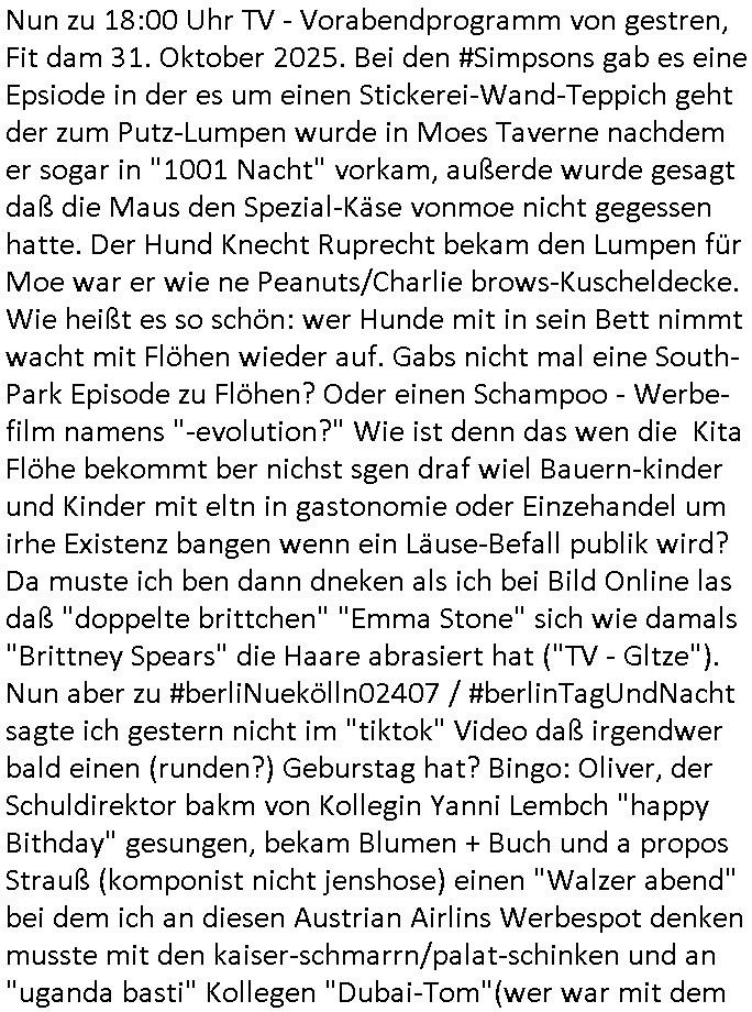 01.11.2025 09:30 Nun zu 18:00 Uhr TV - Vorabendprogramm von gestren, Fit dam 31. Oktober 2025. Bei den #Simpsons gab es eine Epsiode in der es um einen Stickerei-Wand-Teppich geht der zum Putz-Lumpen wurde in Moes Taverne nachdem er sogar in "1001 Nacht" vorkam, außerde wurde gesagt daß die Maus den Spezial-Käse vonmoe nicht gegessen hatte. Der Hund Knecht Ruprecht bekam den Lumpen für Moe war er wie ne Peanuts/Charlie brows-Kuscheldecke. Wie heißt es so schön: wer Hunde mit in sein Bett nimmt wacht mit Flöhen wieder auf. Gabs nicht mal eine South-Park Episode zu Flöhen? Oder einen Schampoo - Werbe-film namens "-evolution?" Wie ist denn das wen die Kita Flöhe bekommt ber nichst sgen draf wiel Bauern-kinder und Kinder mit eltn in gastonomie oder Einzehandel um irhe Existenz bangen wenn ein Läuse-Befall publik wird? Da muste ich ben dann dneken als ich bei Bild Online las daß "doppelte brittchen" "Emma Stone" sich wie damals "Brittney Spears" die Haare abrasiert hat ("TV - Gltze"). Nun aber zu #berliNuekölln02407 / #berlinTagUndNacht sagte ich gestern nicht im "tiktok" Video daß irgendwer bald einen (runden?) Geburstag hat? Bingo: Oliver, der Schuldirektor bakm von Kollegin Yanni Lembch "happy Bithday" gesungen, bekam Blumen + Buch und a propos Strauß (komponist nicht jenshose) einen "Walzer abend" bei dem ich an diesen Austrian Airlins Werbespot denken musste mit den kaiser-schmarrn/palat-schinken und an "uganda basti" Kollegen "Dubai-Tom"(wer war mit dem nochmal zusmen, Milla oder Emmi?) Milla die nicht krditwürdigw ar bekm vonKrim Geld gelihen daß dieser seienrmutre inder fimra geklaut hatte wie Mila S*usryt ihn dazu agestiftet hat scheinbar. Dann begann die 3sat Kukturzet wo es auch um ansgteinflößende Geräusch ging woe kder dann oft denken es spukt: Passend zum (Mieter vertreiben mit ausgesetzten Mäusen-)problem kam eine Ghostbusters Reportage wo man mit Kamera- fallen versuchte Spuk-gespenster-geräuschen deikdern angst machn auf den Grund zu gehen. Es ging dabei auch um als angebliche Halluzinationen bezeichnete Phänomene. Wen man etwa Angst vor in Verbände gewicklte "Verletztete" = ägytsche Mumien hat.Di Kiat Kider abnisch extr inKlopaor iegwcklt um mich in Panik zu versetzen wiel ch er mdizinasg gemachter Erfahrung mshr al skstsch gegüer stehe, zu rrcht wie sich später herausstellte. Inde rkita haic mal gelerent daß als iM Manäver Verwundet amrikertee kein medizin bekomen düfen wen mankrieg sepilt dmit sie ncht widerfsterehen und erneut angreifen beim Kirgsspiel. Ich fnd ds richtg mies daß man denen nicht helfen durfte. Dann ging es um Booktok Berichte über schzre Farbschnitt - bücher (also nicht gshcästbrichte/Bilanzen) mit schwarz auf schwarzem Klappentextdruck oder so daher nannet sich diese Texte-Gattung wohl DARK-ROMANCE. Ei evterin desgernesnamens "Jane S. Wonda" stet ich Buch "toxic" vor was aber nichts mit Satsnisten Sekten - BDSM und K.O.-Drops Vergiftungs - Vergewaltigungen zu tun hat siehe #Hexenkessel Bad homburg Presmteetein 1998 Kidnapping Kinder Entwicklungbericht in Fom von Harry Potter Büchern schibar verfasst von Drogen - Adptions- udn Kinderhandel Miliue Hebammen wie dieser Asia - freundin "melanie boss" die mit dem 3sat #Kulturzeit Redakteur "chstan Metz" zusmmen war als der bei mir im Abiturjahrgang 1995 der humboldtschule HG war. Danch ging es um irgendwelche Adelige- Reitecliquen Humor: die wunderbare Welt der Einhörner. Ob das was mit Speeren / dem Gnadenstoß für Schlachtrösser zu tun hat? Soviel zum Postkutschenraub-Universum. Dacnh ging es um irgendelch "gemälde" mit irgendwas "verbogenem", wo ist das Kidner-Bilderbuche tier und wie macht es? (mcDonalds Songs / Lämmerschweigen)? Danach Musik "the clearing" von "wulff alice" oder so. Es folgte Anwlst/Prozess-Theatr mit "K." wie "kafka", das ist der typ mit der Fitten hebreert Büchervorstellung mit dem Motorrad aus "fridget jones"#morningShow Film. Zum glück geht es da nicht um Tierwohl / Bauernhöfe. Dan stellt die Geshcädgte Guiffrey ihr "Prinz Andrew" fotobuch vor sieh ds them "E(stra)P(lattEdel)STEIN(raub) akte vom Juwelierüerfall nach dem Sprgtsffnshclag auf #herrhausen. WANN WAR DAS naochmal? 1992 doer 89? ZUm shcluß kam nochwas üer Indigene und Amazonas. Hostet ewta jemand seinen apachen - httpd"bei AWS ? Das schülerztungs-WWW-server-ntez ist ein Projekt des Häuptlings der schülerztung ExtraPlatt der HUS in HG? Zum Schcluss dann wieder #berlinNeukölln02407 also #erliTaguncnhct wo Bruno einen vaterschaftest machen will wofür er siner azubine harevomKopf geklaut hat. https://tvinfo.de/fernsehprogramm/2235395669-die-simpsons https://tvinfo.de/fernsehprogramm/2216794259-kulturzeit [0] "202511010930-0-1.jpg" [1] "202511010930-0-2.jpg" [2] "202511010930-0-3.jpg" [3] "202511010930-0-4.jpg" [4] "202511010930-0-5.jpg" |