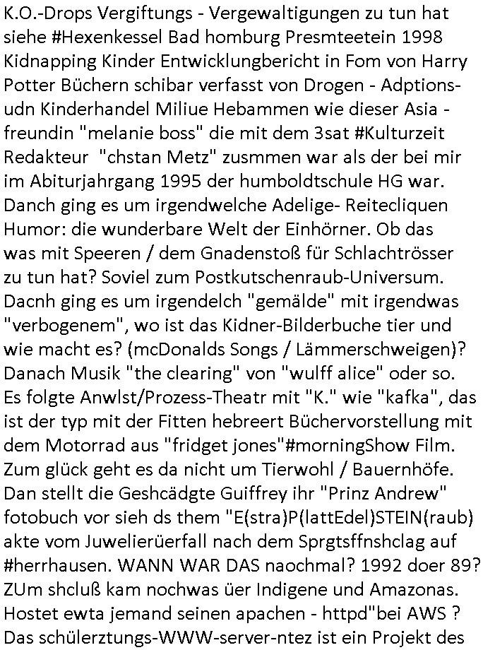 01.11.2025 07:00 Ach gstren, am fritg den 31.Oktober 2025 gab es wieder diese Serie #Suits und ab ca. 16:30 Uhr konnt ich mir die auch ansehen, man zwingt mich ja auch noch ganz andere Kid-napper/Erpresser TV -Sendungen auszuwerten. Mike gRoss wurde im Knast erpresst, und zwar hatte man an-geblich Komprommittierende Selfies von Veghan Markler der Prinz Harry Ehefrau/Freundin "gephotoshopt" und in Umlauf gebracht. Dazu hatten Knastinsassen sie gebeten ihnen Selfies zu schicken udn die Post wurde dann abge-fangen das ist ja fast geneu wie bei der "staatsbesuch Vergewaltigung" der den hasusiter Tükern die Post des Militärs zum Yugo-Brüegrkrioegen an die Schcülerzeitung abfingen (unterschiedsmerkmale fridlibender deutscher und atmwaffefähger brischer Tornados beim Bombarde-ment im Farbeutelattacke auf den grüenen außenmister "Joschka Phisher" Belgrad EIstza) umsie der roten armee zu verkaufen nebst erfundnen PKK-Waffenhandel-Storys zu Brüsslere genralstabs-offizier-autos Fotos auf unsrem Bad Homburg oerb Lernabcher Platanenring Parkplatz. Es kam heraus daß im Bürogbeäde der #Suits Kanzlei zahlreiche Filmsattsisten so tate als würdn sie arbeiten wohl um Kunden/Lieferanten/Aktionäre zu täuschen. Es gab eine Sammelklage deretwegen die Kanzlei all ihre gelder als Schadenersatz zaheln sollte um so Gläubger zu befriedigen, aber bie der Sammelklage fehkte einer der Gläubiger. Der verschuchte per Insolvezbetrügereien sich ien vorteil zu vschffen gegeüber anderen Gläubigern. Der mann tauchte im Büro auf und erpresste duchdas androhen des platzen lassens dess Sammelklage Deals dei zahlung in Form von Comic/Cartoon-Bild-rechten. DAS ERINNERT MCH SOCH SEHR DARAN WIE IM ZUGE DER FAKE-NEWS METALLGESLLSCHFT AG ÖL-OPTIOEN PLEITE BETRÜGER DEN KONZERN UND DIE MANAGER WIE MEINEN VATER ZU ERPRESSEN. Jedenfalls heuter man Film-Statisten an dmitd as Büro nich leer aussieht wen man versuchte Teile davon unterzuvermieten? Was sind denn das für absolut krumme betrüger-touren? Man and neue Mieter: eine nHEDGE (=EDV-HCKE-R) FONDS! Diese Jungs wollten durch INSIDRHANDEL reich werden indem sie geheime Infos der KANZLEI abhörten (etwa an den bürointernen - Netzwerk-Kabeln?) Im Knast wurde Mike gRoss derweil weiter bedroht, er stfa nälich aufs frühere Mandanten die seine Kanzlei eingebuchtet hatte was nach deren Einschätzung auf Fehlurteilen beruhte. Ich teile diese Ansicht nachdem ich gesehen habe wie die Insolvenzbrügerein - Mietverträge machen udn Bild-(urhebrer-)rchte verhökern (di ihen rnicht gehören?) Jedenfafls wurde Mike gRoss im Knast tätlich angegriffen wobei sein Zellenachbar ihm irgendwie half? und nun bot der staatsanwlat ihm einen haftelessungs-freispruch an wenn er gegen diesen als "Verräter" aussage. Man gab ihm sogar einen Tag Hafturlaub damit seine Freundin VEGHAN MAKER (war das die von deiser imLusux-Hotle geplatzten "ORANGEN ENTEN" - hochzeit wie Skeretärin /Ansstgehiflin "DONNA" absagte) ihn überredet. Das ist diese Rothaarige (benutzt die wie Emma Stone ihr rotes Hexen - Haar als Antenne um als Alien - Reptiloide mit ihrem Mutter-schiff zu kommuniziren?) Donna/Rafferty (wenn ich den DTAG-Time-Boogie Titelsong richtig im gedächtnis habe) die mich erinnert hat an diese Pierson von der band B52s respektive Dorotha Popolski von "der Familie Popolski", da ging es um richtig penetrant nach inisderhandel-Infos bohrende Wirtschafts-Journaille zum Thema Metllegsellschaft Öl zeitnah zum Bankvorstand #Herrhausen RAF Sprengstoffanschlag in Bad Homburg. Bei der Frage ob "Onkel Dagobert" beim Milchbar-Terror Schülerzetungs-Artikel hinrreichnder Satire-Detektor sei. https://tvinfo.de/fernsehprogramm/2219091378-suits https://tvinfo.de/fernsehprogramm/2219091381-suits https://tvinfo.de/fernsehprogramm/2219091384-suits https://tvinfo.de/fernsehprogramm/2219091387-suits Kursmanipulation um an Frirmen-Insolvenz-Immobilen zu kommen? TELEKOM DCF-77 ZEIT - STEMPEL https://en.wikipedia.org/wiki/The_Bomb!_(These_Sounds_Fall_into_My_Mind) https://www.bpb.de/kurz-knapp/hintergrund-aktuell/196955/vor-30-jahren-ermordung-von-alfred-herrhausen/ https://www.bild.de/unterhaltung/stars-und-leute/paris-hilton-wird-an-halloween-zur-spears-das-doppelte-britchen-69047e8edf9fa029228eed41 https://www.bild.de/unterhaltung/film-kino/emma-stone-fuer-ihre-rolle-in-bugonia-rasierte-sie-eine-echte-glatze-69023c34fa1876cd16274554 https://de.wikipedia.org/wiki/Evolution_(Film) https://www.fernsehserien.de/south-park/folgen/11x03-laustrophobie-103057 https://www.tvinfo.de/fernsehprogramm/2202975619-south-park [0] "202511010700-0-1.jpg" [1] "202511010700-0-2.jpg" [2] "202511010700-0-3.jpg" [3] "202511010700-0-4.jpg" |