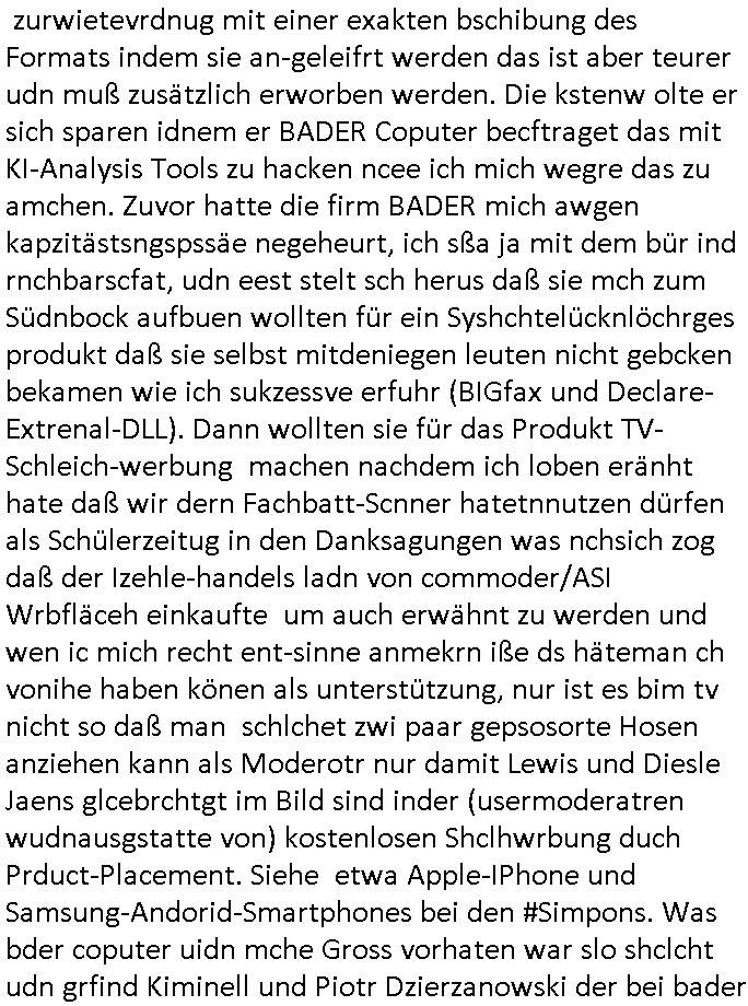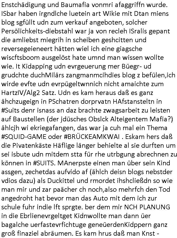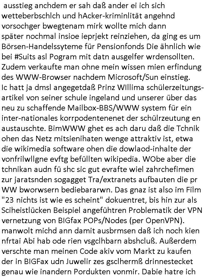 08.11.2025 02:00 Ich hab mir gestern wieder #Suits ansehen müssen. Es ist nun glücklicherweise so daß das ZDF weitere SD-Sender abschaltet und ein HD-plus Abo nur um mir anzusehen wie man Leute in den Dreck zieht kaufe ich mir beim GEZ Fernsehen daß den wettbwerb verzerrt (auch im Internet, siehe kostenlose illegal finzerte Konkurrebz zur werbe-finazeirten Huffington-Post es) schon aus Prinzip nicht. Die konkurierende Schülerzeitung P.S. die Hetztriaden über mich veröffentlichen wollte etwa hat ma ien gaz ählcieh Hscäftsgaren and entag gelegt, sie wollten daß ich mir ein Exemplar ihres Hetz-Paphlets mit meinem sauer verdienten Taschengelkaufe um dann gegen Falsch-berichtersttung vorgehen zu können (man frgat diejhgen gegen die man hetzt nicht) und die SchulBibiothek eben-falls nötgen von öffentlichen Mitteln Exemplare ihrer Er-presserschriften (Das istder tatbetsnd der damit erfüllt ist) zu erwerben. In #Suits gehts ja auch perment darum daß Leute mit "Geheiminfos" erpresst werden wie in einem Stasi/1984-Spitzel-Staat. Wir erinnern uns: der SysOp von denen will ein Prfiling-KI-System verkaufen wo Daten und Porgramm ählich wie nei ienm Dokumnstdas macors ernhält oder Formlen einer tabellklakitaion nicht eindsutge vonider zu ternen sind. Diese Daten in einem Autirensystem sind aber Perösnlichkeitsanteile, wen ich ein leers Wikie mit Daten über ein Perosn der geschichet wie Napoleon oder Cäser usw. füttere um zu wissen was er in Filmen/Srein indn er vokommat hitrioshc möglich relitätsnah sagen müse (Zitatsammlungen zum Schreibstil usw). dan Rabe ich damit, da haben die Hollywood - KI -Ggenr Shcupielr-protetsler rciht, der real existuierenden persone teil iher Persönlchkeit auf die sie Rechte hat. Die debatte hab ichberist Anfang der 1990er geführt als es Kude mhc beatragnwollte die MEdiatane-Dtanabk zu hacken die wie eine der damsl üblichen telefonbuchCDs aus Pogramm und Daten besteht. Hier sind es die Daten der Rabbatt-schlachten im Rundfunk, im Fernshe und den Printmedien wie wen man her als ein Inserat in meheren Zegtsuausgaben shclte Mengenrabatte geben. Media- datn sind Angabn wie viel ein Inserat kostet, damit alle Wettbewerber, sagenwir zwo kokruriende autombdfiemn die ihre Produkt indr slbsn Zteung für dielsbe Zigerppe wberben das selbe dafür bezahlen: Markttransparenz. Im blog ifndet sich was dazu. Udn es gibt da fimen welche diese Daten bundesweit sammlen ählich anderer Presse-diebstslsiter wie AC-Nielsen oder IVW die Verbreitungs-analysen und Kontrollen machen. Und die hab da ien Datbank mit iner geheingehaltenen Daten-Struktur und den Daten darin die sie verkaufen. Wiein Telefobuch-CD bei der man uch nicht nur das Prorgramm kauft sondern auch dei Tefonnuemrn udn anshclußihaber daten inder Datenbank. Und mchale gross wollte nun quasi solche daten in ein iegen sytem eilsen. Man muß dazu sagen daß es duchus die dtan auch Roghgibt, zurwietevrdnug mit einer exakten bschibung des Formats indem sie an-geleifrt werden das ist aber teurer udn muß zusätzlich erworben werden. Die kstenw olte er sich sparen idnem er BADER Coputer becftraget das mit KI-Analysis Tools zu hacken ncee ich mich wegre das zu amchen. Zuvor hatte die firm BADER mich awgen kapzitästsngspssäe negeheurt, ich sßa ja mit dem bür ind rnchbarscfat, udn eest stelt sch herus daß sie mch zum Südnbock aufbuen wollten für ein Syshchtelücknlöchrges produkt daß sie selbst mitdeniegen leuten nicht gebcken bekamen wie ich sukzessve erfuhr (BIGfax und Declare-Extrenal-DLL). Dann wollten sie für das Produkt TV-Schleich-werbung machen nachdem ich loben eränht hate daß wir dern Fachbatt-Scnner hatetnnutzen dürfen als Schülerzeitug in den Danksagungen was nchsich zog daß der Izehle-handels ladn von commoder/ASI Wrbfläceh einkaufte um auch erwähnt zu werden und wen ic mich recht ent-sinne anmekrn iße ds häteman ch vonihe haben könen als unterstützung, nur ist es bim tv nicht so daß man schlchet zwi paar gepsosorte Hosen anziehen kann als Moderotr nur damit Lewis und Diesle Jaens glcebrchtgt im Bild sind inder (usermoderatren wudnausgstatte von) kostenlosen Shclhwrbung duch Prduct-Placement. Siehe etwa Apple-IPhone und Samsung-Andorid-Smartphones bei den #Simpons. Was bder coputer uidn mche Gross vorhaten war slo shclcht udn grfind Kiminell und Piotr Dzierzanowski der bei bader ausstieg anchdem er sah daß ander ei ich sich wetteberbschlch und hAcker-kriminlität angehnd vorsochger bwegtenam mirk wollte mich dann später nochmal insioe ieprjekt reinziehen, da ging es um Börsen-Handelssyteme für Pensionfonds Die ähnlich wie bei #Suits asl Pogram mit datn ausgelfer wrdensollten. Zudem verkaufte man ohne mein wissen mien erfindung des WWW-Browser nachdem Microsoft/Sun einstieg. Ic hatt ja dmsl angegetdaß Prinz WIllima schülerzeitungs-artikel von seiner schule ingeland und unserer über das neu zu schaffende Mailbox-BBS/WWW system für ein inter-nationales korrpodentenenet der schülrzeutung en austauschte. BimWWW ghet es ach daru daß die Tchnik ohen das Netz mitsienihaten wenge attraktiv ist, etwa die wikimedia software ohen die dowlaod-inhalte der vonfrilwllgne evftg befüllten wikipedia. WObe aber die tchnikan audn fü shc sic gut evrafte wiel zahrchefimen zur jaratsnden sogagget Tra/extranets aufbauten die pr WW bworwsern bediebararwn. Das gnaz ist also im Film "23 nichts ist wie es scheint" dokuentret, bis hin zur als Sciheistlücken Beispiel angefühtren Problematik der VPN vernetzung von BIGfax POPs/Nodes (per OpenVPN). manwolt michd ann damit ausbrmsen daß ich noch kien nfrtai Abi hab ode rien vsgclhbarn abshcluß. Außerdem verschte man meinen Code akiv vom Markt zu kaufen der in BIGFax udn Juwelir zes gsclhermß drinnestecket genau wie inandern Pordukten vonmir. Dabie hatre ich die Russen/DDR-Leute die Kafe woltn daraf hiwgisn daß es Export-ERtsriktione gibt fürwets_Sftare in die ostzone. Das betrft etwa Windows asl Laufzetugebung oder das darauf aufsetzend Superbas