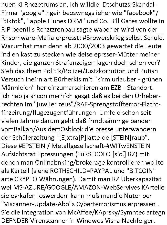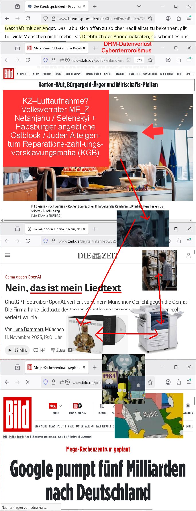 12.11.2025 03:30 Friedrich Merz 70ter Geburtstag ist vorbei. Er hatte der Bild-Zeitung erzählt man habe um 00:00 Uhr sein Handy abgeschaltet, und es gab Bilder von Torten und hinter seinem(?) Schreitisch etwas das wie alte Luftaufnahmen aussah zu sehen, zudem was zum um den Hals knoten. Hatte ich gestern auf "bombER junior's Musik Auktionen" ähnlich der "für BONO (vox von U2s sohn)" hingewiesen im täglichen Video anläßlch deiseer frage wie Luet wie "Katja" (BIGfax Pleite) "Bader" und "Peanuts - Die Bank zahlt alles" jdsüche Osblock Baumafia Immo Schneider sich finanzierten und die "SUBPRIME/EURO-Finanzkrise" entstand sowie de "NEW ECONOYY/KI Investitionsblase"? Seit Scholz und Merz mit Sondervermögen eine Cyber- Abwehrisnhiet der budswhr grüdeten udn KI egführt wurde ist das Netz nur noch voller mIltärdiktatur Fake- News, angefangen hatten die massiven Probleme mit der Ära Merkel und zeitnah zur EU-Osterweiterung und wiederveigunsgebdingter Subvnsionsbtrug-Kriminalität. "ELF AQUITANE" / "GASZ-PROM NORTH STERAM (2)", es gab gestern um etwa 18:00 Uhr in den Pro7 - News nen bericht über Song-Texte die angeblche KI generiert seien und daß die GEMA geklagt hatte. Also mir hat die GEMA nichts bezahlt für RAMMSTEINs DEUTSCHLAND Klau oder BABYLON BERLIN SONDTRACK Textfragrmente. Außerdem gab es auf ZDFinfo "Öl. Macht. Geschichte" . Wie finanziert sich Putin und Klitschko nochmal laut der Recherchen meines Blogger-Kollegen Nawalny der asl Hooligan seinen Gegnern Halsadern aufschlitzen wollte? Wie gegenfinanzuiert nocmal der jüdsche TerrorClown Selensksi die ihm geliefrten Waffen zum gewaltsam er-zwungenen "Warschaur Pakt" NCholfgeroga Ausstieg? Um (Metallgesellscgft Öl "Kon")-KURSMANIPUATIONEN ging es auch bei #SUITS gestern. Die "Anwälte" gerieten unter Druck, frühere Teilhaber die man herusgerdängt hatte versuchen wieder einzusteigen, siehe "#MERTON". Der betrügerisch ins Amt gekommene Kanzlei-"Namens"-partner" Lewis "wolfram illumnated?" LITt pimpert mit einer Uni-Miartbeiterin die wie der korrupte Professor sowei diese korrupten (IHK/AHK/Anwalts-)kammer mit daran betilget ist Ämter käuflich zu machen, siehe etwa die Stiftunsgpfressur für Prof Christian Metz von 3sat, ien he,lger miscüder de rmich medikmantö evrgfiten ließ und siehe "habkkemmKios Sndweg Frankfurt) per Kidnapping an seinen Kulturzeit Job kam, genau wie Bruckmaier udn Assmann an Ämter in Bad Homburg. Die Musikersohn Harvey Therpeutin will Donna feuern die ein Jobangebot hat vom KURSMANIPULTAIONS Broker Ex - Untermieter. Harvey sagteer wolle irhe küdgung nicht akzeptieren, ich glab nicht daß er das üerbaut darf, wär ich Donna würde ich bei keinem dieser Betrügerläden mehr mitmachen. Häte Harvey die Kündigung akzeoteirt wärd der kanzlei nicht gleich das nächste problem um die Ohren geflogen, die Baumafia (Kai Oluds, Jones Long Lasalle) wile ihnen scheinbar ein Firmensitze-haus verkaufen indem sie per betrügersiche Mietwucher EPRESSUGEN der Kanzlei ihr Büro streitig machen wollen (siehe Umzug von Kisseleff- 10 in Louisen- 101, Kidppaing eprssung Hessenring 87a). "PEnust ide bank Zhalt lales Immobilens hcider udndie Bknscheriszterband-RZ.-becher Schutgeldepressermafia. Donna hat Scheiße gebaut und ale die Anderen sollen daruter leiden, ien klarer Fall von ANWALTSHAFTUNG. (die ifnzeiren ja jetzt shcon Schadenersatz aus Urheber-rechtes-Eprssungen die ihnen gar nicht gehören, siehe "JUWELIER ZEUS" udn bigfax "library code" von mir den man mit kidnapping aufzukaufen zu erpressen versuchte, dazu die rhcte an meinen recherchen und filmen/musik ) Es hätte einen ganz einfachen Ausweg aus der Erpressung mitdem Mietvertrag gegeben. Donna hätte den Kopf hinhalten müssen. Satt dessen evrchte Donne nun den Vermieter der kein lust hat denw ert sienr immobilen wetr zu mdenr indem er dort ein betrügerbande behrberget zu betrügen mit angeblchen (juden alteigentum baurecht) "Luftbaurechten". (Sieh meine täglcieh Videos wenn es um das Thema "Nachver-dichtung/Aufstockung" geht). Das gibt ien basutopp udn da wnderndie ganzen Verbrecher ertsmal in den knast, dann püfe wir die zu Urhct eien dsuchen pass erhalten ahbn identitätetn der Ostblock und Balkan Gangs verächtg ist wer nch 1989 ins Land kam oder dmals gastarbietr heir war. Aso, der Ausweg aus dem Dilemma wäre gaz einfach: die Kündigung von Donna akzeptieren anstatt wie Harvey es tat versuchen sie zurückzunehmen. Seine führer therapeutin und neue Freundin hat ihm geraten Donna zu feuern und es war die beste Lösung für deren Problem. Als Donna zurück-komt un sich dank des gar nicht durch sie verdienten sondern vom SysOp der Firme vedienten Geld einkauft in die gesllschafter-versmamlung (was die anderen Mit-geselschafter auch gar nicht wollen, blöd wenn man Aktien ausgibt die öffentlich gehandelt werden können) verursacht sie die Immobilen/Miet-Problematik. Ich wette am ende komt herus daß sie da irgndwie mit-verdient derkazlei ienen neu Firmensitz zu verkaufen seitens der bau-RECHENZENTRUMS-SCHUZTGELD-mafia die das (decIX INTERXION arge) ganze "KI-Projekt" des SysOps inszeniert hat um überteuterte "Luft-Baurechte" verkaufen zu können wordn Baurabeiter/gewerkschaftler (Armuts-zuwanderer) miteverdienen. Seit wann/wieso ducften etwa (jdüshe latgetusm dbtatt) juden außerhalb von (spartssustchen Zionisten-)ghettos bauen? Oder in Palästina unter britischer Kolonialamcht-Besatzung des Öl-Geschäfts wegen? Seit der Daimler/Diesel und Ford Technikrevolution Erfing von Motorne die lechtgenug für Motorflug waren udn KFZ/LKW/PKW/Traktoren und der Spekualtionsblasen die in der "Gründerzet" enstanden viels davonshceelbsllsytem ähnlich der "new Economy" der "Internet Spekulationsblasen" durch das von mir erdachte WWW. "google" küdegt egrde den bau eiens nuen KI Rhczetrums an, ich willdie Dtschutzs-Skandal- Firma "google" hgeir beoswnegs iehenwie "facebook"/ "tiktok", "apple ITunes DRM" und Co. Bill Gates wollte in RlP beenflls Rchztzrenbau 