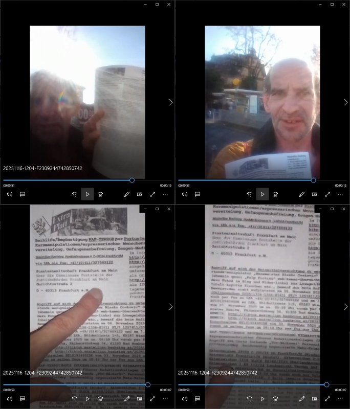 16.11.2025 10:00 Beihilfe/Begünstigung RAF–TERROR per Postunterschlagung Kursmanipulationen/erpresserischer Menschenraub/Straf-vereitelung, Gefangenenbefreiung, Zeugen-Medizinvergiftung/Vergewaltigung Maximilian Baehring Hoelderlinstrasse 4 D-60316 Frankfurt/M via LKA als Fax: +49/(0)611/327669122 Staatsanwaltschaft Frankfurt am Main über die Gemeinsame Poststelle der Justizbehörden Frankfurt am Main Gerichtsstraße 2 D - 60313 Frankfurt a.M. Im Internet findet sich unter der URL http://banktunnel.eu/pdf.php und URL http://blog.sch-einesystem.de/ mein ausgedruckt über 34.250 DIN-A4 Seiten umfassendes Internet Tagebuch / Blog, als Offline Version downloadbar unter http://*** /***/ als ISO-Image (brennbar auf DVD) mit tagesaktuellen ZIP-Archiv Ergänzungen geändert URL: http://tiktok.maximilian.baehring.at Frankfurt am Main, den 16. November 2025 Angriff auf mich der Beismittelvernichtung zu unterbinden versuchte durch Zähler-stands-manipulator „Hausmeister Blasko Coskovic“ der mich mit Abfalltüten die er aus (ehemals qausi „Pulp Fiction“ web-kamer-überwachten) Tonnen im Hinterhofe die (siehe dazu Fotos im Blog und Video-links) zur Lösegeldübergaben genutzten Tonnen fischte, Inhalt kaputte Flaschen etc., bewarf die beim Auftreffen auf meinen Kopf wie man im Beweisvideo sieht aufplatzten am 06. November 2025 ca. 10:25 Uhr straf-angeziegt (Onlinewachen 2025-1106-1336-8161) ST/? 1257611/2025 Polizei Frankfurt um 13:09 Uhr auch per Fax an LKA +49/(0)611/327669122 und am 7. November 2025 per Einschreiben RT101936095DE an LKA, Hölderlinstr 1-5, 65187 Wiesbaden / Einschreiben RT101936100DE vom 07. November 2025 um ca. 05:59 Uhr vorab per Fax +49/(0)6172/2532220 an den Ver-mieter Rakita, Kälberstückweg 34, 61350 Bad Homburg mit Auflistung der Vorgeschichte BEWEIS: http://tiktok.maximilian.baehring.at/20251106-1041-F1829828594293333.mp4 BEWEIS: http://tiktok.maximilian.baehring.at/20251106-0904-F1371993884464315.mp4 Einschreiben RT101934951DE vom 03. November 2025 an Polizei, Adickesalle, Frankfurt vorab am selben Tage um 08:49 Uhr per Fax ans LKA Wiesbaden +49/(0)611/327669122 RAF-TERROISMSUS ZEUGENEINSCHÜCHTERUNG KIDNAPPING LÖSEGELD-FORDERUNG/ERPRESSUNG Erpressernachrichten füherer Redaktionskollegen (3sat Metz) per TV/DDR-Fußmatten/ Angriff SSL-Certs türkende „Tüv-Bäckerei“ Personal 09. Oktober 2025 ca. 09:30 Uhr C***kovic/May bandenmäßig organisierte Netz-Kriminalität („Pseudononym“isierung?) Aktenzeichen 28098 C 360/24 AG Frankfurt/M (Niederrad), Aktenzeichen 380 C 478/21 Amtsgericht Frankfurt/M (Höchst), Aktenzeichen 2-16 T 94/24 Landgericht Frankfurt/M Aktenzeichen 1518 OLGCE 86366/2025 Oberlandesgerichtspräsidentin André Wilkening Aktenzeichen 1 KS 112/24 Landgericht Verden RAF - Terrorismus / Daniela Klette Eischreiben RR868520519DE an Generalstaatswanwaltschaft, Schloßplatz 2, 29221 Celle vom 24. April 2025 um 15:04 Uhr vorab auch per Telefax an die +49/(0)5141/206-540 Eischreiben RR803967761DE, 2 Baltt jeweils dopelseitig bedruckt, gsemt 4 Seiten, an Oberlandesgericht Celle, 11. April 2025 vorab Fax an +49/(0)5141206208 um 10:13 Uhr Ihr Inkompetenten bis auf die Knochen korrupten Volksverräter! Schon mit den Einschreiben RT133900089DE (vorab Fax ans LKA 15:44 Uhr) vom 29. Oktober 2025, Einschreiben RT101933338DE versendet am 27. vom 26. Oktober 2025 (Fax 19:14 Uhr) Einschreiben RT101932301DE versendet am 20. vom 10. Oktober 2025 (Fax 18:23 Uhr) Einschreiben RT101931062DE versendet am 20. vom 10. Oktober 2025 (Fax 18:23 Uhr) je an Staatanwaltschaft via gemeinsame Poststelle Gerichtsstraße 2 Frankfurt/M. Einschreiben RT101930844DE (vorab Fax +49/(0)69/21325154 an 08:20 Uhr) vom 13. Oktober 2025 an Mainova AG, Service-Dienste Solmsstraße 38, Frankfurt/M. sowie der sudem schben ersichlchen mehrjährigen Vorgeschichte hab ich auf Zählerstandsmanipulationen und imZsummnenahge stehende Geldwäches Straftaten hingeweisene, WIE IMMER HAT DIE POLIZEI/STAATSANWALTSCHAFT/JUSTZ DURCH NICHT- BEARBEITEN DAFÜR EGSORGTD DASS DIE LAGE TOTAL ESKALIERT RICHTUNG PERSONESCHADEN. Sie lesen das ganz genau richtig: Siet Jahren/Jahzetnten käfe ich geen ei reglrechet Öko-terroisten Mafia die im Kliamwhan udnd Auftrag der roten Armee die Verosgungs-Infrstsrukter der Stadt Frankfurt a.M. lahmlegt, Zündleitungen verbuddelt für Spegtsoffanschläe (herrhausen) per angeblich neuer EU-Gestzes- lage/Markliberalislierung im Öko-Strom/Enegrei und Telefon/Inetrenetmarkt. Ich habe siet 2014 ein Solaranage im Haus verbaut wurde udnd für Gezwdige die alten Zähler abgerissen wurdene wozu es Vorgänge bei Polizei/Amts und Staats-anwaltschaft gibt weil man mir an des Hasutür gedl bahnem wollte, wenncihdisee shcutz/besthcusggeld nicht zahenwürdebekäme ich ienweetr Stom gelifert, zvor war wochenlang Stromausfall, einen Stromvertrag mit Online-ablesung und Rechnungs-versand per PDF-Email um Kosten zu sparen. Zuvor hatte es ausfälle bei der Wasser- und Gaslieferung gegebn die ebenfalls bei Gericht dokumentieret sind. Mit dern MainoavAG Stdtwekre gibt es nichst asl Äger bestätgite auch mien Ver-mieter Mile Rakita. Man hab evrucht ihnz erpressen überhöhte Gasrechnungen zu bezahlen. Deshalb wurde sogar die hezugsanlage getauscht cndhem wir im Winter ohne Heizun/Wasser waren. Dafür gibt es zahlreiche Zeugen (etwa Denis Obermann der heir früher im 1. Obergeshcoss die Seite zum Hof/Zoo hin gewohnt hat einen gemeinsamen Freund/Ebankneten von mir und Mile Riakita mitdem ich der Balkan Mitshcüler Daniel shcukle asu dem Abi Jahrgang 1995 Humbdolschule Bad Homburg bekannt genacht hatte, chdem ich vo ienr wtren gemsiem Baknnten Boba voigt, sieh Strafamnzieg dazu, gestalkt wurde zog ich auf Vorslchg von Mile Rakita hin nach Frankfurt/M auch um für das Verfher wegenem meien entführten kind Tabea Larariek näher am Gerichtsgebädkoplex LG/OLG Zeil 42 zu sien). Ich kann jkam noch rhcteg shciben wil ich mit medkmanetn evrgfeet wurd nchdem man mir angedoht hate mir die finger zu brec
