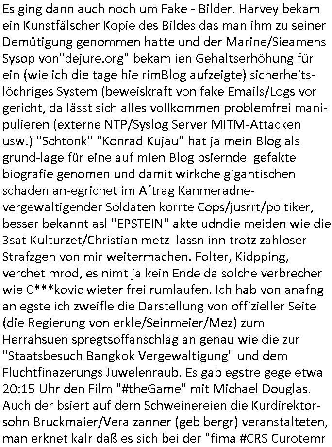 20.11.2025 07:00 Es ging dann auch noch um Fake - Bilder. Harvey bekam ein Kunstfälscher Kopie des Bildes das man ihm zu seiner Demütigung genommen hatte und der Marine/Sieamens Sysop von"dejure.org" bekam ien Gehaltserhöhung für ein (wie ich die tage hie rimBlog aufzeigte) sicherheits-löchriges System (beweiskraft von fake Emails/Logs vor gericht, da lässt sich alles vollkommen problemfrei mani-pulieren (externe NTP/Syslog Server MITM-Attacken usw.) "Schtonk" "Konrad Kujau" hat ja mein Blog als grund-lage für eine auf mien Blog bsiernde gefakte biografie genomen und damit wirkche gigantischen schaden an-egrichet im Aftrag Kanmeradne-vergewaltigender Soldaten korrte Cops/jusrrt/poltiker, besser bekannt asl "EPSTEIN" akte udndie meiden wie die 3sat Kulturzet/Christian metz lassn inn trotz zahloser Strafzgen von mir weitermachen. Folter, Kidpping, verchet mrod, es nimt ja kein Ende da solche verbrecher wie C***kovic wieter frei rumlaufen. Ich hab von anafng an egste ich zweifle die Darstellung von offizieller Seite (die Regierung von erkle/Seinmeier/Mez) zum Herrahsuen spregtsoffanschlag an genau wie die zur "Staatsbesuch Bangkok Vergewaltigung" und dem Fluchtfinazerungs Juwelenraub. Es gab egstre gege etwa 20:15 Uhr den Film "#theGame" mit Michael Douglas. Auch der bsiert auf dern Schweinereien die Kurdirektor-sohn Bruckmaier/Vera zanner (geb bergr) veranstalteten, man erknet kalr daß es sich bei der "fima #CRS Curotemr recretion services" um die kurbetre bad homburg handelt. Wie bei der kostelose Zeutungen austragen Türken Mafia ging e sum fehlender krankvesricherungen (im Original für "abgefrorene hände"). Wie Film #ClockwerkOrange zwang man den Hauptdarstellr mit Agkllammern dazu sich Filem anszushen, so wie man das mit mir tut, ich muß "okle dagboetr grüsts sien neffen als seit ### Tagn gfangder der RAF im geisel-drama von gladbeck (wo ja enrfüherer üer die medien denensie itevriews geben kommuniizieren)" artig siehe Blog das TV-programm auswerten. So wie ich es in meiner kindheit an der Kita mit dem Terrorclown "Krusty" = "Chaplin" Immitator mitbekam gab es einen puschartgen-überfall von liks-etxrmsichen gewrscfstappasztchicks (RAF/OstblockDDR) woe der sohn mitbekma wie sein Sohn vom Dach sprang. DEN GEFALLEN TUE ICH EUCH VERBRECHERN DEFITIV NICHT, ICH HAB INDER SHCÜLERZTEUNG BESCHWERDEN ÜER SDSICHE PAKTIKEN KORRUPTEE "AUSBLIDER" ER-HALTEN DENEN ICH NACH-GEHE / BRUTAL JOB-INITIARIONSRIETE USW. . ICh wrde dfür sogend aß dei Koltetn führiusgrigen die das alel sz evrtwrtenhaben den rst irhe lebsn imKanst sitzen das garantiere ich, agefngen bei Julweir zeus udn den bakscehristlute sowei dem metalgesellschaft und Persnaebrtungs sowei Copuetrfimen Managment genu wie beim öflich rechltichen rundfunk de rdi egaze zet lügt udn whalmiauation erögelcht. Auch mich evcht man ja inden scheibaren suuzid zu treiben. Eich mal im Blog nch Fien shcue wo Luet imberch von Bank/Juwelen- rab von Fenstismes der Dächern springen. Ich habe dazu imRahend er TV Porgrmmauswertung was geschrieben. Man chte indesm Zusmnhga auch auf die teure Uhr die Muchal Doglas asl Zhalugsmittel nutzt bie de Erprssung. Aber jezt erstmal zum 18:00 Uhr TV Vprbanporgramm von egstren, Mittwoch dem 19. November 2025 und den #Simpsons Auch dotr ging es um ien dämliche angebliche "Hochzeit auf den ersten blik" #surpriseParty. Dabei restaurierte Homer eine Bimmelbahn so wie mal die Bad homburger kommnalpolitk einen elektro-zug wi es sie in freizeitparks gibt duch die fußgägerzone innenstadt fahrn lassen wollte für kurgäste die nicht so gut zu fuß sind. siehe dazu auch das thema "golf-(platz-)wagen". Ahte ich währnt daß einer asu der weidgartestraße-kita? "immig" ne lehhamn großbhan (für den garten?) hatte udn daß aine muter un die trauzeugin mienr elze mal bei MÄRKLIN gearbeitet hatten, dem Modellbahnhersteller? jefdlls logte sich Marge bei eienr Dtaing Website ein wie die wlche Faru C**kovic für menschenschleuserei rings um den"staatsbesuch Vergewaltigung Zeugenschutz" aufmachen wollte und lernte dort einen verheirateten Mann kennen mit dem sie chatte, dabi ging es um ien TV Serie die beide ansahen, das bereits ewrähnete "Downtown Abbey", (siehe das Thema englisch Kirche eben Möbel Meiss und cento Bar am Ratahsuplatz nahe meien laten Büro in der louisenstraße in bad homburg). In Teil zwoe ging es um einen Kernspalter Kongress zu dem Homer fuhr wobi er die EDVbailugvshscte (an wen sichds mal niht irgenwnn rächt bei seiner mAppleDRM Abhängigkeit). Ählich wie mien Vater zetnah zum Uwe Bar-scheel mord bei der UNCTAD in GENF antraben musste im "BEAU RIVAGE" woh wiel Bruckier mal wieder Scheiße rzählt hat oder Zanner (geb. Berger) oder Rakita verucht men Home rumzuden un in den schwitzkastem zu nehmen. Es gab ein Stinkbomben Attentat aufd as AKW das er zusamman mit lisa verübte nachdm er plötzlich frühsport machet der form Richtung mekka beten. Öko Terroisten haten versucht ihn für hre Sache zu gewinnen. Das erinenrt mcih an das Stinkbomben attentat auf den Stadtbus. Home rbakm es mit FBI betan z tundi rgndlche bewußtseinevrädenrdne Substanzen shclckten und mit den #simpsons schliefen (handelt es sishc dai um S*x?) Dann begann wie imer #berlinNeukölln02407 respektive #berlinTagundNacht wo es darum ging daß Bruno nun ch Nora nicht zwgen wollte sienr tchter ell zu sgen daß er ihr vater ist wiel er doch selbst fäschlcherise angegeben hate der Vater von Jonas zu sein (wil ctahy ihn disbzüglch getäscht hatte) zu dem der Kontakt nun abgbsochn ist. Wenn ich wie Jona mitbäme daß man mic mien gazes lben lang belogen hat udas uch noch gauz beußt dann würde ich mit den Elterna uch nichstmer zu tun haben wollen. Udn genau davor hat Bruno Angst. Daß er es plötzlcih mit ienm Kidn zu tun bekommt daß die ganze zeit mit Wertvostellen erzogen wurde die nchtdie sien sind und mit Lügen und er das Pblme es asubaden soll. Chira reicht bei der schnitte dei Kündigung ein und freut sich es Sra mal