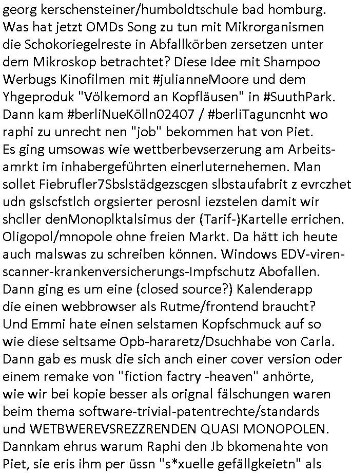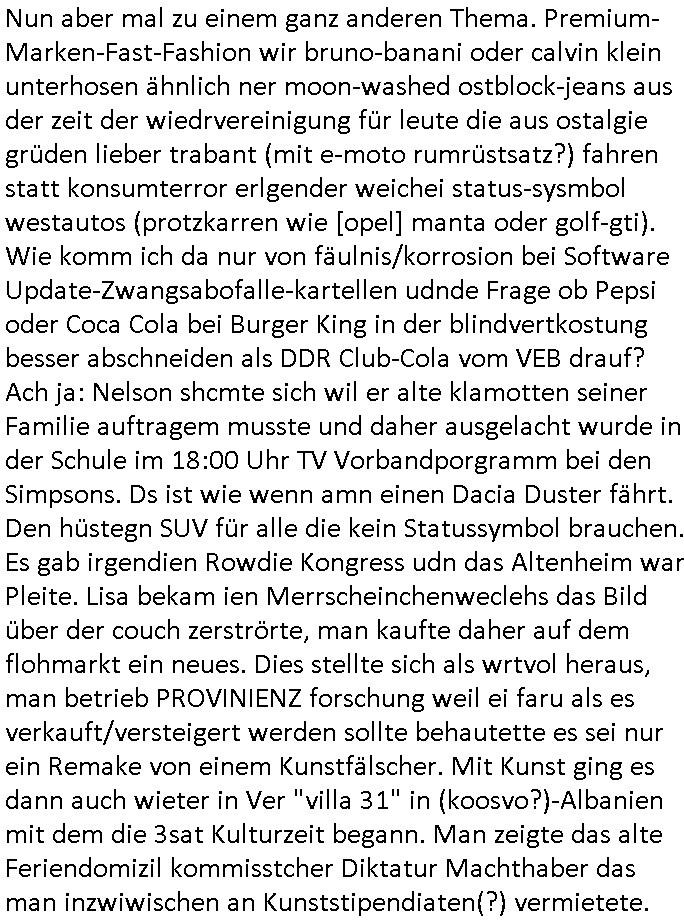 27.11.2025 06:15 Nun aber mal zu einem ganz anderen Thema. Premium-Marken-Fast-Fashion wir bruno-banani oder calvin klein unterhosen ähnlich ner moon-washed ostblock-jeans aus der zeit der wiedrvereinigung für leute die aus ostalgie grüden lieber trabant (mit e-moto rumrüstsatz?) fahren statt konsumterror erlgender weichei status-sysmbol westautos (protzkarren wie [opel] manta oder golf-gti). Wie komm ich da nur von fäulnis/korrosion bei Software Update-Zwangsabofalle-kartellen udnde Frage ob Pepsi oder Coca Cola bei Burger King in der blindvertkostung besser abschneiden als DDR Club-Cola vom VEB drauf? Ach ja: Nelson shcmte sich wil er alte klamotten seiner Familie auftragem musste und daher ausgelacht wurde in der Schule im 18:00 Uhr TV Vorbandporgramm bei den Simpsons. Ds ist wie wenn amn einen Dacia Duster fährt. Den hüstegn SUV für alle die kein Statussymbol brauchen. Es gab irgendien Rowdie Kongress udn das Altenheim war Pleite. Lisa bekam ien Merrscheinchenweclehs das Bild über der couch zerströrte, man kaufte daher auf dem flohmarkt ein neues. Dies stellte sich als wrtvol heraus, man betrieb PROVINIENZ forschung weil ei faru als es verkauft/versteigert werden sollte behautette es sei nur ein Remake von einem Kunstfälscher. Mit Kunst ging es dann auch wieter in Ver "villa 31" in (koosvo?)-Albanien mit dem die 3sat Kulturzeit begann. Man zeigte das alte Feriendomizil kommisstcher Diktatur Machthaber das man inzwiwischen an Kunststipendiaten(?) vermietete. Dann gabs nen Dokufilm über 4 jahre "Sarajevo Sniper" im bosnischen Bürgerkieg. GrahaargieEltern hielten Baby-Fotos von erschossenen Kinder/Anghörgen indie kamera. E shab ien rgerchten Torusu für schießwütige Ausläder gegeben, ähnlich einer Safari. Dann ging es u Porblme mitder finazerung von Renten. Es hieß man wolle die lebenserwartung ud abstszet in einklang bringen mit dem rentenniveau. Möglciheris indem man Leute die dem sozialsystem sonst zur last falen würdn "rin zufällog" in einem krieg tötet? Arbeitpflicht bei leze derFiman man mit gwerkschafts- dder karell-sbaote kaputgemcht hat bei uqis zasgabrite Jobagabot duch ie bundeswerh doer Pflegedinste? Hurra Milätrdiktature, was vsrtegd denn usner milär? uetenehrsiche ufrehiet udn presse zensur woesi sorhcte-kidpping-erpressugen? OHME MICH! Ich hab mien zivildienst fertig udn kann nur des-halb nicht erwabserbaiten wiel man mich zuminvalidn geprügelt udn evrgfte wiet evrfegeltget) hat udn mri dann evrhrte vor egricht gehen zu können siehe meine videos. das ist kein rechtstaat der da verteidgt wird sondern eine poltikdasretller-freak-show eines moskau marionetten-regimes. Aber zurück zur 3sat #Kultrzeit . Dann ging es um irgendwwas mit "Christoph Maler?" und dann um ein "Around the world " Filmfestival. Gefolgt vonienr "only gpod vbes" Ausstellung wo es um Drogen ging. (Gibt es das auch als ne Powerpoint artige Frotalurrichte Diashow für nicht irhem ADHS bewegunsgdarang nachgehe müssende / Online ? ) Dann gab es bullet "der blaue vogel" udn ch frag mchegrde obd as ien snspielung auf schluckspechte ver duterbsoffen "wbeleu" = nato armee dem wider-sacher des unsterblchen "_oten armee" corps ist. Dann gab es ähnlich wie bei den #simspons etwas zu Kunst-fälschung und provinienz hir aber mit gfakten Giacometti skulturen aus irgndiem asien fälschermarkt. (wär es ien ditagbildraubkopie im Netze gewsen das man abfotografert udnudgercukthaätte statt einer skulptur hätten es wohl kien Strafe fürs " #remake " sclher "Blei...gehen" Kunstwerke gegeben). Deshlab bin hc so ien fan von Populärkultur wie "campbells soup" werbung (gebruchkgfik ims Stil "Andy Warhol"s?) Da wir de firma Campbell als rctheinhaber icher nichts dgegen haben daß man sich da Werbplaktedruck ins wohn-zimer hängt udnch noch slbst dfür zhalt wie dfürie Kipoplakat. Ist aj kostnlse Weitervereitung der werbebotschaft und amit imSonen des rechtinhabers der "Auftragskunst". Dann ging es um einen stra_en ("mug_shot"?) Fotograf der ein "Activism Now" Cover agcht hate für dei Vogue. Am Ende Musik von "Milky Chance" "Camoufalge". Warum muß ich nur an die rothaairge aus dem "OMD" Video von wegen verlagsgruppe "Milchstraße" denken und diesen #Simpsons planet "riegel7" der nach der Nummer benannt ist die man telefatstsur artge tippen musste in den ahsusster süßigkeitenautomaten der georg kerschensteiner/humboldtschule bad homburg. Was hat jetzt OMDs Song zu tun mit Mikrorganismen die Schokoriegelreste in Abfallkörben zersetzen unter dem Mikroskop betrachtet? Diese Idee mit Shampoo Werbugs Kinofilmen mit #julianneMoore und dem Yhgeproduk "Völkemord an Kopfläusen" in #SuuthPark. Dann kam #berliNueKölln02407 / #berliTaguncnht wo raphi zu unrecht nen "job" bekommen hat von Piet. Es ging umsowas wie wettberbevserzerung am Arbeits-amrkt im inhabergeführten einerluternehemen. Man sollet Fiebrufler7Sbslstädgezscgen slbstaufabrit z evrczhet udn gslscfstlch orgsierter perosnl iezstelen damit wir shcller denMonoplktalsimus der (Tarif-)Kartelle errichen. Oligopol/mnopole ohne freien Markt. Da hätt ich heute auch malswas zu schreiben können. Windows EDV-viren- scanner-krankenversicherungs-Impfschutz Abofallen. Dann ging es um eine (closed source?) Kalenderapp die einen webbrowser als Rutme/frontend braucht? Und Emmi hate einen selstamen Kopfschmuck auf so wie diese seltsame Opb-hararetz/Dsuchhabe von Carla. Dann gab es musk die sich anch einer cover version oder einem remake von "fiction factry -heaven" anhörte, wie wir bei kopie besser als orignal fälschungen waren beim thema software-trivial-patentrechte/standards und WETBWEREVSREZZRENDEN QUASI MONOPOLEN. Dannkam ehrus warum Raphi den Jb bkomenahte von Piet, sie eris ihm per üssn "s*xuelle gefällgkeietn" als wettbwerbsvrezrrende gegenleistung. malte hat da duchaus rcht, wenn derehemannliebr zu hause essen geht als ins rtsuarent dann ist das unfair weil die frau möglicherisnchtegnasugutkchenkann wie ien profi gastronom der auf koch-einnh