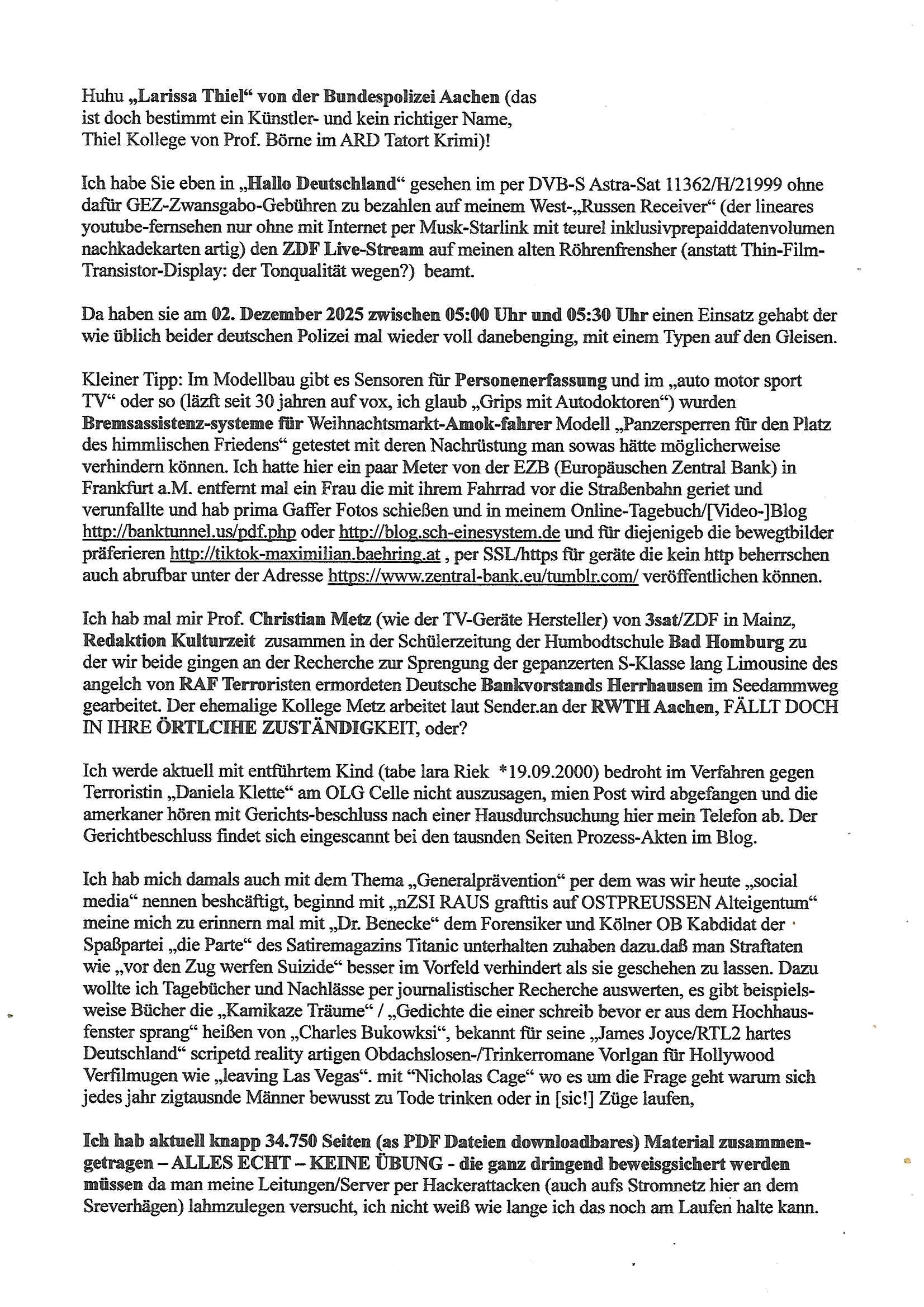 02.12.2025 06:30 Huhu „Larissa Thiel“ von der Bundespolizei Aachen (das ist doch bestimmt ein Künstler- und kein richtiger Name, Thiel Kollege von Prof. Börne im ARD Tatort Krimi)! Ich habe Sie eben in „Hallo Deutschland“ gesehen im per DVB-S Astra-Sat 11362/H/21999 ohne dafür GEZ-Zwansgabo-Gebühren zu bezahlen auf meinem West-„Russen Receiver“ (der lineares youtube-fernsehen nur ohne mit Internet per Musk-Starlink mit teurel inklusivprepaiddatenvolumen nachkadekarten artig) den ZDF Live-Stream auf meinen alten Röhrenfrensher (anstatt Thin-Film- Transistor-Display: der Tonqualität wegen?) beamt. Da haben sie am 02. Dezember 2025 zwischen 05:00 Uhr und 05:30 Uhr einen Einsatz gehabt der wie üblich beider deutschen Polizei mal wieder voll danebenging, mit einem Typen auf den Gleisen. Kleiner Tipp: Im Modellbau gibt es Sensoren für Personenerfassung und im „auto motor sport TV“ oder so (läzft seit 30 jahren auf vox, ich glaub „Grips mit Autodoktoren“) wurden Bremsassistenz-systeme für Weihnachtsmarkt-Amok-fahrer Modell „Panzersperren für den Platz des himmlischen Friedens“ getestet mit deren Nachrüstung man sowas hätte möglicherweise verhindern können. Ich hatte hier ein paar Meter von der EZB (Europäuschen Zentral Bank) in Frankfurt a.M. entfernt mal ein Frau die mit ihrem Fahrrad vor die Straßenbahn geriet und verunfallte und hab prima Gaffer Fotos schießen und in meinem Online-Tagebuch/[Video-]Blog http://banktunnel.us/pdf.php oder http://blog.sch-einesystem.de und für diejenigeb die bewegtbilder präferieren http://tiktok-maximilian.baehring.at , per SSL/https für geräte die kein http beherrschen auch abrufbar unter der Adresse https://www.zentral-bank.eu/tumblr.com/ veröffentlichen können. Ich hab mal mir Prof. Christian Metz (wie der TV-Geräte Hersteller) von 3sat/ZDF in Mainz, Redaktion Kulturzeit zusammen in der Schülerzeitung der Humbodtschule Bad Homburg zu der wir beide gingen an der Recherche zur Sprengung der gepanzerten S-Klasse lang Limousine des angelch von RAF Terroristen ermordeten Deutsche Bankvorstands Herrhausen im Seedammweg gearbeitet. Der ehemalige Kollege Metz arbeitet laut Sender.an der RWTH Aachen, FÄLLT DOCH IN IHRE ÖRTLCIHE ZUSTÄNDIGKEIT, oder? Ich werde aktuell mit entführtem Kind (tabe lara Riek *19.09.2000) bedroht im Verfahren gegen Terroristin „Daniela Klette“ am OLG Celle nicht auszusagen, mien Post wird abgefangen und die amerkaner hören mit Gerichts-beschluss nach einer Hausdurchsuchung hier mein Telefon ab. Der Gerichtbeschluss findet sich eingescannt bei den tausnden Seiten Prozess-Akten im Blog. Ich hab mich damals auch mit dem Thema „Generalprävention“ per dem was wir heute „social media“ nennen beshcäftigt, beginnd mit „nZSI RAUS grafttis auf OSTPREUSSEN Alteigentum“ meine mich zu erinnern mal mit „Dr. Benecke“ dem Forensiker und Kölner OB Kabdidat der Spaßpartei „die Parte“ des Satiremagazins Titanic unterhalten zuhaben dazu.daß man Straftaten wie „vor den Zug werfen Suizide“ besser im Vorfeld verhindert als sie geschehen zu lassen. Dazu wollte ich Tagebücher und Nachlässe per journalistischer Recherche auswerten, es gibt beispiels-weise Bücher die „Kamikaze Träume“ / „Gedichte die einer schreib bevor er aus dem Hochhaus-fenster sprang“ heißen von „Charles Bukowksi“, bekannt für seine „James Joyce/RTL2 hartes Deutschland“ scripetd reality artigen Obdachslosen-/Trinkerromane Vorlgan für Hollywood Verfilmugen wie „leaving Las Vegas“. mit “Nicholas Cage“ wo es um die Frage geht warum sich jedes jahr zigtausnde Männer bewusst zu Tode trinken oder in [sic!] Züge laufen, Ich hab aktuell knapp 34.750 Seiten (as PDF Dateien downloadbares) Material zusammen-getragen – ALLES ECHT – KEINE ÜBUNG - die ganz dringend beweisgsichert werden müssen da man meine Leitungen/Server per Hackerattacken (auch aufs Stromnetz hier an dem Sreverhägen) lahmzulegen versucht, ich nicht weiß wie lange ich das noch am Laufen halte kann. [0] "202512020630-0-1.jpg" |