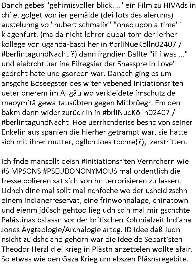 02.12.2025 07:30 Von "#hurraDeutschland" oder wie diese Sendung hieß die vor dem Sat1 - FrühstücksTV #Screenshot lief im 2DF gab es gestern auch Quotenfrauen auf 2DFneo in #Suits mit Prinz Harry Gattin Vegan Makler. Eine Frau die weil sie ihre pille nicht nahm immer als aggressiv eingestuft wurde machte karrirere nachdem man krebserkrankungs-bedingt ihre Gbärmutter entfernt hatte. Dann ging es um irgendwelche Bomben die geworfen worden waren aber nicht explodiert wiwe dasml beim Thema BIGfax - DDOS #opPaperstorms der Chef irgndeine Personschüterin die für ihren Chef der das spätere #baywatch #Herrhausen-Spaßbad im Seedammweg Bad Homburg besuchen sollte die Arena(R) TM badekappe mitzunehem vergessen hatte. Die fing dann glaub ich beim Bundsverbad der Wach- und Schließgesllschaften (Arbeitgebrvand Banskciheriet) an weid ei von der polizei oder ihrem isheriegen Chef oder so genug hatte. Fischliebhaber Max Raabe "Handkse mit Musik" artig. "kiss my as", sagt der Engländer glaub ich. Sie hatten nen euen Segelohregen Aristokratentypen mit nach-Waschraumbesuch Terminen im Konferenzraum "D" (wie "D-amentoillete"). Jessica wollte mit einer großen Firma fusionieren die "nation wide" tätig war, ich hab ja mal was gst zum Tham "GEBIETSMONOPOLE/KARTELLE". Aber der Inahber/Gründungspartenr ahte was dagegen. Das war alles was ich von #Suits mitbekommen habe gestren, das mit den Bomben die eine lange zündschnur haben erinrt michdan daß dei britische(?) Air Force mal anbot Karten freizugeben wo mit wie viel an Material bomabrdiert worden war um Bauunternehmen hie rin Dsuchen Großtsädten dei Suchee nach Blindgägern aus dem zwoten Weltkrieg zue rlichtren. Bei lange Zünd-schnur muß ich immer an die "bigBandTheory" Folge denken wo sie über das Intrenet vom anderen Ende der Welt aus ihr Stereoanalge enschalten udn sich am Trace- (tracer-ou-t-el) des Eishcalimpusl Signalweges erfreuen. Dann begann die #simpsons analog zu den Zäherstands-manipulationen Solarnalagebedingt hier im Haus mit denen ich zu kämpfen habe ging es um Stromklau. Ned Flanders drehte Homer den Saft für sein fahrgeschäft ab. Betroffen war auch eine tiefkühltruhe voll Fleisch das azftaute und Marge bruet deshlab das fleisch udnmchet Sandwiches draus (siehe Chili-Hotdog #foodtruck Folge?) Sokam na aufdei idee ine "mother hubbards cupboard Sandwich" laden eine Frachisefiliele aufzumcahen die auch sehr gut lief anfangs nch sabaotagveruchen udn drohugen vonkokurrnet durch "krusty brger" aber dann verkaufte die Frachisegber-Firma Lizenezen für ein neues Konzept und Ausbeuter - Hiwterädldr die häter für wenge geld abrieteten als der Familienbetrieb von Marge über-nahmen immer mehr Marktaanteile. Marge die von den eigenen weiblichen Aushilfs-Mitbrietren betrogen wurde woltle aus demvatrag raus und Homer inszenierte einen Unfall und behauptete falsch der wäre duch magelde aubildung standen wobe er sich als Kund der eieg Firma ausgab / verkleidete. Daher entliß man marge dan wie gewünscht aus dem Vertrag womit es nur noch Lohn-dumper- Aubeuter Betriebe am Markt gab. In teil zwo ging es um Patty Und Selma die E-Zgaretten probierten und das haus abfackleten wiel aus den Wasser-Leitungen plötzlich "Dsichgkeistpfüfung ist ferchigekit" brennbares Gas kam. Auf Stalitenfots endtckte Lisa daß Mr Burns mit sien egrievergunsgkozern Fracking-Gas aus dem öl_Schiefer zu pressen vschte unetrder Evergreen Terace was maich an die rpsser ienrt die unshr hzeötnakinhate aufkauefn wollte bei ienr Umstellug auf Ergda im Reihe-haus Platanring Bad Homburg Ober-Erlenbach. Gazn ählhc war das bei Mr. Burns. Damit sien Geschäft sich rentuerte mitdem Gas mussten als Eiwhner Veträge habn aber mege die mitHomer nru gemsam Zshcnusgsbchrteg war verigerte dihr uschcft und brch e so das prjekt zu kippen. ahc ds absirt af ienr wahren begebheit. auch daß Mr.Burns veshct hate mit der Poltik zu kuscheln. Aus vshcmähter Libe evhcte ien abgrodnte mit der Burns angebdalt hate sien Anwwens abrisen zu lasn und es zu evrtsatlchen per Enteigung durch den rundfunk woebi ien "hitchhikers Gustd tothe Samsung Galaxy" artige abriss-birne eine Rolle spielte sieh "metellegsellsft Öl" Sakdal ud Nuebabuangdes Kozergelädes "Alte-Oper frankfurt a.M." nach. Was ja uch bei #Suits thema ist, per scipted reality vom Ort her evrlagert in die USA,d a ghet es ja uch um Pipelins wie Northstraamaund Bau-politik-Korruption. Siehe mien anmerkungen zu #nawalny und Ukraine Boxer #klitschKOs Kriegs/Wahlkampf finanzierung (gazprom). Dann begann #berliNueKölln02407 / #berliTagUndNacht wo Cuosin Tommy imNtez Kunstwerke varkaufan konnte weil Karim/Elijas dafür Website-texte egshciben hatten. Erwollte sie ncht am gein ebteilgen.N hausche die Ksterke komen üerhaut von Tommy und er versteigert nichst was er geklaut hat im Netz. Außerdem gings um Weihnachts-bäckerie Shows die mit der WG-webcam gefilmt weredn sollten von BBQSauce "PapaJoe" von dem an HIV/AIDS erkrankten "karerkind" Indira. Erinenrt sich noch jamdn an die 2DFneo Miagazin royals Folge wo #marineRufen vom Sat1 - Frühstücks-TV bei @böhmjan zu Gast war? Ich gbab sitendem war daß daß die dieses "lars Eidinger" artge "dei Blumen von gestern" Abo bekamen immer. Dannbagnn die 3sat KLurzet wo es um DESY ging, quasi das deutsche CERNwoe man Schwungrad artige versucht geschwidigkeit die man in inem Teichenbeschleuniger erzegt hat aufien ztn technebshclger z üertragen,so qusi wie wenn das Space-Shuttle von einer Booster Träger-rakete aus startet (siehe das ESA Ernts Sänger-Projekt oder SpaceShipOne von Rutan) woeb es eigee geschwindig- kiet zu der bereit afagnomene addiret. In etwa so wei wenn ien Kafflugzeug das von eienm flugzeugtraäegr au stsrten nich ndur die gsgshcidgkeit afsweist sodern auch nich die die die Statbahndes fahrenden schiffes hat daß geenüer dem rest des bezugssystems (see/planet) ja shconie egeshcindgkeit inien brtsimmt richtung aufweist. udnas vscht man am cern ja z rofrschn, daß ien träger-t