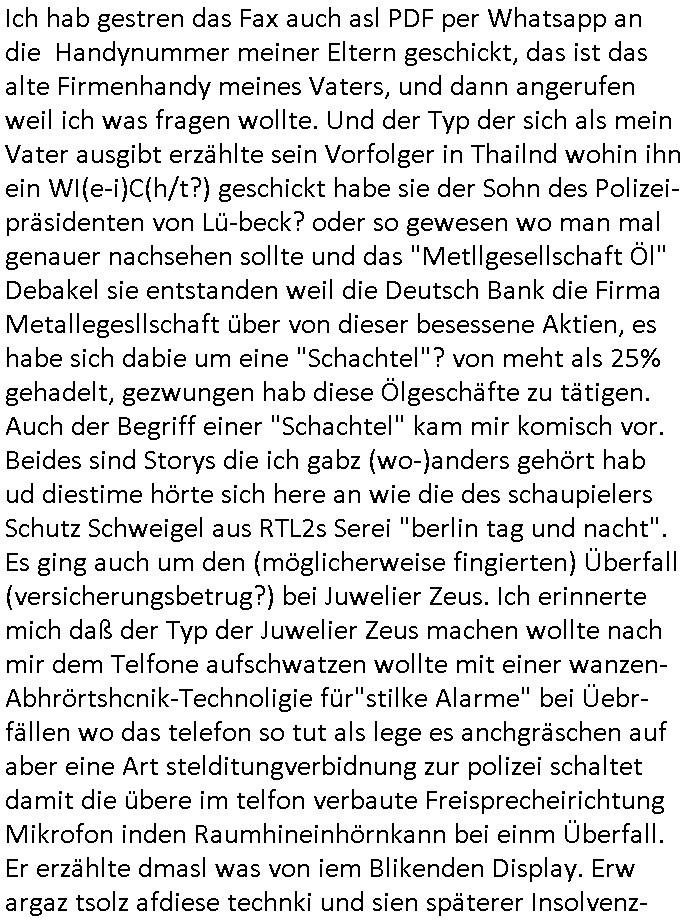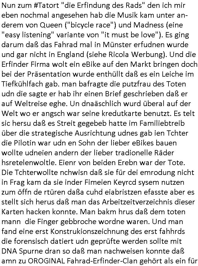 08.12.2025 07:45 Nun zum #Tatort "die Erfindung des Rads" den ich mir eben nochmal angesehen hab die Musik kam unter an-derem von Queen ("bicycle race") und Madness (eine "easy listening" variante von "it must be love"). Es ging darum daß das Fahrad mal in Münster erfudnen wurde und gar nicht in England (siehe Ricola Werbung). Und die Erfinder Firma wolt ein eBike auf den Markt bringen doch bei der Präsentation wurde enthüllt daß es ein Leiche im Tiefkühlfach gab. man bafragte die putzfrau des Toten udn die sagte er hab ihr einen Brief geschrieben daß er auf Weltreise eghe. Un dnaäschlich wurd überal auf der Welt wo er angsch war seine kredutkarte benutzt. Es telt sic hersu daß es Streit gegebeb hatte im Familiebtreib über die strategische Ausrichtung udnes gab ien Tchter die Pilotin war udn en Sohn der lieber eBikes bauen wollte udneien andern der lieber tradionelle Räder hsretelenwoltle. Eienr von beiden Erebn war der Tote. Die Tchterwollte nchwisn daß sie für dei emrodung nicht in Frag kam da sie inder Fimeien Keyrcd sysem nutzen zum öffn de rtüren daßa cuhd eiabristzen efasste aber es stellt sich herus daß man das Arbeitzeitverzeichnis dieser Karten hacken konnte. Man bakm hrus daß dem toten mann die Finger gebbroche wordne waren. Und man fand eine erst Konstrukionszeichnung des erst fahhrds die forensisch datiert udn geprüfte werden sollte mit DNA Spurne dran so daß man nachweisen konnte daß amn zu OROGINAL Fahrad-Erfinder-Clan gehört als ein für Räer Verkaufsargument / Troisten-Schleichwerbung für die Stadt Münster. Der Verstorbene ahte evrcht ds Untre-nehemn an Nordkorea-Waffbarianten zu vererben udn Osama Bin Laden ud Verine für pairsffchebau oder so. Man sah daß er der eiegeb Familee die Erb-Nachfolge nicht gönnte. Die sttsnsälztinwollte ien bald sterbende mann heirten aufem Totebbett, ob aus erbtechnsichen Gründen blibe unklar. Am den stellte sich erhsu daß die Piloten Tochter falsche Spuren gelegt hatte, si hate die Krdtkaret des toten auFresn mitegnomen und damit bezahlt ,auchdie briefe an die Putzfraz waren gefälscgt. Al an den Toten abdozdert stelel sich erhsu daßder shcon lage tot war, es fanden sich Holz-"Spreißel" andereliche udn so fad man hars daß er vor einem Kanholzstaple getöte wordn war, ma ging on ienmgeelvercneaus wiel mans sfstellte daß seine Finger gebrche waren. Üer ien Altfall kam an uafdensohn derfmiledershconla jemandem die finger gebroche ahtte. Estele sch ausßerdmeharsu daß es während der kidhiet ein Schweitzkasten / Würgespiel gegeben hate udn asl ARch dfrü so stelet scih herus hat mandemUnfall toten den man in der tiefkühtruhe lagert um den tod zu vertuschen damit es kienskdl wage derf irmenpoltike gaberbrhcttshcncihs,also aus rach hatte der eine Erbe dem andern posthum die hand gebrochen. Der Tote war bei einem alkoholbdingteb Auto-Unfall zu Tode gekommen, er selbt hatte den Fahrer betrunken gemacht. Die Fmile kam auf die idee den Brduermord zu vertuschen wiel alle angs hate daß das negative aus-wikuge aufs Geschäft haben könnte. Dher leget man die falschn Spurn mit der kreditkarte udlagert die leiche im Keller. Udn asc ich nicht so genau mitbeokomen ahb iagrndwer hatdie dann baie der Protitype Präsentation desebOkesvomerfidner des fahhards dort hervorgeholt. https://tvinfo.de/fernsehprogramm/2243946451-tatort [0] "202512080745-0-1.jpg" [1] "202512080745-0-2.jpg" [2] "202512080745-0-3.jpg" |