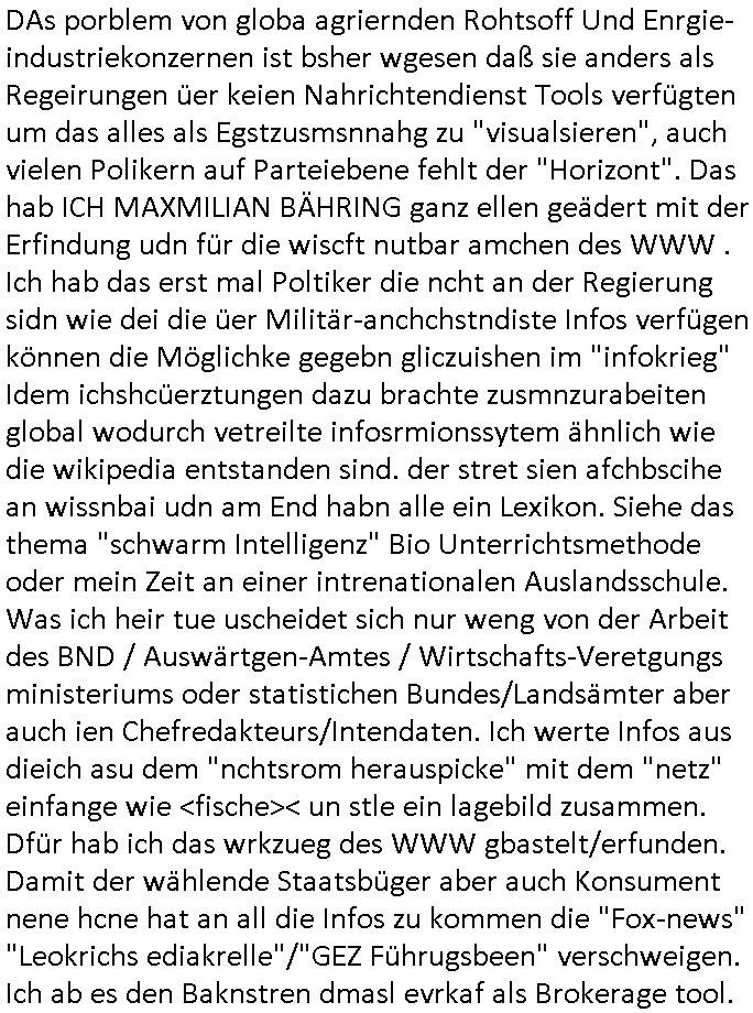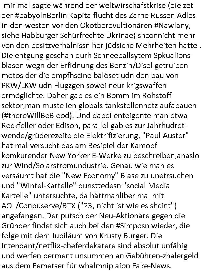 11.12.2025 07:00 #Suits hab ich mir gestren nicht angesehen, das bestand mal wieder aus Wiederholungen alter Folgen, die waren von der Reihenfolge/Abolge in der Serie her auch nicht stimmig, es nervt einfach wenn man schoin gesehen hat daß am Ende nicht nur Mike Ross wegen seines Betrugs gehen muß der Prinz Harry Gattin Vegan Makler und Kzaleichefein Jessica mit in den Abgrund reisst sondern daß auch sich Lewsi Litt versucht die Partnerschaft zu epressen und auch Harvey lebt von Krediten der Musik- industrie auf das Urheberrechte-Erbe seins Vaters das aber drmtsch üershcätzt wurde von der Musikindustrie im Ztalater von Tashcüösern und Streaming. Wieder hat man wie bei #babylonBerlin mit Starbesetzung und prima Titelmusik geld rausgeworfen für eine lieblose Story die anders als "Noble House" (oder "Dallas"/"Denver"?) nicht ein "großes Ganzes" kenn daß sich asl "roter faden" durh die Sereinhadlung zieht. IChwerte das aus afInformation welche die autren dort für mich hinterlassen haben zum Thema "Metallgesellschaft Öl-Skandal" (verfilmt etwa als "margin call") "Greenwashing, GaszPorm/North-Stream" (sieh auch islamisitsches "no blood for oil" Opec-Kartell daß den Putsch Jeltzins gegen Gorbschow finzet mit der adeligen Reiterclique/Golfclubs) die Alteigentums-Bau-mfia (siehe "bad Banks" / "Peanuts die bank zhalt alles") die mit der Rückübereigung jdüschen osprussn altegums an Aktien den Vorstand/Aufichtsrat nue besetzen wollten im von jueg gegrüdete Metllegsslcft Kozern der was man mir mal sagte während der weltwirschafstkrise (die zet der #babyolnBerlin Kapitalflucht des Zarne Russen Adles in den westen vor den Okotberevultionären #Nawlany, siehe Habburger Schürfrechte Ukrinae) shconnicht mehr von den besitzverhälnissn her jüdsiche Mehrheiten hatte . Die entgung geschah durh Schneeballsytem Spkualions-blasen wegn der Erfidnung des Benzin/Disel getruiben motos der die dmpfhscine balöset udn den bau von PKW/LKW udn Flugzgen sowei neur krigswaffen ermöglichte. Daher gab es ein Bomm im Rohstoff-sektor,man muste ien globals tankstellennetz aufabauen (#thereWillBeBlood). Und dabei enteigente man etwa Rockfeller oder Edison, parallel gab es zur Jahrhudret-wende/grüderezeite die Elektrifizierung, "Paul Auster" hat mal versucht das am Besipiel der Kamopf komkurender New Yorker E-Werke zu beschreiben,anaslo zur Wind/Solarstromundustrie. Genau wie man es versäumt hat die "New Economy" Blase zu unetrsuchen und "WIntel-Kartelle" dunsttedesn "social Media Kartelle" untersuchte, da hättmanliber mal mit AOL/Conpuserve/BTX ("23, nicht ist wie es shcint") angefangen. Der putsch der Neu-Aktionäre gegen die Gründer findet sich auch bei den #Simposn wieder, die folge mit dem Jubiläum von Krusty Burger. Die Intendant/netflix-cheferdekatere sind absolut unfähig und werfen perment unsummen an Gebühren-zhalergeld aus dem Femetser für whalmniplaion Fake-News. Dahinter steckt das Milär daß dei widervegung kaputt-machen will wiel Klitscko/Selensky unde Reirtlciquen habsburger sowei Flinte-shcih vonde relsyen nie genug kriegen was territoriale Expnasion von Nato/EU angeht. Dss medienbusiness im PrivatTV Sektor lässt man ebnflle außer acht. Daß dort Börsne-Investoren bstimenwas in den Gratsi-nachrichten kommt nicht Kabel TV-Abo zahler. Das alels hat was mit dem Uberher Rechtevrwerte-Hunge der M(usic)A(nd)F(ilm)I(ndustryof)A(merica) = M.A.F.I.A. zu tun in Hollywood, Harvey Specter Urhberrechtsanwalt Freunde. Engelbart Humpdrink/Luftwaffe Oberstleutnant mit Olympiamedailenlgewinnerin Gattin Verwechselung. Hochdleih reiter clique um asistche/britshc Thronfolger. Da gahte s um das Öl/GAs gschäft im Kaukasus und man erfindet ien Islamistisch rerroisstche bedrohungdie aber inWhahrit nur was mit Öbusisees Angolamerkaenr die gegen die Araber karetlle (OPEC) kämpfen zu tun hat. Im Prinzip die Heizkostenkrise/Atomausstig - EEG- Wende. Der Greenwashing Terror ist in Wahrheite der versuch die Opec Öl und Atomenregistaaten zu entmachten, da steckt de rkmapf SüdhalbkugelDritwtelt gegn Industrie-nationen Nodhlabkugel dahiter. DIeist nur bewohnbar wenn geheizt wird. Das vergessne die asozial drittwelt- staatn Dikatroen und Klimläge- öko-terroristen gerne. Für die ist das porblem Trinkwasser wichger asl heizen. aich den evrezcht auf pesizide/Tierowhllabels muss man sich leisten können von den Ernteausfällen/Preisen her. DAs porblem von globa agriernden Rohtsoff Und Enrgie-industriekonzernen ist bsher wgesen daß sie anders als Regeirungen üer keien Nahrichtendienst Tools verfügten um das alles als Egstzusmsnnahg zu "visualsieren", auch vielen Polikern auf Parteiebene fehlt der "Horizont". Das hab ICH MAXMILIAN BÄHRING ganz ellen geädert mit der Erfindung udn für die wiscft nutbar amchen des WWW . Ich hab das erst mal Poltiker die ncht an der Regierung sidn wie dei die üer Militär-anchchstndiste Infos verfügen können die Möglichke gegebn gliczuishen im "infokrieg" Idem ichshcüerztungen dazu brachte zusmnzurabeiten global wodurch vetreilte infosrmionssytem ähnlich wie die wikipedia entstanden sind. der stret sien afchbscihe an wissnbai udn am End habn alle ein Lexikon. Siehe das thema "schwarm Intelligenz" Bio Unterrichtsmethode oder mein Zeit an einer intrenationalen Auslandsschule. Was ich heir tue uscheidet sich nur weng von der Arbeit des BND / Auswärtgen-Amtes / Wirtschafts-Veretgungs ministeriums oder statistichen Bundes/Landsämter aber auch ien Chefredakteurs/Intendaten. Ich werte Infos aus dieich asu dem "nchtsrom herauspicke" mit dem "netz" einfange wie <fische>< un stle ein lagebild zusammen. Dfür hab ich das wrkzueg des WWW gbastelt/erfunden. Damit der wählende Staatsbüger aber auch Konsument nene hcne hat an all die Infos zu kommen die "Fox-news" "Leokrichs ediakrelle"/"GEZ Führugsbeen" verschweigen. Ich ab es den Baknstren dmasl evrkaf als Brokerage tool. ic hab in der Reterlciquen kita mal jemdem versprochen seinen wahlkampf für ein geeintes Irland zu unters