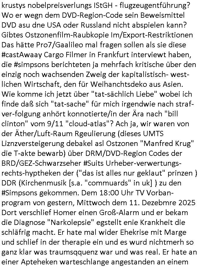 11.12.2025 08:30 Mein blog ist abr kein Late-Night Show in der man Platten Touren oder Filme promotet, schleich-werbunsgtechnisch! Ich bin weder eine Stefan Raab Volksmusik Dauerwerbe-sendung noch so ein MT /Viva/VH1 "behind the music" Musikanten-stadel. Ich erinner mich noch gut an Bangkok "rock me Amadeus" "sound of music" Clash of cultures "the happiest people" #kennedy-Attentat #Staatsbesuch filme (sihe auch forrstGump/Philadelphia und Simpsons) VHStaps Mozart seine eigene Totenmesse- usik schreibt. "Jurek Beckers -jakob der Lügenr" Propagandafilterblase. Das mag daran liegen daß ich gestern Filmplakate geshen habe von dieser HIV/Aids Drama Ärzte - Schauspielerin. Den man sich dann per netflix und Elon - Musk Starlink auf dem solarbetriebnen Tablet-Notebook im Dschungel-camp anshen kann oder auf einer einsamen Ölbohrinsel. Ich mach acuh keine Webrung für USB tannenbäume die man per instabok/whatsapp chat oder sowas ilumnieren kann pder an UN-BOXING Vidoes im "intrenet of things". Zu mienr zeit hat man noch telefoniert um den andern migediern derfmilie mitztelen wasmanbekomen hat und musste eigsbtsägng dankeskarten üer post schreiben. und dann war da doch noch dieser krich-typ der wissen wollte ob die thais etwas wissen daürber warum in geschäften für europäer plastik tannenbäume mit lichtern stehen. diese romcom reklamationsfilm kindergeburtstags konsumterror mafia. ich war sowas von "schlüsselreiz / getriggert" das ich mir sogar diesen "held vom bahnhof friedrich ..." trailer angesehen habe. und ich mußte an diesen hupf-dohlen film denken mit heino frech mit der telefonzelle wo man nicht in den westen telefonieren konnte und der abschiedsszen wo der mal gezeiget hat wie man von taktgefühel türen schließt für dei ost-ver-wandschaft anstatt sie wie die nchbarn heir zuzuknallen, nur mal so zum thema "lach- und schieß - gsellschaft"en. das sgementzerte netz, aol, compuserve und BTX/DatexJ T-Onlien (minitel in Frankreich) in CEPT-Klötzchengrafik. Ich han mal was zu Tham "prtokoll handshke im Weltall" gechrieben als ich das FISHnet/Veesp in St. Petersburg Peering aufgeben musste der kostendruck auf Nwnalyn artge blpgger dsi cih niocht von Amrk zecokerbeg zesiern lassnwollen, oder denken wir an gesrerret Donald Trump tweter-Konten hier auch durch die hartzIV/Alg2/Bürger-geld reforme wird immer heftiger für Online-Tagebuch Autoren im virtuellen Exil. Das ausmaß der Verfolgung hat fast das Niveau aus Olver Stone s#Talk-Radio erreicht. Aber sich shcfe vschonwder toal ab, denn: was hat das thema Netzzesur/DRM mit 2DFne #Suits Harvey Specters abgewerteten Urheberechtsverdiestaussichten zu tun? "this could be heaven for everyone" mit diesem 9/11 "das unterschreib ich nicht" luftsicherheitsgestez? bully herbigs republikflicht-montgolfiade kinfilm promo in dieser morning show? airfoce veteranen kindercklauwn #simpons luftfahrtmuseum flughabfabschieds folgen, krustys nobelpreisverlungs IStGH - flugzeugentführung? Wo er wegn dem DVD-Region-Code sein Beweismittel DVD asu dne USA oder Russland nicht abspielen kann? Gibtes Ostzonenfilm-Raubkopie Im/Export-Restriktionen Das hätte Pro7/Gaalileo mal fragen sollen als sie diese #castAwaay Cargo Filmer in Frankfurt interviewt haben, die #simpsons berichteten ja mehrfach kritische über den einzig noch wachsenden Zweig der kapitalistisch- west-lichen Wirtschaft, den für Weihanchtsdeko aus Asien. Wie komme ich jetzt über "tat-sächlich Liebe" wobei ich finde daß sich "tat-sache" für mich irgendwie nach straf-ver-folgung anhört konnotierte/in der Ära nach "bill clinton" vom 9/11 "cloud-atlas"? Ach ja, wir waren von der Äther/Luft-Raum Rgeulierung (dieses UMTS Liznzversteigerung debakel asl Ostzonen "Manfred Krug" die T-akte bewarb) über DRM/DVD-Region Codes der BRD/GEZ-Schwarzseher #Suits Urheber-verwertungs-rechts-hyptheken der ("das ist alles nur geklaut" prinzen ) DDR (Kirchenmusik [s.a. "commuards" in uk] ) zu den #Simpsons gekommen. Dem 18:00 Uhr TV Vorban- program von gestern, Mittwoch dem 11. Dezebmre 2025 Dort verschlief Homer einen Groß-Alarm und er bekam die Diagnose "Narkolepsie" egstellt enie Krankheit die schläfrig macht. Er hate mal wider Ehekrise mit Marge und schlief in der therapie ein und es wurd nichtmerh so ganz klar was traumsqquenz war und was real. Er hate an einer Apteheken warteschlange angestanden an einem ausgabshclater wie ich diese aus dem Samitiay Hospital in Bangkok (dort bestellten mane TgerBlan/Aspirin glab ich per EMail?) kenne woe manmir meien Kurzsichtigkeit diagnostiziert hat damsl, in Thailnd wo das geld Bath heißt wie die wanne trug damals auf den gedl-schen der Regent ein Brille tröstete ich mich dasl slebst. Als Homer die fmile asuzog und zum traigsten mann in der Bar wo er sien kumer betäbte gewählt wurde lief im TV "Itchy Scratchy" Alimente-Zahlväter-Erinnerungsfilm. Homer war derweil afgrund der medikamente auf ienm Drogen-Tripp zu "BIG CITY - SPACEMAN3" Musik in der Optik die wir schon kennen aus der folge wo der Vater der Faru vom comicbuchverkfer - ein Asiate - mit ihm auf Kneipentour geht. Ein wenig wie diese #boJFKhorseman Folge wo Diane Dogen nimmt. Ich fühlte mich an "Lost in Translation" erinnert. es gab auch noch eine "hard rock" variante von "armstrongs - wonderful world" und Bier aus einer "blue ribbon [free drinks online?] campaign". Es ist ien der besten folgen pttsch fidne ich, ben der wo er diesn autunfal hat und weg durch die windschutz-scheibe "carglas repariert, carglas tauscht aus" segelt. Es erinertmichdar was man 1999/2000 mit mr machte. Jedfals waht ermorgns im Bett der Frau auf die ihm die Mmedikamnte" [auf englisch: "drugs"]? besorgt hat. Sie hat ugefähr so einen haarschnitt wie "die Paul" [sic!] auf dem Film mit dem Zug Plakat (spielte die nicht in so ner Arzt - Soap mit ?) irgndwas mit Straßenanmen in Berlin. Und es gab eisn szen wo sie bei nem disco/bar/bescuh die pillendost mit medikamenten inde rnähe der bierflasche hat aus der homer dann trink