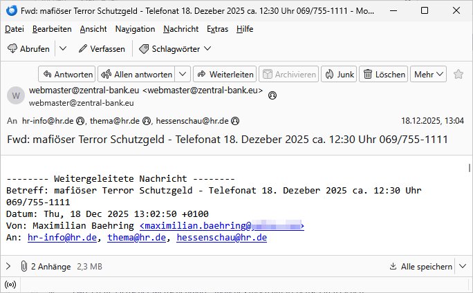19.12.2025 04:30 -------- Nachricht -------- Betreff: Fwd: mafiöser Terror Schutzgeld - Telefonat 18. Dezeber 2025 ca. 12:30 Uhr 069/755-1111 Datum: Thu, 18 Dec 2025 13:05:40 +0100 Von: Maximilian Baehring <maximilian@baehring.at> An: hr-info@hr.de, thema@hr.de, hessenschau@hr.de nochmal von hier falls es im spam filter landet -------- Weitergeleitete Nachricht -------- Betreff: mafiöser Terror Schutzgeld - Telefonat 18. Dezeber 2025 ca. 12:30 Uhr 069/755-1111 Datum: Thu, 18 Dec 2025 13:02:50 +0100 Von: Maximilian Baehring <maximilian.baehring@***> An: hr-info@hr.de, thema@hr.de, hessenschau@hr.de https://www.fr.de/frankfurt/offenbach-sonderermittlungen-zu-brandserie-in-frankfurt-und-93877489.html schauen sie mal am 06./07. Oktober 2020 in mein Blog http://banktunnel.eu/sch-einesystem/20201007.htm kann das als inder mit enführtemkidn voll bestägtigen, das hängt miteinander zusammen https://www.fr.de/frankfurt/scheinrechnungen-aufgeflogen-millionen-euro-betrug-in-sicherheitsbranche-zr-94079175.html https://www.hessenschau.de/panorama/frankfurter-justizskandal-um-korruption-bewaehrungsstrafe-fuer-it-unternehmer-v2,prozess-korruption-102.html Alles Shcutzgelderpressung/Korrution mit Terror Hintergund um von Stalin enteignete jüdische Osblock Altbesitz (treuhand Rowdder/herrahsuen) der (nicht) zurückgegebe werden soll auch Rohtsoff/Öl-Aktien(Elf Aquitaine metallgesellschaft öl/Nalyn/northStream/gazporm /ukraine und gazakrieg) siehe V(ideb)log http://tiktok.maximilian.baehring.at/ oder http:s//facebook.com/maximilian.baehring.9/ http://banktunnel.eu/sch-einesystem/20251218.htm ([1] auch als PDF-Datei (sch-einesystem.168) ([2] zum download unter http://banktunnel.eu/pdf.php #herrhausen#RAFterror#badHomburg#zentralBank http://blog.sch-einesystem.de/ oder https://zentral-bank.eu/tumblr.com/ http://bad-homburg.eu/download/ --- [1] URL-Format http://banktunnel.eu/sch-einesystem/YYYYMMDD.htm YYYY = Year/Jahr, MM = Month/Monat, DD = Day/Tag [2] URL-Format http://banktunnel.eu/tumblr.com/sch-einesystem.###.pdf ### = fortaulfene, seit 84 monatlich um 1 erhöhte Nummer wahlweise als PDF oder HTML Datei, auch per HTTPS (SSL) https://zentral-bank.eu/tumblr.com/sch-einesystem.###.htm === https://www.fr.de/frankfurt/scheinrechnungen-aufgeflogen-millionen-euro-betrug-in-sicherheitsbranche-zr-94079175.html https://www.hessenschau.de/panorama/festnahmen-nach-explosion-vor-shisha-bar-in-offenbach-v3,offenbach-explosion-102.html https://www.hessenschau.de/panorama/explosionen-und-brandanschlaege-im-rhein-main-gebiet-polizei-ermittelt-in-neun-faellen-v3,brandanschlaege-serie-rhein-main-100.html https://www.hessenschau.de/panorama/frankfurter-justizskandal-um-korruption-bewaehrungsstrafe-fuer-it-unternehmer-v2,prozess-korruption-102.html === -------- Nachricht -------- Betreff: Fwd: mafiöser Terror Schutzgeld - Telefonat 18. Dezeber 2025 ca. 12:30 Uhr 069/755-1111 Datum: Thu, 18 Dec 2025 13:04:10 +0100 Von: webmaster@zentral-bank.eu <webmaster@zentral-bank.eu> An: hr-info@hr.de, thema@hr.de, hessenschau@hr.de -------- Weitergeleitete Nachricht -------- Betreff: mafiöser Terror Schutzgeld - Telefonat 18. Dezeber 2025 ca. 12:30 Uhr 069/755-1111 Datum: Thu, 18 Dec 2025 13:02:50 +0100 Von: Maximilian Baehring <maximilian.baehring@yahoo.com> An: hr-info@hr.de, thema@hr.de, hessenschau@hr.de [...] === Datum Name / Rufnummer Dauer (hh:mm) 18.12.25 12:32 0691551111 0:15 18.12.25 12:26 0692578290 0:01 [0] "202512190430-0-1.jpg" [1] "202512190430-0-2.jpg" [2] "202512190430-0-3.jpg" [3] "202512190430-0-4.jpg" [4] "202512190430-0-5.jpg" [5] "202512190430-0-6.jpg" [6] "202512190430-0-7.jpg" |