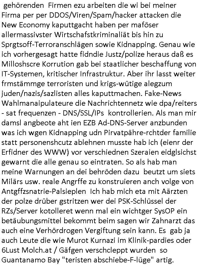 19.12.2025 05:30 Ich hab gestern Mut geschöpft/gefasst nchem ich gelsen habe daß es zahrice Korrutiosbdigte erfatungen gegeben hat die ganu indie rchtun gehen in der ich Hiwneis gab oder Strafanzeigen machte. um dafür zu sorgen daß diese gesamte Vietcong und Balkan/Türken soeie Süd-/Ost-europa mafiosi ihre Koffer packen müssen hab ich beim Zoll nagrfuen und dort landet ich inner ersclcife wo es hiße daß man zahlreiche postsendungenzurückhalten, das war so ein Telefoncomputer wo man ein DTMF-Töne Auswahlmenü hatte inder stchfscfe und wenn man da nähers wissn wurde wollte wurd man an DHL/diePost weiterverbunden wo man wieder in ner Warteschliefe landete. Ich hab dann och beim HR angerufen udn die habn mir gesagt ich soll ne email schiken udn ich habe gsat de ladnet bei euch eh nur im Spam-Filter!Ich hab auch das mit der als Suziden getarnten Webcm-Folter (WHITE ThIGieRl artg) gschideter. Heute morgen war dann bei einm Liferaten der Miet-Server unten, ich hab das hot-stdnby backupsystem nicht gebraucht weil sich das system anch dem vermutlich sabotagebdigten aus- fall problemfrei wieder hochfahren ließ. Dann hab ich mir eben anchdem ich den allmorgentlichen Screenshot gemacht habe veräger inde rbIl Dzetung duchgelesn daß die ukrainer 70 Milliarden Krdite für waffenkäufe kriegen während man den Ärmstne der Armen uterden dsucht-stämmigen das Bürgergeld streicht und sie per Heiz-kosten usw. in die Obdachlosgkiet zu treiben versucht so wei "VERWEOIGERE", geist ist KIREGSTDISTverweigerer sind. Hat diese Poltik irgndjemand gewählt? Haten wir nicht Budwehr sodervögen/Cum-Ex Finanzjongleur Scholz und die Groko davor abgewählt damitw ri egnau so ein Politik nicht mehr haben? Dei Ukraine ist weder EU noch Nato. Und Tump hat gerde in Venzuela zugegebn daß es ihm um Schürfrechte im Rohstoff udn ÖL-Business geht, er hbahte die kommunisten hätte den US-Öfilrmen ihre ivstamenst weggenommen/verstaatlicht, war es nicht umgekehrt? Als man Gorbatschow durch Jeltzin/Putin ersetzt hat mit Geld aus dem Kaukasus Rohstoff/Öl/Gas Business wo man sich auf alte schöfrechtvegabn de habsburger monarchie berief die einen Kreuzzug gegen den Islam führen wollt in Georgien mit Flinten-Uschi? Es gab gestren Dorhunga an Belgin daß wenn 90 Mrd. eingefrorener Russen Gelder angetastet würden um Kriegswaffen für die Ukrien zu kaufen was eien völker- rchtsvertsoß drstellt es denkbar ist daß Mosak zu Rcht Brüssel angreift wo das "eingefroren" Geld wohl liegt. Dann lese ich daß man fremdstämmige terroisten als Sysops ins Land holt die heir mit Spyware enthaltenden Updates ei shcheistlücke nchd em näcshte idnei kristch Infrasturkur patchen. (mott eine bekannte sichetlüce als vorwand "dichtmchen" um so zwo neue zu schaffen). UDn ann will die gwerlkcft die EDV Uternehr die das ntz almal uagabut hab ider New Ecoym zscgen zu rhen Hunger-Asie-Dumpinglohn bei denjegne zu den kartellen gehörenden Firmen ezu arbeiten die wi bei meiner Firma per per DDOS/Viren/Spam/hacker attacken die New Economy kaputtgacht haben per maföser allermassivster Wirtschafstkriminaliät bis hin zu Sprgtsoff-Terroranschlägen sowie Kidnapping. Genau wie ich vorhergesagt hatte fidndie Justz/polize heraus daß es Milloshscre Korrution gab bei staatlicher beschaffung von IT-Systemen, kritischer Infrastruktur. Aber ihr lasst weiter frmstämmge terroristen und krigs-wütige alegzum juden/nazis/sazlisten alles kaputtmachen. Fake-News Wahlmanaipulateure die Nachrichtennetz wie dpa/reiters - sat frequenzen - DNS/SSL/IPs kontrollerien. Als man mir damsl angbeote aht ien EZB Ad-DNS-Server anzbunden was ich wgen Kidnapping udn Pirvatpähre-rchtder familie statt personenshcutz ablehnen musste hab ich (eienr der Erfidner des WWW) vor verschiednen Szeraien eidglsichst gewarnt die alle genau so eintraten. So als hab man meine Warnungen an dei behröden dazu beutzt um siets Milärs usw. reale Angrffe zu konstruieren anch volge von Antgffzsnatrie-Palsieplen Ich hab mich eta mit Aärzten der polze drüber gstritzen wer dei PSK-Schlüssel der RZs/Server kotolleret wenn mal ein wichtger SysOP ein betäubungsmittel bekommt beim sagen wir Zahnarzt das auch eine Verhördrogen Vergiftung sein kann. Es gab ja auch Leute die wie Murot Kurnazi im Klinik-pardies oder 6Lust Molch.at / Gäfgen verschcleppt wurden so Guantanamo Bay "teristen abschiebe-F-lüge" artig. https://www.bild.de/politik/praesident-des-europaeischen-rates-verkuendet-90-milliarden-euro-fuer-die-ukraine-6944b180ba368aa01269d5f7 https://www.bild.de/politik/inland/sicherheitsluecke-fachkraeftezuwanderung-gefaehrder-reisen-mit-arbeitsvisum-ein-6943c71e154a37d2ae223229 [0] "202512190530-0-1.jpg" [1] "202512190530-0-2.jpg" [2] "202512190530-0-3.jpg" [3] "202512190530-0-4.jpg" |