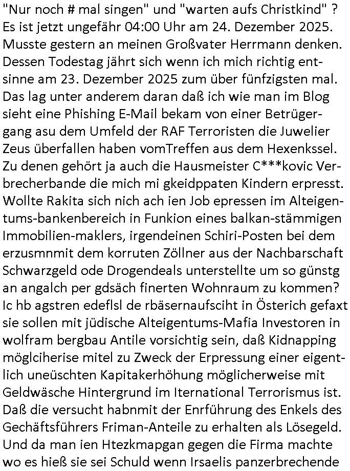 "Nur noch # mal singen" und "warten aufs Christkind" ? Es ist jetzt ungefähr 04:00 Uhr am 24. Dezember 2025. Musste gestern an meinen Großvater Herrmann denken. Dessen Todestag jährt sich wenn ich mich richtig ent-sinne am 23. Dezember 2025 zum über fünfzigsten mal. Das lag unter anderem daran daß ich wie man im Blog sieht eine Phishing E-Mail bekam von einer Betrüger- gang asu dem Umfeld der RAF Terroristen die Juwelier Zeus überfallen haben vomTreffen aus dem Hexenkssel. Zu denen gehört ja auch die Hausmeister C***kovic Ver-brecherbande die mich mi gkeidppaten Kindern erpresst. Wollte Rakita sich nich ach ien Job epressen im Alteigen-tums-bankenbereich in Funkion eines balkan-stämmigen Immobilien-maklers, irgendeinen Schiri-Posten bei dem erzusmnmit dem korruten Zöllner aus der Nachbarschaft Schwarzgeld ode Drogendeals unterstellte um so günstg an angalch per gdsäch finerten Wohnraum zu kommen? Ic hb agstren edeflsl de rbäsernaufsciht in Österich gefaxt sie sollen mit jüdische Alteigentums-Mafia Investoren in wolfram bergbau Antile vorsichtig sein, daß Kidnapping möglciherise mitel zu Zweck der Erpressung einer eigent- lich uneüschten Kapitakerhöhung möglicherweise mit Geldwäsche Hintergrund im Iternational Terrorismus ist. Daß die versucht habnmit der Enrführung des Enkels des Gechäftsführers Friman-Anteile zu erhalten als Lösegeld. Und da man ien Htezkmapgan gegen die Firma machte wo es hieß sie sei Schuld wenn Irsaelis panzerbrechende