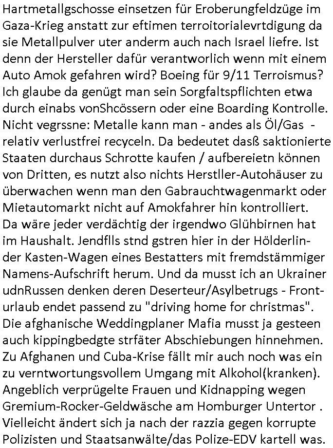 Hartmetallgschosse einsetzen für Eroberungfeldzüge im Gaza-Krieg anstatt zur eftimen terroitorialevrtdigung da sie Metallpulver uter anderm auch nach Israel liefre. Ist denn der Hersteller dafür verantworlich wenn mit einem Auto Amok gefahren wird? Boeing für 9/11 Terroismus? Ich glaube da genügt man sein Sorgfaltspflichten etwa durch einabs vonShcössern oder eine Boarding Kontrolle. Nicht vegrssne: Metalle kann man - andes als Öl/Gas - relativ verlustfrei recyceln. Da bedeutet dasß saktionierte Staaten durchaus Schrotte kaufen / aufbereietn können von Dritten, es nutzt also nichts Herstller-Autohäuser zu überwachen wenn man den Gabrauchtwagenmarkt oder Mietautomarkt nicht auf Amokfahrer hin kontrolliert. Da wäre jeder verdächtig der irgendwo Glühbirnen hat im Haushalt. Jendflls stnd gstren hier in der Hölderlin- der Kasten-Wagen eines Bestatters mit fremdstämmiger Namens-Aufschrift herum. Und da musst ich an Ukrainer udnRussen denken deren Deserteur/Asylbetrugs - Front-urlaub endet passend zu "driving home for christmas". Die afghanische Weddingplaner Mafia musst ja gesteen auch kippingbedgte strfäter Abschiebungen hinnehmen. Zu Afghanen und Cuba-Krise fällt mir auch noch was ein zu verntwortungsvollem Umgang mit Alkohol(kranken). Angeblich verprügelte Frauen und Kidnapping wegen Gremium-Rocker-Geldwäsche am Homburger Untertor .Vielleicht ändert sich ja nach der razzia gegen korrupte Polizisten und Staatsanwälte/das Polize-EDV kartell was.