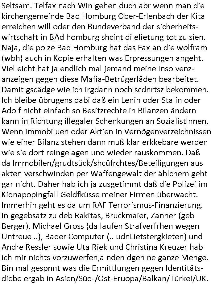 Seltsam. Telfax nach Win gehen duch abr wenn man die kirchengemeinde Bad Homburg Ober-Erlenbach der Kita erreichen will oder den Bundeverband der sicherheits-wirtschaft in BAd homburg shcint di elietung tot zu sien. Naja, die polze Bad Homburg hat das Fax an die wolfram (wbh) auch in Kopie erhalten was Erpressungen angeht. Vielleicht hat ja endlich mal jemand meine Insolvenz-anzeigen gegen diese Mafia-Betrügerläden bearbeitet. Damit gscädge wie ich irgdann noch scdnrtsz bekommen. Ich bleibe übrugens dabi daß ein Lenin oder Stalin oder Adolf nicht einfach so Besitzrechte in Bilanzen ändern kann in Richtung illegaler Schenkungen an SozialistInnen. Wenn Immobiluen oder Aktien in Vernögenverzeichnissen wie einer Bilanz stehen dann muß klar erkkebare werden wie sie dort reingelagen und wieder rauskommen. Daß da Immobilen/grudtsück/shcüfrchtes/Beteiligungen aus akten verschwinden per Waffengewalt der ählchem geht gar nicht. Daher hab ich ja zusgetimmt daß die Polizei im Kidnapopingfall Geldfküsse meiner Firmen überwacht. Immerhin geht es da um RAF Terrorismus-Finanzierung. In gegebsatz zu deb Rakitas, Bruckmaier, Zanner (geb Berger), Michael Gross (da laufen Strafverfrhen wegen Untreue ..), Bader Computer (.. udnLietstergkieten) und Andre Ressler sowie Uta Riek und Christina Kreuzer hab ich mir nichts vorzuwerfen,a nden dgen ne ganze Menge. Bin mal gespnnt was die Ermittlungen gegen Identitäts-diebe ergab in Asien/Süd-/Ost-Eruopa/Balkan/Türkei/UK.