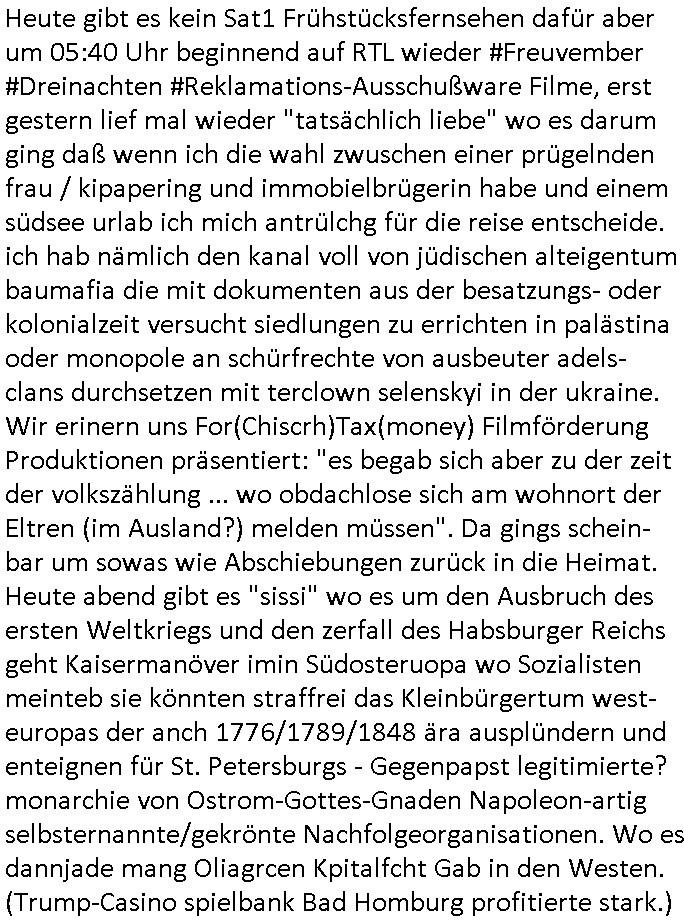 Heute gibt es kein Sat1 Frühstücksfernsehen dafür aber um 05:40 Uhr beginnend auf RTL wieder #Freuvember #Dreinachten #Reklamations-Ausschußware Filme, erst gestern lief mal wieder "tatsächlich liebe" wo es darum ging daß wenn ich die wahl zwuschen einer prügelnden frau / kipapering und immobielbrügerin habe und einem südsee urlab ich mich antrülchg für die reise entscheide. ich hab nämlich den kanal voll von jüdischen alteigentum baumafia die mit dokumenten aus der besatzungs- oder kolonialzeit versucht siedlungen zu errichten in palästina oder monopole an schürfrechte von ausbeuter adels- clans durchsetzen mit terclown selenskyi in der ukraine. Wir erinern uns For(Chiscrh)Tax(money) Filmförderung Produktionen präsentiert: "es begab sich aber zu der zeit der volkszählung ... wo obdachlose sich am wohnort der Eltren (im Ausland?) melden müssen". Da gings schein-bar um sowas wie Abschiebungen zurück in die Heimat. Heute abend gibt es "sissi" wo es um den Ausbruch des ersten Weltkriegs und den zerfall des Habsburger Reichs geht Kaisermanöver imin Südosteruopa wo Sozialisten meinteb sie könnten straffrei das Kleinbürgertum west-europas der anch 1776/1789/1848 ära ausplündern und enteignen für St. Petersburgs - Gegenpapst legitimierte? monarchie von Ostrom-Gottes-Gnaden Napoleon-artig selbsternannte/gekrönte Nachfolgeorganisationen. Wo es dannjade mang Oliagrcen Kpitalfcht Gab in den Westen. (Trump-Casino spielbank Bad Homburg profitierte stark.)