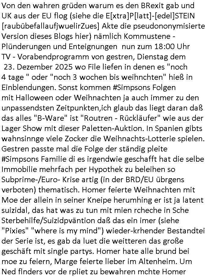 Von den wahren grüden warum es den BRexit gab und UK aus der EU flog (siehe die E[xtra]P[latt]-[edel]STEIN [raubübefallaufjwuelirZues] Akte die pseudononymisierte Version dieses Blogs hier) nämlich Kommustene - Plünderungen und Enteignungen nun zum 18:00 Uhr TV - Vorabendprogramm von gestren, Dienstag dem 23. Dezember 2025 wo File liefen in denen es "noch 4 tage " oder "noch 3 wochen bis weihnchten" hieß in Einblendungen. Sonst kommen #Simpsons Folgen mit Halloween oder Weihnachten ja auch immer zu den unpassendsten Zeitpunkten,ich glaub das liegt daran daß das alles "B-Ware" ist "Routren - Rückläufer" wie aus der Lager Show mit dieser Paletten-Auktion. In Spanien gibts wahnsinnge viele Zocker die Weihnachts-Lotterie spielen. Gestren passte mal die Folge der ständig pleite #Simpsons Familie di es irgendwie geschafft hat die selbe Immobilie mehrfach per Hypothek zu beleihen so Subprime-/Euro- Krise artig (in der BRD/EU übrgens verboten) thematisch. Homer feierte Weihnachten mit Moe der allein in seiner Kneipe herumhing er ist ja latent suizidal, das hat was zu tun mit mien rcheche in Sche Sterbehilfe/Suizidpväntion daß das ein imer (siehe "Pixies" "where is my mind") wieder-krhender Bestandtei der Serie ist, es gab da luet die weitteren das große geschäft mit single partys. Homer hate alle brund bei moe zu feiern, Marge feierte lieber im Altenheim. Um Ned flnders vor de rpliet zu bewahren mchte Homer