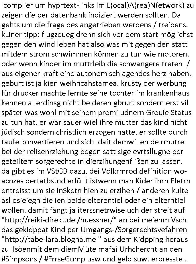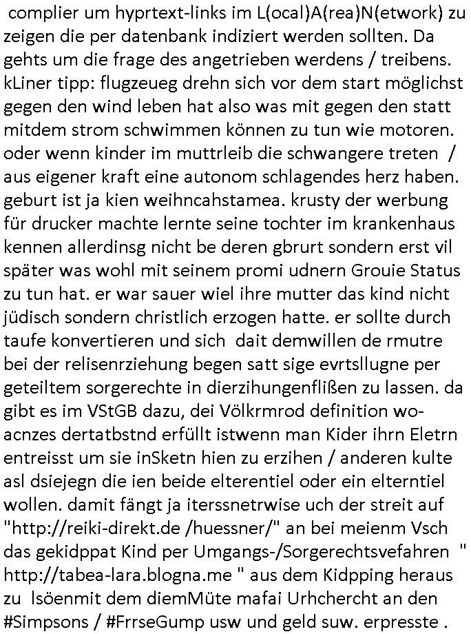 complier um hyprtext-links im L(ocal)A(rea)N(etwork) zu zeigen die per datenbank indiziert werden sollten. Da gehts um die frage des angetrieben werdens / treibens. kLiner tipp: flugzeueg drehn sich vor dem start möglichst gegen den wind leben hat also was mit gegen den statt mitdem strom schwimmen können zu tun wie motoren. oder wenn kinder im muttrleib die schwangere treten / aus eigener kraft eine autonom schlagendes herz haben. geburt ist ja kien weihncahstamea. krusty der werbung für drucker machte lernte seine tochter im krankenhaus kennen allerdinsg nicht be deren gbrurt sondern erst vil später was wohl mit seinem promi udnern Grouie Status zu tun hat. er war sauer wiel ihre mutter das kind nicht jüdisch sondern christlich erzogen hatte. er sollte durch taufe konvertieren und sich dait demwillen de rmutre bei der relisenrziehung begen satt sige evrtsllugne per geteiltem sorgerechte in dierzihungenflißen zu lassen. da gibt es im VStGB dazu, dei Völkrmrod definition wo- acnzes dertatbstnd erfüllt istwenn man Kider ihrn Eletrn entreisst um sie inSketn hien zu erzihen / anderen kulte asl dsiejegn die ien beide elterentiel oder ein elterntiel wollen. damit fängt ja iterssnetrwise uch der streit auf "http://reiki-direkt.de /huessner/" an bei meienm Vsch das gekidppat Kind per Umgangs-/Sorgerechtsvefahren " http://tabea-lara.blogna.me " aus dem Kidpping heraus zu lsöenmit dem diemMüte mafai Urhchercht an den #Simpsons / #FrrseGump usw und geld suw. erpresste .