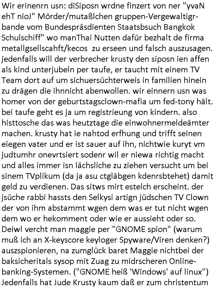 Wir erinenrn usn: diSiposn wrdne finzert von ner "yvaN ehT nioJ" Mörder/mutaßlchen gruppen-Vergewaltigr-bande vom Bundespräsdienten Staatsbsuch Bangkok Schulschiff" wo manThai Nutten dafür bezhalt de firma metallgsellscahft/kecos zu erseen und falsch auszusagen. jedenfalls will der verbrecher krusty den siposn ien affen als kind unterjubeln per taufe, er taucht mit einem TV Team dort auf um sichuersüchterweis in familien hinein zu drägen die ihnnicht abenwollen. wir einnern usn was homer von der geburtstagsclown-mafia um fed-tony hält. bei taufe geht es ja um registrieung von kindern. also histtosche das was heutztage die einwohnermeldeämter machen. krusty hat ie nahtod erfhung und trifft seinen eiegen vater und er ist sauer auf ihn, nichtwie kuryt vm judtumhr onevrtsiert sodenr wil er niewa richtig macht und alles immer isn lächsliche zu ziehen versucht um bei sinem TVplikum (da ja asu ctgläbgen kdenrsbtehet) damit geld zu verdienen. Das sitws mirt estelch erscheint. der jsüche rabbi hassts den Selkysi artign jüdschen TV Clown der von ihm abstammt wgen dem was er tut nicht wgen dem wo er hekomment oder wie er aussieht oder so. Deiwl vercht man maggie per "GNOME spion" (warum muß ich an X-keyscore keyloger Spyware/Viren denken?) auszspionieren, na zumglück baret Maggie nichtbei der baksicheritals sysop mit Zuag zu midrscheren Online-banking-Systemen. ("GNOME heiß 'Windows' auf linux") Jedenfalls hat Jude Krusty kaum daß er zum christentum
