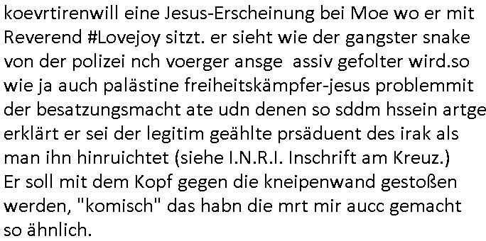 koevrtirenwill eine Jesus-Erscheinung bei Moe wo er mit Reverend #Lovejoy sitzt. er sieht wie der gangster snake von der polizei nch voerger ansge assiv gefolter wird.so wie ja auch palästine freiheitskämpfer-jesus problemmit der besatzungsmacht ate udn denen so sddm hssein artge erklärt er sei der legitim geählte prsäduent des irak als man ihn hinruichtet (siehe I.N.R.I. Inschrift am Kreuz.) Er soll mit dem Kopf gegen die kneipenwand gestoßen werden, "komisch" das habn die mrt mir aucc gemacht so ähnlich.