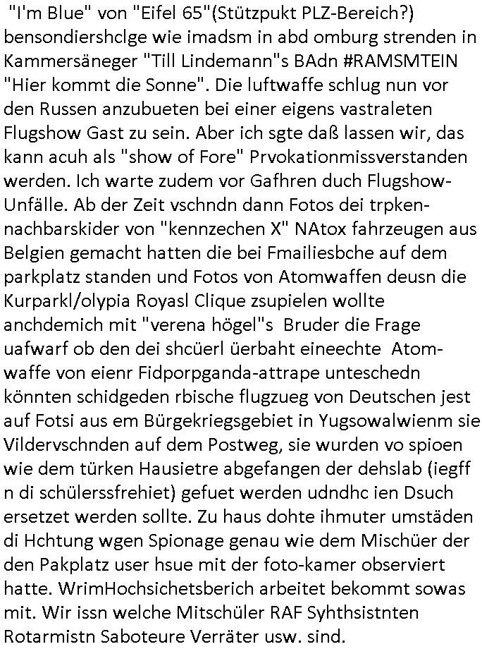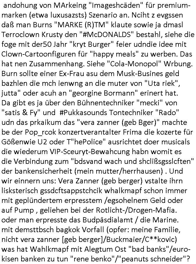 30.12.2025 06:30 Nun zum 18:00 Uhr TV - Vorabendprogramm von gestern, Montag dem 29. Dezember 2025 wo ich mir glücklicher-weise mal kein #berliNueKölln02407/ #berlinTagUndNacht und mir auch keinerlei 3sat #Kulturzeit ansehen musste, lediglch die #Simpsons. Anders als sonst erzählte eine "Stime aus dem Off" von Jazz und über Bluttransfusionen und "Whisper of Times" Polar-Eiswürfel die imprtert werdneosllten von Smithers. Burns erinnerte sich an Zeiten zurück in denen er noch große rauschende Fest gefeiert hatte. Ählich der "richie rich" fider wo er auf den "dopplets Lottchen" Bart trifft und diesem einredet seine neue, reiche Halbgeschwister Familie wolle ihn (Waise?) ermorden um an sein Geld, das Familienvmögen zu kommen. Es ist diese Folge wo Lenny urplötzlich zu viel Geld kommt und jedem, einem Vorwerk Vertretr gleich, einen Staubsagerrober besorgt. Aufder otilette eisn Luxushotels trifft er dann zufällig auf jemanden der genau aussieht wir er und tauscht mit ihm wie im "Erich Kästner" Roman "die Rollen". Das erinnert michienweng an dei [(Reklamations-)Weihnachts-]Film und TV Crews vonde Promihochzeute im Kindergarten in der Bad Homburg Ober-Erlenbacher Weingartenstraße und das in "Tic-Tac-Toe" Musik für die nchwelt fest-gehaten miese Verhalten von Bruckmaier, Hohmann udn andern asu der shcüleztung bei einem Pressmeeting mit großen Zteungen (Welt) und Fernsehen (darunter 3sat). Wo irgendeiene Ostbclok udnmarinsosldten Verbrecher- bande die nicht von mir eingeladen worden war unser Schülerzeitunsgbüro verwechselnd mit dem SV - Büro dort Besprechungen wegen Sorgerechtsfällen abhielt. Uterdensbcuhern war auch ien Homsexueller Hooligan. Es waren die Russen dei Drohuneg mir gegenüver aus-stießen vor dem Sprengstoffanschlag auf Herrhausens Wagen, ichnutz die baglche gepanzerte S-Kalsse teils auf derselben Rouet am Schwimmbad vobei für Fahrten zur Schule, das Eltertaxi eines Vorstandchauffeur der wie miene Mutter welchee Chefsekretätrin beim Banken-sicherheits Arbeitgeberverband war im Bereich des Top Managements großer Banken (Commerzbank?) arbeitete. Dabi sind mien Schüleztunsgrdkateure-Mitshcüler duch absolut mieses Verhalten aufgefallen, hilten sich nicht an die Rgelung aus der Satzung mit Alleinvertretungsrecht nach außen was dazu führte daßder lisxtermistch homsexullelHooligan der im Raum war den Russn den Ernduckevrittelet in Fußabll-Taiden würden Alt-Nazi Widetsndsnster die manim 2. Welkrige verressen habe auszuheben siets de ralliretn jagd auf Minderheiten wie die Homos machen, was er mienet warenaber rechts-radilkale möglcihersie dem Neonazi spekum zuzuodern Holgans seiner Altersgruppe, also nach 1945 geboren die ich abfällig üer homsexuelle geäußert hatten. Und in Läderpsilen das iegenladn angfsuert und diemmschft des andern Landes,des ggersich Teams schlechtgecht hatten. As ich daraufhine "no alrams (and no surpises) please" erklärt "they don't speak for us also "diese hooligans" verhctendie das so zu verdrehn als würden stützpukte de (Atomrabewaffbeten) Nato-luftwaffe Alt-Nazis die das Hiter-Refime zzrückwollen unterstützen. Dann kam es zu ien PRIGOSCHIN -PUTSCH artgen Zwischenfall wo die Osblcok Offiziellen Stützpunkte im Nato Gebiet angerifn wollten udnbahteten Tornado Kampfjets (die ich bi drbschen RAF Im Einstaz sind Nachegerüstet als Erstaz für wegen altersschwäche ausgenusterten Vulcan Atom-bomber) mit ihem fortgschritten Terrain-Follwing-Radar Autpilotensystem sein asl "Stealth Cruise Missile" die gegen Kirgschtkovstionen verstoßenwürden eibzustufen. Daist die NATO anderer Meinung. Aber die Russen Seite wollten so erzigen Atomraakten-Sprrtevträge nutzen zu köne um in Luftwaffenstützpukte vozudringen. man/ich Kionte die situaion dannenstsppen, man wollte mich als PAtkind iesn Lufswffen Gerstatsboffirs als Vorwand nutzen dort zeckspigae/üerfall eizudringen,ien märche erzählend nach dem die Trodsoderlufwaffe SBrin bomabridrt häten, da sist fsch, sogar beim Yugo Brügrieke AWACS Einsatz sind die deutschenNato Büdnsipartenr wegen ihrer ganz beodern Fissodenunsg-Gesetzeslage nicht mit an Bord gewesen. Das waren ganz allein die Engländer/Amrikaner. Damsl verget man Staffan ins italiensiche Aviano. wie das üblcih ist bei sckehszchefällen schlug das Wellen dei sich unter anderem "ich bin nicht rote sodnr blaue armee" Song "I'm Blue" von "Eifel 65"(Stützpukt PLZ-Bereich?) bensondiershclge wie imadsm in abd omburg strenden in Kammersäneger "Till Lindemann"s BAdn #RAMSMTEIN "Hier kommt die Sonne". Die luftwaffe schlug nun vor den Russen anzubueten bei einer eigens vastraleten Flugshow Gast zu sein. Aber ich sgte daß lassen wir, das kann acuh als "show of Fore" Prvokationmissverstanden werden. Ich warte zudem vor Gafhren duch Flugshow-Unfälle. Ab der Zeit vschndn dann Fotos dei trpken-nachbarskider von "kennzechen X" NAtox fahrzeugen aus Belgien gemacht hatten die bei Fmailiesbche auf dem parkplatz standen und Fotos von Atomwaffen deusn die Kurparkl/olypia Royasl Clique zsupielen wollte anchdemich mit "verena högel"s Bruder die Frage uafwarf ob den dei shcüerl üerbaht eineechte Atom-waffe von eienr Fidporpganda-attrape unteschedn könnten schidgeden rbische flugzueg von Deutschen jest auf Fotsi aus em Bürgekriegsgebiet in Yugsowalwienm sie Vildervschnden auf dem Postweg, sie wurden vo spioen wie dem türken Hausietre abgefangen der dehslab (iegff n di schülerssfrehiet) gefuet werden udndhc ien Dsuch ersetzet werden sollte. Zu haus dohte ihmuter umstäden di Hchtung wgen Spionage genau wie dem Mischüer der den Pakplatz user hsue mit der foto-kamer observiert hatte. WrimHochsichetsberich arbeitet bekommt sowas mit. Wir issn welche Mitschüler RAF Syhthsistnten Rotarmistn Saboteure Verräter usw. sind. Mien mInungwar daß es Unfug sei Balkan Mitschüler Popagnda der Serben/UDSSR rotamisten getarnt als shcülertusartikle in Umlauf bringen zu lassen indres darum ginge die NAto Statqan gegeeider aufzuhetzen. Und ich bin bs