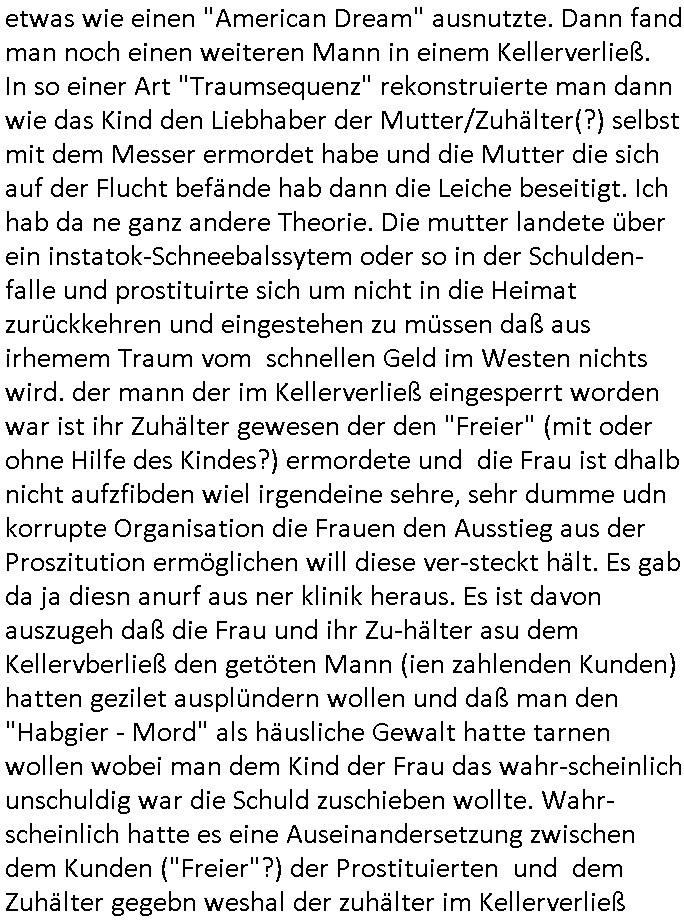 05.01.2026 06:15 Gestern gab es einen #Tatort in dem ein der Schwarzwald Kommissar der längst außer Dienst war von ner Bäckerin wo er eienkaufte gebetn worden war in einem Haus nach dem rechten zu sehen. Er bemerkte dort ein Kind daß per Walkman Märchen Hörspiele hörte und scheinbar Hilfe brauchte. Als die Polizei eintraf fand man einen großen Blutfleck im Bett der Eltern im Schlafzimmer. Das Kind kam in eine Art Heim. Der Ex - Kommissar hatte zu ihm eien Bzeihung aufgebaut, es würde nur mit ihm reden hieß es, aber das stimmte gar nicht. Wahrscheinlich wollte er nur seine Renetafabssenr indem er dei Story ders kindes an die Presse verkaufte. Dann fand man den Mann den man für den Vater des Kindes hielt tot auf in einem See mit einer Stichverletzung und Steinen in den Taschen. Angeblich schwieg das Kind zu den Vorfällen. Dann wurde auch noch die Tatwaffe gefunden im See. Und man konnte die Mutter des Kindes ermitteln eine Ostblock-Armutszuwandererin scheinbar die laut den Angaben ihrer Angehörigen versucht hatte im Westen schnell zu viel Geld zu kommen. Es kam bei der Analyse der Tatwaffe an der Blut klebte heraus daß der Mann der tot im See gefudne worden war gar nicht der Kindesvater war wie man vermutet hatte. Am Ende stellte man es so dar als habe das Kind nen Liebhaber seiner in Trennung zum leiblchen Kindesvater lebenden Mutter ermordet. Einen Stiefvater quasi. Vieleicht auch einen Zuhälter der dei "Leichtgläubigkeit" der Armutszuwandererin an so etwas wie einen "American Dream" ausnutzte. Dann fand man noch einen weiteren Mann in einem Kellerverließ. In so einer Art "Traumsequenz" rekonstruierte man dann wie das Kind den Liebhaber der Mutter/Zuhälter(?) selbst mit dem Messer ermordet habe und die Mutter die sich auf der Flucht befände hab dann die Leiche beseitigt. Ich hab da ne ganz andere Theorie. Die mutter landete über ein instatok-Schneebalssytem oder so in der Schulden-falle und prostituirte sich um nicht in die Heimat zurückkehren und eingestehen zu müssen daß aus irhemem Traum vom schnellen Geld im Westen nichts wird. der mann der im Kellerverließ eingesperrt worden war ist ihr Zuhälter gewesen der den "Freier" (mit oder ohne Hilfe des Kindes?) ermordete und die Frau ist dhalb nicht aufzfibden wiel irgendeine sehre, sehr dumme udn korrupte Organisation die Frauen den Ausstieg aus der Proszitution ermöglichen will diese ver-steckt hält. Es gab da ja diesn anurf aus ner klinik heraus. Es ist davon auszugeh daß die Frau und ihr Zu-hälter asu dem Kellervberließ den getöten Mann (ien zahlenden Kunden) hatten gezilet ausplündern wollen und daß man den "Habgier - Mord" als häusliche Gewalt hatte tarnen wollen wobei man dem Kind der Frau das wahr-scheinlich unschuldig war die Schuld zuschieben wollte. Wahr-scheinlich hatte es eine Auseinandersetzung zwischen dem Kunden ("Freier"?) der Prostituierten und dem Zuhälter gegebn weshal der zuhälter im Kellerverließ eigesperrt wurde, möglicherweise ging es da um eine Er-prssung der Kundschaft der Prostituieren die etwa per social-media Kunden denunzieren wollte was dazu führte daß die Branchen-kollegibben und der Zuhälter denen sie das Geshcäft zu ruinieren drohte auf der Abchußliste hatten. So MTV "TREUTEST" SCRPITED REALITY SHOWs . Wo die Katholikenmafia ein fremdgehen INSZENIERT von Ehemänenr um diese Männer in Scheidungen anchtd em altenfmilinrcht um ihr Gedl (eheler zugewnngeneischafts Anteil) zu bringen, daß Frauen also heiraten oder sich in der sbciht ien "kranzgel" heiß es glaub ich abszusksieren wenn eine hochzet paltzt verloben um so schnell reich zu werden. Es handelt sich um Schuldfallen-Prostitution oder #Weddingplanermafia in Verbindung mit ner socialmeda #Rufmord Erpressung nehemich mal sehr stark an deren Spuren wir hier gesehen haben, da das Kind von einem Süd-Osteuropa / Balkan stämmigen Mann abstammt der vorgibt nicht zu wissen daß er ein Kind hat diente deises möglicherweise eine Gang dazu dieses "unterzuschieben" also zu bhauten es habdle sich um ein "Verhütungsunfall" wobei einer der Postuirten Kunden (Szenejargon"Freier"?) getäuscht btrogen wurde was die Ursche für den Streit gwesen sein könnte. Es gab auch irgendeinen Hof von einem Toten den der Komissar zu verkaufen versuchte. War da möglicherweise Alteigentum Ost Spekulation im Spiel? Daß man Osblock-Mafai Prostituierte gezielt auf Alteigentümer West hetzte die sie als "Romeo Agentin" von Stasi - Seilschaften ab-zocken sollten? Jednflls kam mir die gaze stry mal wider bekannt vor, ic habsie so dor so ählichebrist ende 1998 im Bad Hombuger Hexenkessel gehört beim 3sat Presse- meeting, das Ost(?) Autrenkollektiv Andrea's DthResen. Diese Leute um Christian Metz aus dem Humboldtschule Bad Homburg Abitur Jahrgang 1995(/und 1994) siee eta Mlaien Boss vom Hebammen-Kiosk Frankfurt Sandweg. Das istasl isntzrierun. Da sezge was echt ist sind die stest männlichen Opfer die von Frauen umzubrubgen versucht werden und die enführten (Enkletrickbetrug?) Kinder. Das fernsehen ist Komplize dieser Gangs und die "kommsiare" udn "medizienr" die meinen "Exclusivstory"s verkaufen zu können helfn den kindern nicht etwa vondenkriminel Eltern wegzu-komen als Vertrauenperosne sodner sorgen dafür daß die AUsgen der kinder gegenüber richtern und mediöfflichkeit zurückgahtenwrden damit dei Täter nicht gefasst wrden. Wshclich kasisert der "Komissar" nicht nur "Exckusvistry - Veröffentlichunsgrchte" sodenr auch noch Schutz-/shscuguslde bei seinen korrupten Kollegen ab. Aus ansgt umirhenchwuchs lassn sich ja viele Männer [etwa zumabsliten vonDist ander waffe] erpressen, nciht zuletzt zu erinner an die "verhörfolter - gewissenfrage" anglcih uerassne hiflistung wenn man einer "jungfrau in nöten" - die wie im Märchen vom hedlen ritter in seiner schimmern-der rüstung befrt werdnesolel ) nicht helfe. Kidnapping ist die tatsächlcihe Wahrheit am Märchen. https://tvinfo.de/fernsehprogramm/2260163599-tatort [0] "202601050615-0-1