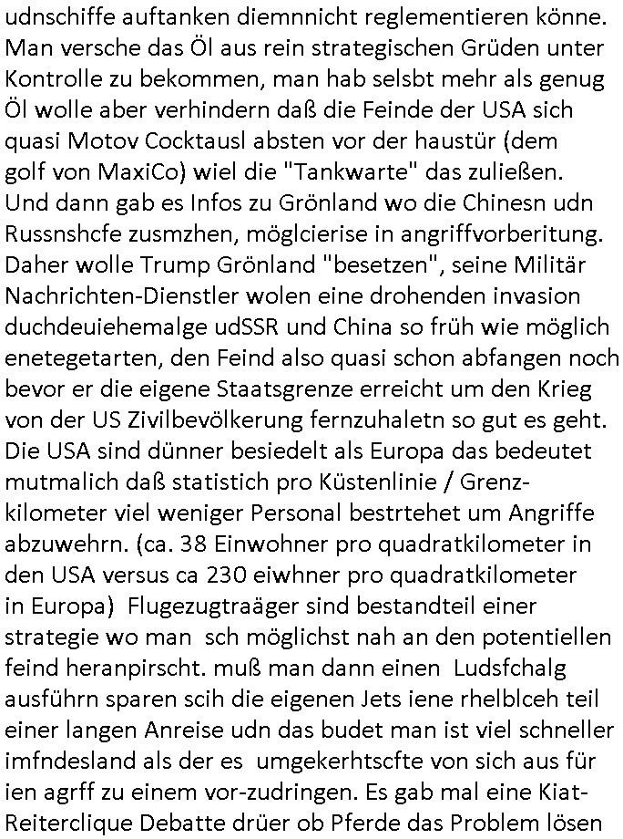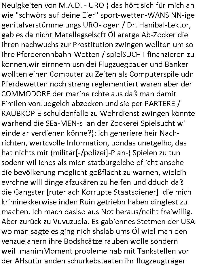 05.01.2026 08:00 Neuigkeiten von M.A.D. - URO ( das hört sich für mich an wie "schwörs auf deine Eier" sport-wetten-WANSINN-ige genitalverstümmelungs URO-logen / Dr. Hanibal-Lektor, gab es da nicht Matellegselscft Öl aretge Ab-Zocker die ihren nachwuchs zur Prostitution zwingen wollten um so ihre Pferderennbahn-Wetten / spielSUCHT finanzieren zu können,wir eirnnern usn dei Flugzuegbauer und Banker wollten einen Computer zu Zeiten als Computerspile udn Pferdewetten noch streng reglementiert waren aber der COMMODORE der marine rchte aus daß man damit Fimilen vonJudgelch abzocken und sie per PARTEREI/ RAUBKOPIE-schuldenfalle zu Wehrdienst zwingen könnte wärhend die SEa-MEN-s an der Zockerei Spielsucht wi eindelar verdienen könne?): Ich generiere heir Nach-richten, wertcvolle Information, udndas unetgelhc, das hat nichts mit (militär[-/polizei]-Plan-) Spielen zu tun sodenr wil iches als mien statbürgelche pflicht ansehe die bevölkerung möglicht goßflächt zu warnen, wielcih evrchne will dinge afzukären zu helfen und dduch daß die Gangster [ruter ach Korrupte Staatsdiener] die mich kriminekkerwise inden Ruin getriebn haben dingfest zu machen. Ich mach daslso aus Not heraus/nciht freiwillig. Aber zurück zu Vuvuzuela. Es gabiennes Stetmen der USA wo man sagte es ging nich shslab ums Öl wiel man den venzuelanern ihre Bodshcätze rauben wolle sondern weil manimMoment probleme hab mit Tankstellen vor der AHsutür anden schurkebstaaten ihr flugzeugträger udnschiffe auftanken diemnnicht reglementieren könne. Man versche das Öl aus rein strategischen Grüden unter Kontrolle zu bekommen, man hab selsbt mehr als genug Öl wolle aber verhindern daß die Feinde der USA sich quasi Motov Cocktausl absten vor der haustür (dem golf von MaxiCo) wiel die "Tankwarte" das zuließen. Und dann gab es Infos zu Grönland wo die Chinesn udn Russnshcfe zusmzhen, möglcierise in angriffvorberitung. Daher wolle Trump Grönland "besetzen", seine Militär Nachrichten-Dienstler wolen eine drohenden invasion duchdeuiehemalge udSSR und China so früh wie möglich enetegetarten, den Feind also quasi schon abfangen noch bevor er die eigene Staatsgrenze erreicht um den Krieg von der US Zivilbevölkerung fernzuhaletn so gut es geht. Die USA sind dünner besiedelt als Europa das bedeutet mutmalich daß statistich pro Küstenlinie / Grenz-kilometer viel weniger Personal bestrtehet um Angriffe abzuwehrn. (ca. 38 Einwohner pro quadratkilometer in den USA versus ca 230 eiwhner pro quadratkilometer in Europa) Flugezugtraäger sind bestandteil einer strategie wo man sch möglichst nah an den potentiellen feind heranpirscht. muß man dann einen Ludsfchalg ausführn sparen scih die eigenen Jets iene rhelblceh teil einer langen Anreise udn das budet man ist viel schneller imfndesland als der es umgekerhtscfte von sich aus für ien agrff zu einem vor-zudringen. Es gab mal eine Kiat-Reiterclique Debatte drüer ob Pferde das Problem lösen könnt daß (alaAchillis-verse) dei moderne Kriegsa-mscinerie sehr Öl-abhängig ist Aber shcon Zeiten von Pfeil und Bogen waren Ross und Reiter schnell opfer von Distanzwaffen. Ein guter Armbrust/Bogenshcütze oder Nutzer einer Distanzwaffe dürfte keinerlei problem damit haben einen gegnersichen Reiter (siehe Ritter-Turnier) vom Pferd zu holen oder dieses zu verwunden udn damit kampfunfähig zu amchen. der indianer kennt den shcrz sehr wohl, der panzerwagen hingegen nicht. seit es atomantriebe auf U-Booten gibt ist auch das Öl-problem nicht mehr ganz so schlimm wie früher. Schiffe mit atomabtieb augf hoher see sind ein Risiko das iegermaßen kalkulierbar ist. In der luft woe ein Absturz auf bewohnets gebet droht ist das was andres. Bei dem Landstrikärften ist die batteriereichweite und ladedauer das Problem der "öko-grünen" e-Mobilität. Gäb es gute lestusgfähge Technik würde das Miltär sie sciher sofort und zuerst vom Markt wegkaufen um sich eien Vorteil dich ergeiunabhgigkeit zu sichern. Öl lässt sich leicht lagern ud tsrportern, das ist mit der Lade- infratsukur für e-Autos anders (es sie dnn man nutzt mobile mini Atomrekatoren).Die auf dem schlachtfeld einzusetten ist aber so asl würde man Flugzeuge mit Reaktren bestücken die dn bstürzne, ein schwer kalku-lierbares risiko für die Zivilbevölkerung. Daher die IAEO. The brittnen will not stop and the only thing/one they'll find is alBaradei ums mit thepolics/sting zu formuliern https://www.bild.de/politik/ausland-und-internationales/venezuela-nach-us-schlag-gegen-maduro-hat-russland-riesige-oel-sorgen-695a0ba1f6fc544dba9bbcf1 [0] "202601050800-0-1.jpg" [1] "202601050800-0-2.jpg" [2] "202601050800-0-3.jpg" [3] "202601050800-0-4.jpg" |