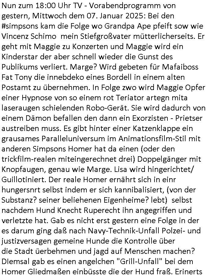 Nun zum 18:00 Uhr TV - Vorabendprogramm von gestern, Mittwoch dem 07. Januar 2025: Bei den #simpsons kam die Folge wo Grandpa Ape pfeift sow wie Vincenz Schimo mein Stiefgroßvater mütterlicherseits. Er geht mit Maggie zu Konzerten und Maggie wird ein Kinderstar der aber schnell wieder die Gunst des Publikums verliert. Marge? Wird gebeten für Mafaiboss Fat Tony die innebdeko eines Bordell in einem alten Postamt zu übernehmen. In Folge zwo wird Maggie Opfer einer Hypnose von so einem rot Teriator artegn mita laseraugen schielenden Robo-Gerät. Sie wird dadurch von einem Dämon befallen den dann ein Exorzisten - Prietser austreiben muss. Es gibt hinter einer Katzenklappe ein grausames Paralleluniversum im Animationsfilm-Stil mit anderen Simpsons Homer hat da einen (oder den trickfilm-realen miteingerechnet drei) Doppelgänger mit Knopfaugen, genau wie Marge. Lisa wird hingerichtet/ Guillotiniert. Der reale Homer ernährt sich in einr hungersnrt selbst indem er sich kannibalisiert, (von der Substanz? seiner beliehenen Eigenheime? lebt) selbst nachdem Hund Knecht Ruperecht ihn angegriffen und verletzte hat. Gab es nicht erst gestern eine Folge in der es darum ging daß nach Navy-Technik-Unfall Polzei- und justizversagen gemeine Hunde die Kontrolle über die Stadt üerbehmen und jagd auf Menschen machen? DIemsal gab es einen angelchen "Grill-Unfall" bei dem Homer Gliedmaßen einbüsste die der Hund fraß. Erinerts