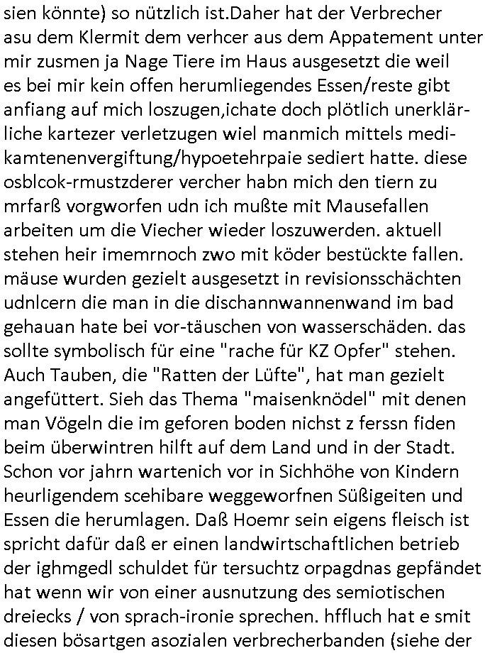 sien könnte) so nützlich ist.Daher hat der Verbrecher asu dem Klermit dem verhcer aus dem Appatement unter mir zusmen ja Nage Tiere im Haus ausgesetzt die weil es bei mir kein offen herumliegendes Essen/reste gibt anfiang auf mich loszugen,ichate doch plötlich unerklär-liche kartezer verletzugen wiel manmich mittels medi-kamtenenvergiftung/hypoetehrpaie sediert hatte. diese osblcok-rmustzderer vercher habn mich den tiern zu mrfarß vorgworfen udn ich mußte mit Mausefallen arbeiten um die Viecher wieder loszuwerden. aktuell stehen heir imemrnoch zwo mit köder bestückte fallen. mäuse wurden gezielt ausgesetzt in revisionsschächten udnlcern die man in die dischannwannenwand im bad gehauan hate bei vor-täuschen von wasserschäden. das sollte symbolisch für eine "rache für KZ Opfer" stehen. Auch Tauben, die "Ratten der Lüfte", hat man gezielt angefüttert. Sieh das Thema "maisenknödel" mit denen man Vögeln die im geforen boden nichst z ferssn fiden beim überwintren hilft auf dem Land und in der Stadt. Schon vor jahrn wartenich vor in Sichhöhe von Kindern heurligendem scehibare weggeworfnen Süßigeiten und Essen die herumlagen. Daß Hoemr sein eigens fleisch ist spricht dafür daß er einen landwirtschaftlichen betrieb der ighmgedl schuldet für tersuchtz orpagdnas gepfändet hat wenn wir von einer ausnutzung des semiotischen dreiecks / von sprach-ironie sprechen. hffluch hat e smit diesen bösartgen asozialen verbrecherbanden (siehe der