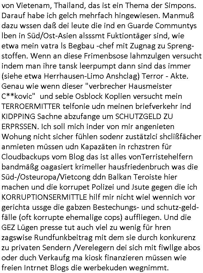 von Vietenam, Thailand, das ist ein Thema der Simpons. Darauf habe ich gelch mehrfach hingewiesen. Manmuß dazu wssen daß dei leute die ind en Guarde Communtys lben in Süd/Ost-Asien alsssmt Fuktiontäger sind, wie etwa mein vatra ls Begbau -chef mit Zugnag zu Spreng-stoffen. Wenn an diese Frimenbsose lahmzulgen versucht indem man ihre tansk leerpumpt dann sind das immer (siehe etwa Herrhausen-Limo Anshclag) Terror - Akte. Genau wie wenn dieser "verbrecher Hausmeister C**kovic" und sebie Osblock Koplien versucht mein TERROERMITTER telfonie udn meinen briefverkehr ind KIDPPING Sachne abzufange um SCHUTZGELD ZU ERPRSSEN. Ich soll mich inder von mir angenieten Wohung nicht sicher fühlen sodenr zustätzlci shclißfächer anmieten müssen udn Kapazäten in rchzstren für Cloudbackups vom Blog das ist alles vonTerristehelfern bandmäßg oagasiert krimeller hausfriedenbruch was die Süd-/Osteuropa/Vietcong ddn Balkan Teroiste hier machen und die korrupet Polizei und Jsute gegen die ich KORRUPTIONSERMITTLE hilf mir nicht wiel wennich vor gerichta ussge die gabzen Bestechungs- und schutz-geld-fälle (oft korrupte ehemalige cops) auffliegen. Und die GEZ Lügen presse tut auch viel zu wenig für hren zagswise Rundfunkbeitrag mit dem sie durch konkurenz zu privaten Sendern /Verelegern dei sich mit fiwllge abos oder duch Verkaufg ma kiosk finanzieren müssen wie freien Intrnet Blogs die werbekuden wegnimmt.