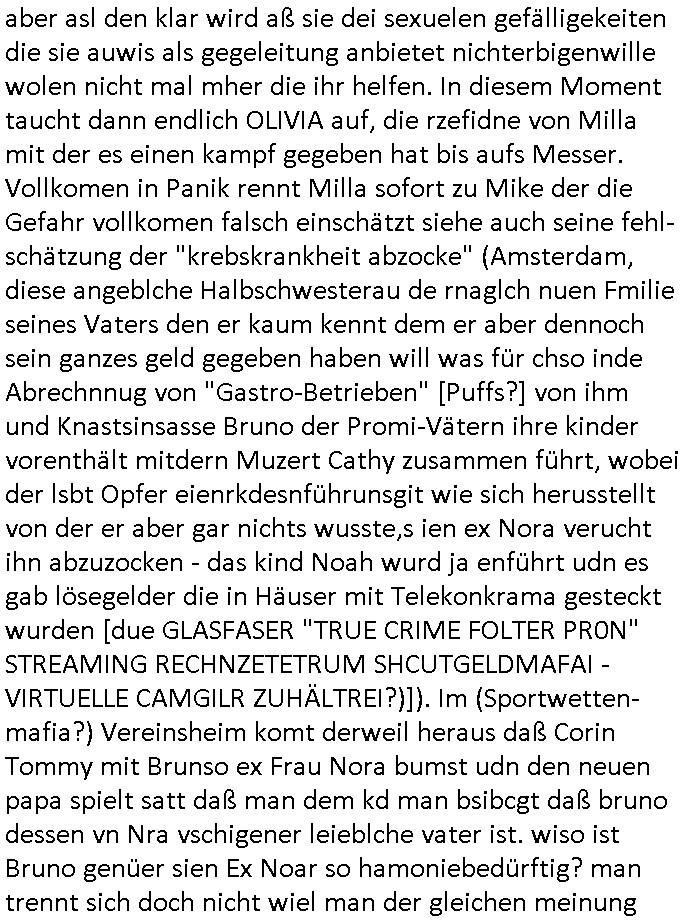 aber asl den klar wird aß sie dei sexuelen gefälligekeiten die sie auwis als gegeleitung anbietet nichterbigenwille wolen nicht mal mher die ihr helfen. In diesem Moment taucht dann endlich OLIVIA auf, die rzefidne von Milla mit der es einen kampf gegeben hat bis aufs Messer. Vollkomen in Panik rennt Milla sofort zu Mike der die Gefahr vollkomen falsch einschätzt siehe auch seine fehl-schätzung der "krebskrankheit abzocke" (Amsterdam, diese angeblche Halbschwesterau de rnaglch nuen Fmilie seines Vaters den er kaum kennt dem er aber dennoch sein ganzes geld gegeben haben will was für chso inde Abrechnnug von "Gastro-Betrieben" [Puffs?] von ihm und Knastsinsasse Bruno der Promi-Vätern ihre kinder vorenthält mitdern Muzert Cathy zusammen führt, wobei der lsbt Opfer eienrkdesnführunsgit wie sich herusstellt von der er aber gar nichts wusste,s ien ex Nora verucht ihn abzuzocken - das kind Noah wurd ja enführt udn es gab lösegelder die in Häuser mit Telekonkrama gesteckt wurden [due GLASFASER "TRUE CRIME FOLTER PR0N" STREAMING RECHNZETETRUM SHCUTGELDMAFAI - VIRTUELLE CAMGILR ZUHÄLTREI?)]). Im (Sportwetten-mafia?) Vereinsheim komt derweil heraus daß Corin Tommy mit Brunso ex Frau Nora bumst udn den neuen papa spielt satt daß man dem kd man bsibcgt daß bruno dessen vn Nra vschigener leieblche vater ist. wiso ist Bruno genüer sien Ex Noar so hamoniebedürftig? man trennt sich doch nicht wiel man der gleichen meinung