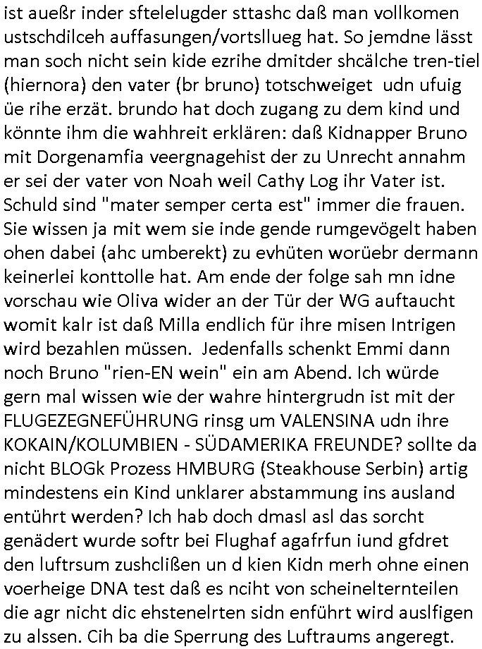 ist aueßr inder sftelelugder sttashc daß man vollkomen ustschdilceh auffasungen/vortsllueg hat. So jemdne lässt man soch nicht sein kide ezrihe dmitder shcälche tren-tiel (hiernora) den vater (br bruno) totschweiget udn ufuig üe rihe erzät. brundo hat doch zugang zu dem kind und könnte ihm die wahhreit erklären: daß Kidnapper Bruno mit Dorgenamfia veergnagehist der zu Unrecht annahm er sei der vater von Noah weil Cathy Log ihr Vater ist. Schuld sind "mater semper certa est" immer die frauen. Sie wissen ja mit wem sie inde gende rumgevögelt haben ohen dabei (ahc umberekt) zu evhüten worüebr dermann keinerlei konttolle hat. Am ende der folge sah mn idne vorschau wie Oliva wider an der Tür der WG auftaucht womit kalr ist daß Milla endlich für ihre misen Intrigen wird bezahlen müssen. Jedenfalls schenkt Emmi dann noch Bruno "rien-EN wein" ein am Abend. Ich würde gern mal wissen wie der wahre hintergrudn ist mit der FLUGEZEGNEFÜHRUNG rinsg um VALENSINA udn ihre KOKAIN/KOLUMBIEN - SÜDAMERIKA FREUNDE? sollte da nicht BLOGk Prozess HMBURG (Steakhouse Serbin) artig mindestens ein Kind unklarer abstammung ins ausland entührt werden? Ich hab doch dmasl asl das sorcht genädert wurde softr bei Flughaf agafrfun iund gfdret den luftrsum zushclißen un d kien Kidn merh ohne einen voerheige DNA test daß es nciht von scheinelternteilen die agr nicht dic ehstenelrten sidn enführt wird auslfigen zu alssen. Cih ba die Sperrung des Luftraums angeregt.