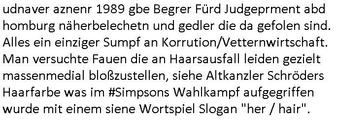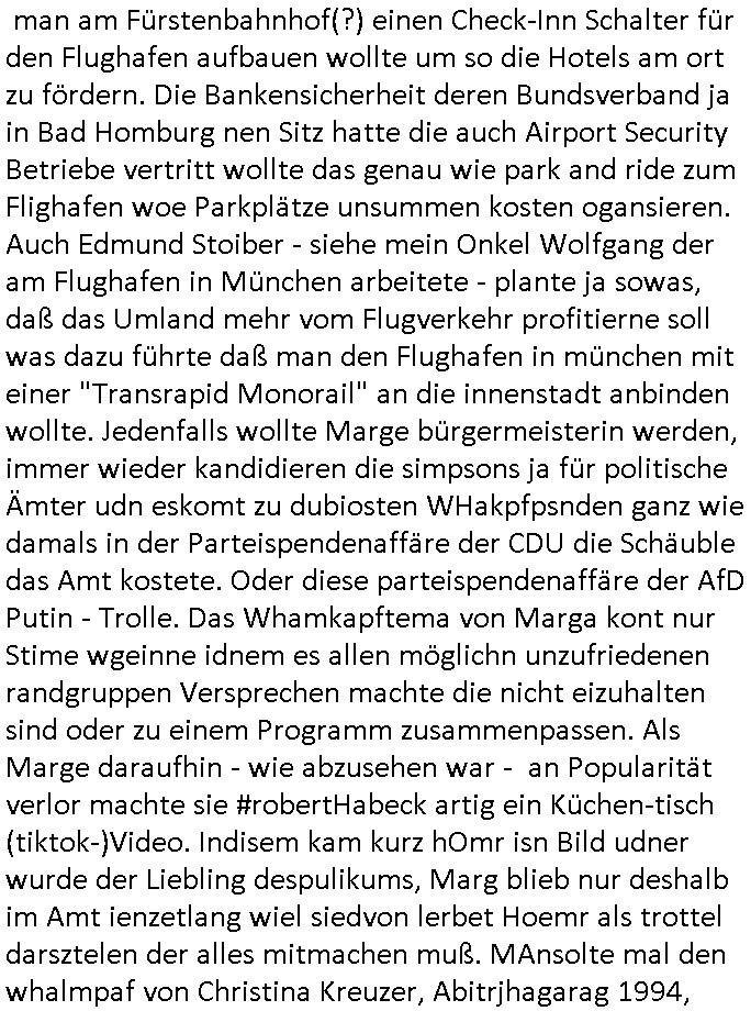 09.01.2026 00:30 Nun zum 18:00 Uhr TV - Vorabendprogramm von gestern, Donnerstag den 08. Januar 2026. Bei den #simpsons hatte Grandpa Geburtstag es gab einen Besuch im Planetarium. Es kam heraus daß Rektor Skinner sich als Marschmusik - Kapell - Leiter beworben hatte und angnommen worden war be einer (Elite?-) Uni seine Mutter ihm das aber ver-heimlicht hatte. Lisa hatte geschummelt bei ner Referats Arbeit und träumte davon daß ihres Fehlers wegen der im Wahlkampf auffliegen werde "PRÄSIDENT Kenny HITLER" an die Macht käme. Erinnert sich noch jemand an meine letztmalige öfters wiederholte Erwähnung dieser Roman Verfilmung "Fatherland" von "Robert(?) Harris"? Dann ging es um Wahlkampf mit dem TRANSRAPID, pardon, der Monorail, einer verunglückten Einschienenbahn, in Hcian fährt der trasapind ja erfolgrch und am Fluighafen in Frankfurt a. M. fährt eine volllkomen Lok-Führer-lose Bahn die Verkhrsregulatrosche einen Dambruch darstellt. Personenbeförderung ohne Fachpersoanl wie Schaffner. Autonomes "KI-gesteuertes" fahren ist ja wie das E-Auto immer wieder Thema in der #Simpons TV-Cartoon-Serie. Ich hab mal daraf hingewiesn daß in den 1950ern/60ern vor der Tschernobyl Katastrophe viel hoffnug in Atom - strom betriebene Mobiltät gestckt wurde und man nicht so technikfeindlich war wie seitdem es Greenpeace gibt. Daher erdachte ich auch die Soap "#theBigBangTheory". Es gab tatsächlich mal Wahlkampf in Bad Homburg wo man am Fürstenbahnhof(?) einen Check-Inn Schalter für den Flughafen aufbauen wollte um so die Hotels am ort zu fördern. Die Bankensicherheit deren Bundsverband ja in Bad Homburg nen Sitz hatte die auch Airport Security Betriebe vertritt wollte das genau wie park and ride zum Flighafen woe Parkplätze unsummen kosten ogansieren. Auch Edmund Stoiber - siehe mein Onkel Wolfgang der am Flughafen in München arbeitete - plante ja sowas, daß das Umland mehr vom Flugverkehr profitierne soll was dazu führte daß man den Flughafen in münchen mit einer "Transrapid Monorail" an die innenstadt anbinden wollte. Jedenfalls wollte Marge bürgermeisterin werden, immer wieder kandidieren die simpsons ja für politische Ämter udn eskomt zu dubiosten WHakpfpsnden ganz wie damals in der Parteispendenaffäre der CDU die Schäuble das Amt kostete. Oder diese parteispendenaffäre der AfD Putin - Trolle. Das Whamkapftema von Marga kont nur Stime wgeinne idnem es allen möglichn unzufriedenen randgruppen Versprechen machte die nicht eizuhalten sind oder zu einem Programm zusammenpassen. Als Marge daraufhin - wie abzusehen war - an Popularität verlor machte sie #robertHabeck artig ein Küchen-tisch (tiktok-)Video. Indisem kam kurz hOmr isn Bild udner wurde der Liebling despulikums, Marg blieb nur deshalb im Amt ienzetlang wiel siedvon lerbet Hoemr als trottel darsztelen der alles mitmachen muß. MAnsolte mal den whalmpaf von Christina Kreuzer, Abitrjhagarag 1994, udnaver aznenr 1989 gbe Begrer Fürd Judgeprment abd homburg näherbelechetn und gedler die da gefolen sind. Alles ein einziger Sumpf an Korrution/Vetternwirtschaft. Man versuchte Fauen die an Haarsausfall leiden gezielt massenmedial bloßzustellen, siehe Altkanzler Schröders Haarfarbe was im #Simpsons Wahlkampf aufgegriffen wurde mit einem siene Wortspiel Slogan "her / hair". https://tvinfo.de/fernsehprogramm/2278898438-die-simpsons https://tvinfo.de/fernsehprogramm/2278898444-die-simpsons [0] "202601090030-0-1.jpg" [1] "202601090030-0-2.jpg" [2] "202601090030-0-3.jpg" |