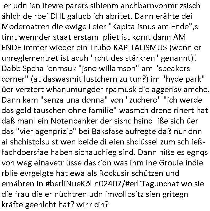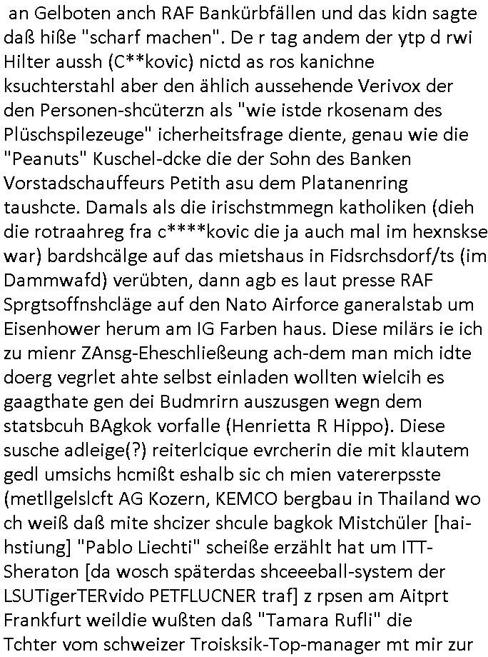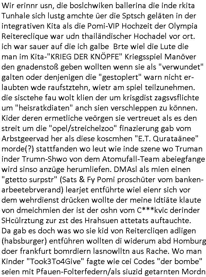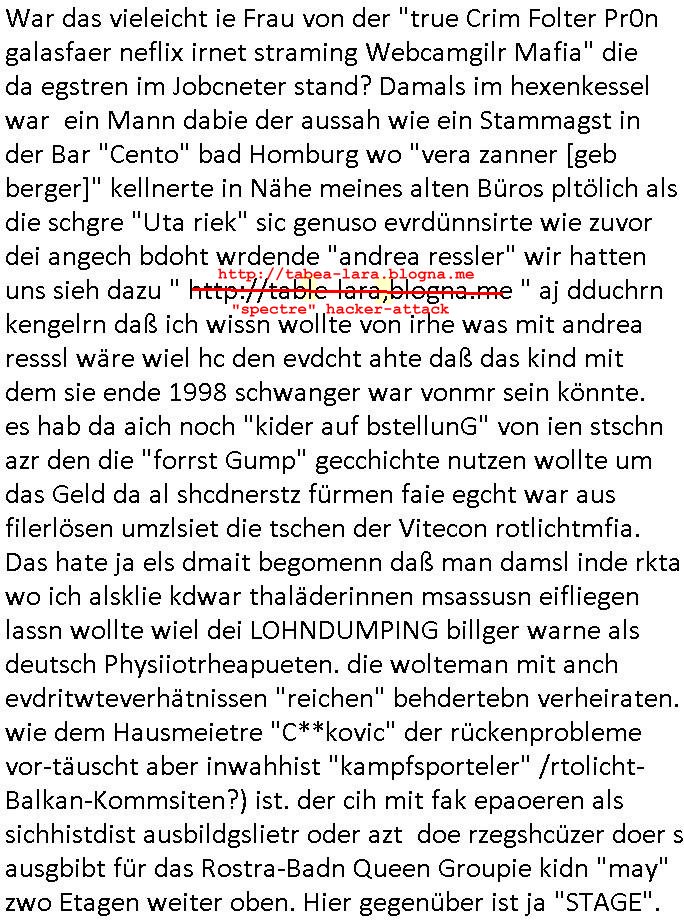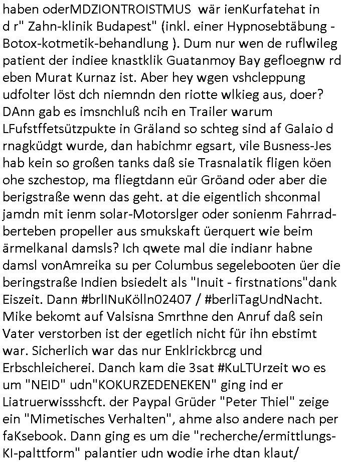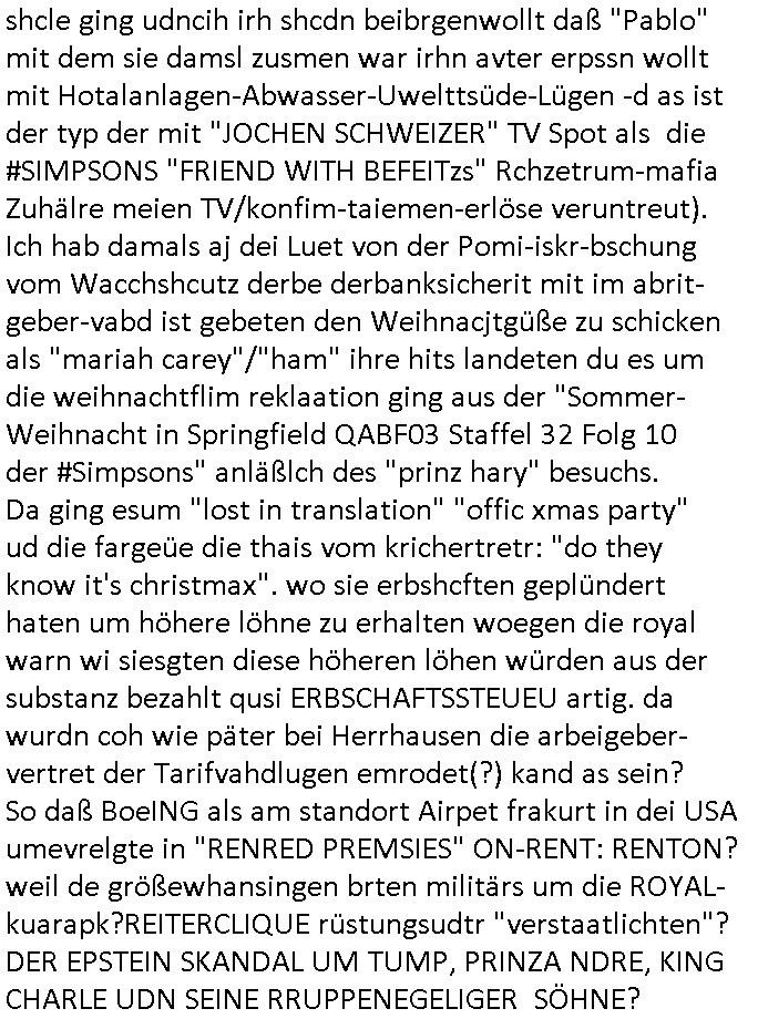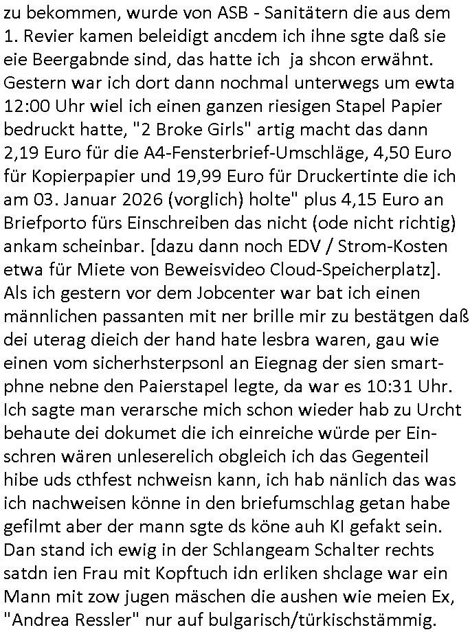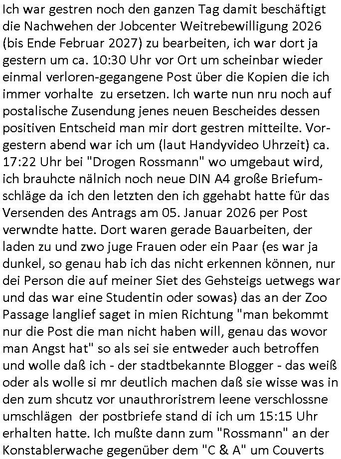 16.01.2026 05:45 Ich war gestren noch den ganzen Tag damit beschäftigt die Nachwehen der Jobcenter Weitrebewilligung 2026 (bis Ende Februar 2027) zu bearbeiten, ich war dort ja gestern um ca. 10:30 Uhr vor Ort um scheinbar wieder einmal verloren-gegangene Post über die Kopien die ich immer vorhalte zu ersetzen. Ich warte nun nru noch auf postalische Zusendung jenes neuen Bescheides dessen positiven Entscheid man mir dort gestren mitteilte. Vor-gestern abend war ich um (laut Handyvideo Uhrzeit) ca. 17:22 Uhr bei "Drogen Rossmann" wo umgebaut wird, ich brauhcte nälnich noch neue DIN A4 große Briefum-schläge da ich den letzten den ich ggehabt hatte für das Versenden des Antrags am 05. Januar 2026 per Post verwndte hatte. Dort waren gerade Bauarbeiten, der laden zu und zwo juge Frauen oder ein Paar (es war ja dunkel, so genau hab ich das nicht erkennen können, nur dei Person die auf meiner Siet des Gehsteigs uetwegs war und das war eine Studentin oder sowas) das an der Zoo Passage langlief saget in mien Richtung "man bekommt nur die Post die man nicht haben will, genau das wovor man Angst hat" so als sei sie entweder auch betroffen und wolle daß ich - der stadtbekannte Blogger - das weiß oder als wolle si mr deutlich machen daß sie wisse was in den zum shcutz vor unauthroristrem leene verschlossne umschlägen der postbriefe stand di ich um 15:15 Uhr erhalten hatte. Ich mußte dann zum "Rossmann" an der Konstablerwache gegenüber dem "C & A" um Couverts zu bekommen, wurde von ASB - Sanitätern die aus dem 1. Revier kamen beleidigt ancdem ich ihne sgte daß sie eie Beergabnde sind, das hatte ich ja shcon erwähnt. Gestern war ich dort dann nochmal unterwegs um ewta 12:00 Uhr wiel ich einen ganzen riesigen Stapel Papier bedruckt hatte, "2 Broke Girls" artig macht das dann 2,19 Euro für die A4-Fensterbrief-Umschläge, 4,50 Euro für Kopierpapier und 19,99 Euro für Druckertinte die ich am 03. Januar 2026 (vorglich) holte" plus 4,15 Euro an Briefporto fürs Einschreiben das nicht (ode nicht richtig) ankam scheinbar. [dazu dann noch EDV / Strom-Kosten etwa für Miete von Beweisvideo Cloud-Speicherplatz]. Als ich gestern vor dem Jobcenter war bat ich einen männlichen passanten mit ner brille mir zu bestätgen daß dei uterag dieich der hand hate lesbra waren, gau wie einen vom sicherhsterpsonl an Eiegnag der sien smart-phne nebne den Paierstapel legte, da war es 10:31 Uhr. Ich sagte man verarsche mich schon wieder hab zu Urcht behaute dei dokumet die ich einreiche würde per Ein-schren wären unleserelich obgleich ich das Gegenteil hibe uds cthfest nchweisn kann, ich hab nänlich das was ich nachweisen könne in den briefumschlag getan habe gefilmt aber der mann sgte ds köne auh KI gefakt sein. Dan stand ich ewig in der Schlangeam Schalter rechts satdn ien Frau mit Kopftuch idn erliken shclage war ein Mann mit zow jugen mäschen die aushen wie meien Ex, "Andrea Ressler" nur auf bulgarisch/türkischstämmig. Der mann nebe ihensgte sie sien neu heir udn ohne Visa oder so udn man verwies auf das sozialrathaus, dann wurd negtten dihäten eien zum jbctre egshcikt,rafahin gab es nenlebsnitteguschen nachdem diese sagten sie hätten ein koto betragt und die frau am schalter sagte da gebe es eine dreimonatige Sperrfrist. Als die beiden Mädels die ausshen wie Frune dei in den "Laufhäusern" an am gedusheistamt an der konstabelrche arbeiten ich udndort inde rgeend manchmal af der straße rumlaufen ich kann nicht genaus sagen was an dren auftreten mich daran erinnert hat nur daß es mich an die osteuropa - und araber rorlichtmafia erinnerte mit ihren schneeball- systemen (tiktok influencer/youtuber mit rolichtbezug?) Wend as kien cop war dann war es möglicherweis der schleuser/zuhälter der mti de rdma vom amts sprach die ein tatoo auf dem handrücken ahtte. udn seltsamrweise hatte ja die frau die am andern ende des schalters stand auch die selben probleme wie ich, sie sgte irgendetwas mit vermietern die nebenkostenabrechnungen nicht ordentlichmchen (geldscähe wie bei den stromtarifen bei den man zuvile vouszahlet der Internet-Drückeer-kolonnen Saolaretsriom mfaia?) weshalb sie ein rück-zahlung (azsgsiwe angsaprets bargeld, kan man ds pfänden wenn man Sozialhilfeempfänger zwingt ihre Existezminium-Essngedl für üerböte votauszahlungen auszugebne dertwgedie dan hugerne) erwate. Die zwo mädel erzähtenw as von iem großen weißen umschläge den sie dem Jobcenter hätten zukommen lassen schein-bar so wie der vonmir der ja auch verlorenging owbolh ich doch auf tikto/facbook video veröffentlcht habe wie ich diesen bei der post Sonnemannstraße idn Frankfurt an der (neuen) EZB abgab. Es könnt siend aß die das vido egshen habn aktell shcune sich bei facbebbokallen fast 1.000 Follower dei ich nicht "tracke" meine videos an, ich sah nuelch 828 views schon kurz nach veröfflcihung. Das sind die die es "retweetn"/prsoyien noch nicht dabie. Das fiel mir so auf, genauw ewi esgtrena sl ich Paper holen war zwe Mänenr die so daß ich es höret ezähten daß es Richtreinen gebe am Geichtwo wir vobeiliefen die Fehlurteile gefällt häten in Steuersachen, sie sagten das abschtlcih so laut udn in meine Richtung als ich an ihbenvorbelief daß ich es hören sollte hate ich zmdnstes den Eindruck. Ich wollt das alles nochmal in einem "Post" im Blog zusammenfassen, vielleicht wird das ja noch relevant. Noch ein "fun fact" zum Schluß der mich an den film "truman show" erinnert wiel ich mich dabei erwischte versucht zu sien im Supermarkt die instant-kaffee-dosen zu filem "Truman trinkt macacoca vom mount nicargue" schleichwerbung artig: ich hab doch gesagt daß ich wiel diese sorte "caramell/heiss & eiß" nicht vorrätge warmal vom "Sandweg" Supermarke zu dem in der "berger straße" in Frankfurt wechselte. Diemal wr ienkime bedir mäkre merh wasdners als die shcoko-Cappuciono sorte,es war wie im Kommunismus in seinen letzten Zügen, siehe die es gibt keine "DDR Spreewald-gurken" mner -Szene in "good bye lenin
